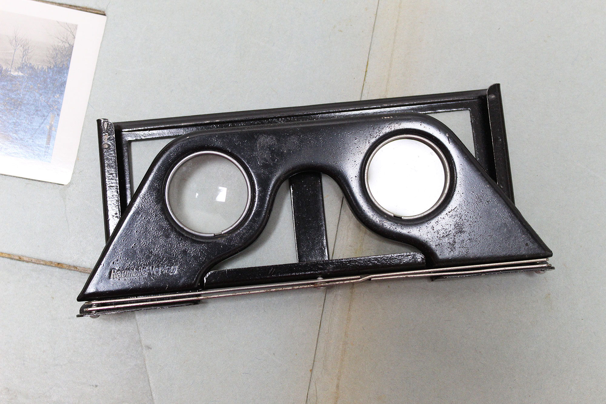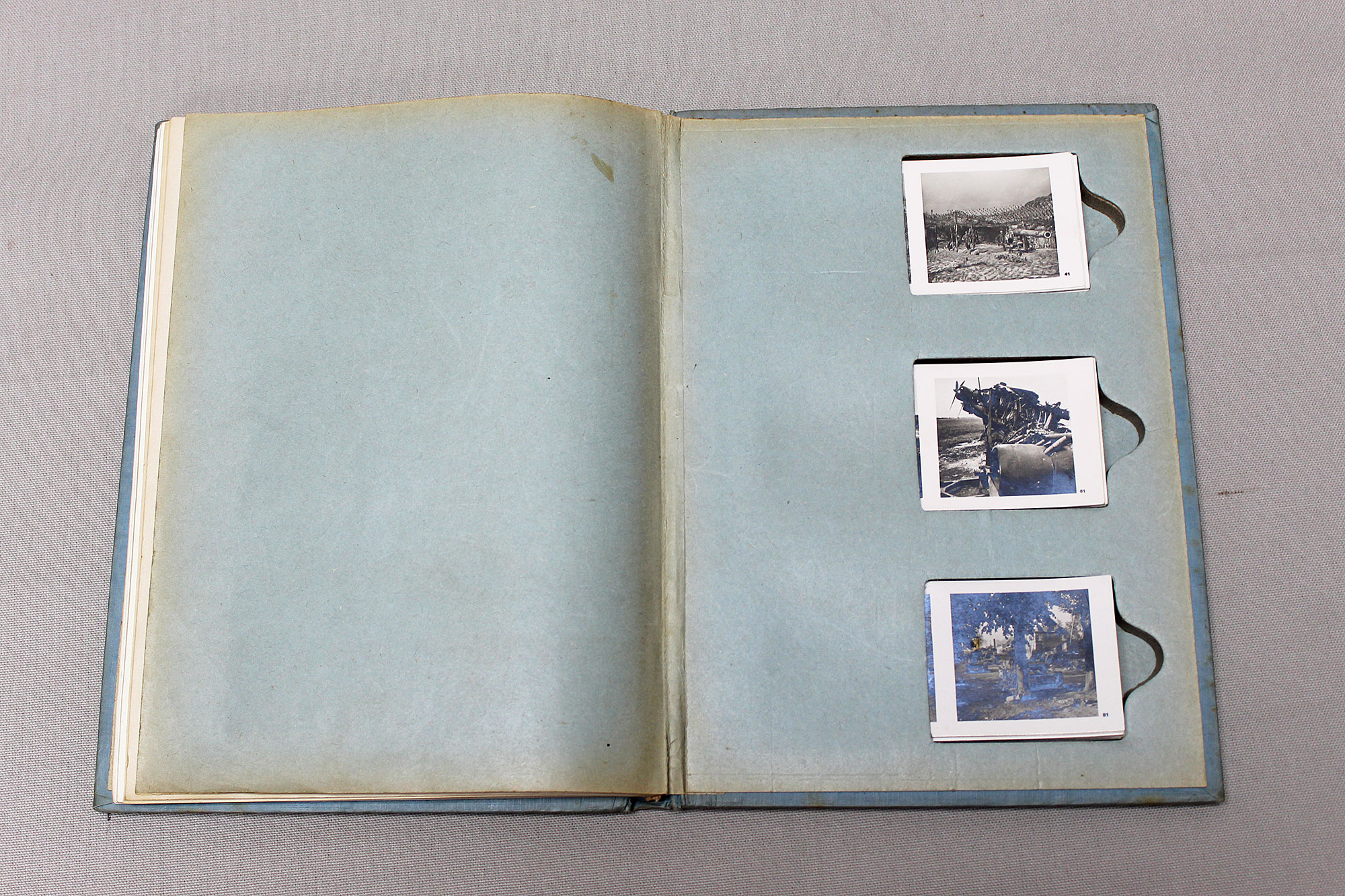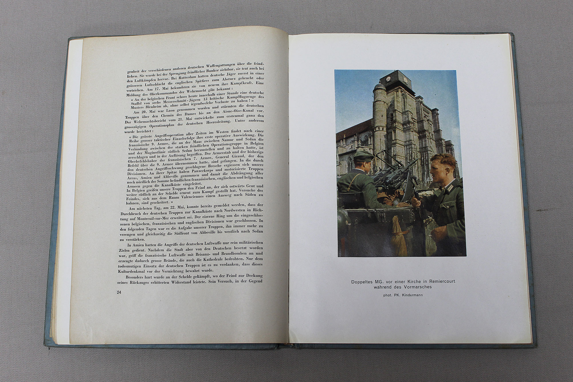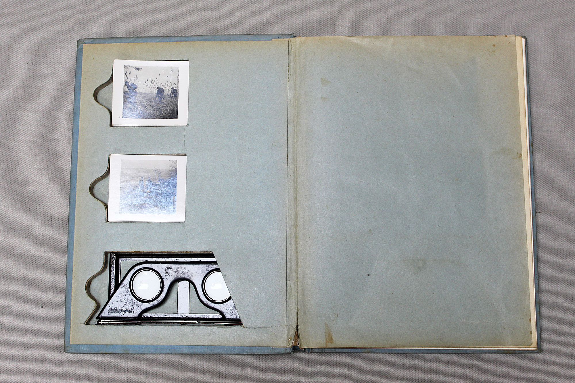 WW2 German Der Kampf im Westen Stereo View Book. This book is a pictorial reference printed in 1940, it does feature some marks, stains, and wear due to the age, however, is in otherwise decent used and worn condition. Approximately 77 pages, the binding is worn, however decent shape and the book has a beveled, fabric-covered wood construction. Comes with original contents: approximately 100 Stereo-View Images and Stereo-View Glasses. Features inside storage compartments cut to size to store the photos and stereo viewer. The photos both inside the book, as well as the stereo-view images depict what was the daily life of the men and machines of the Army. Some wear, staining and marks due to the age.