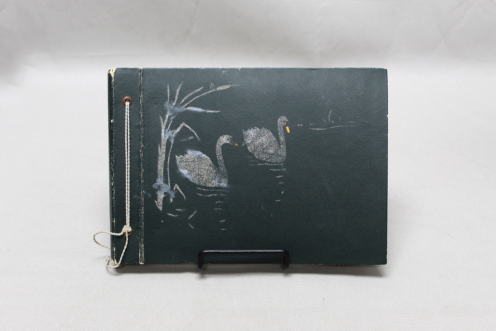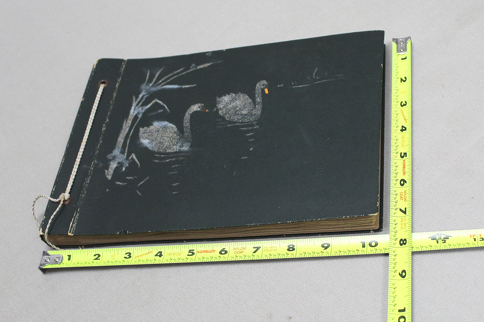 WW2 German Luftwaffe Photo Album. Two swans drawn on front of photo album. Several pictures in album, however, there are a lot of blank pages. Size of Album approximately 10 1/4 inches x 7 1/4 inches. Worn condition.
