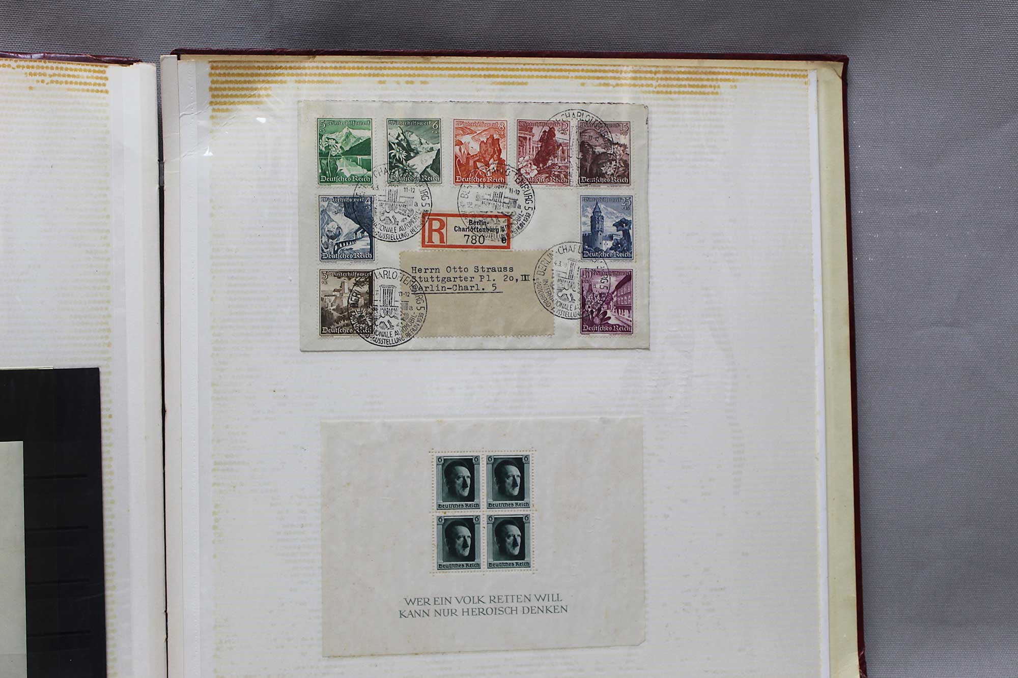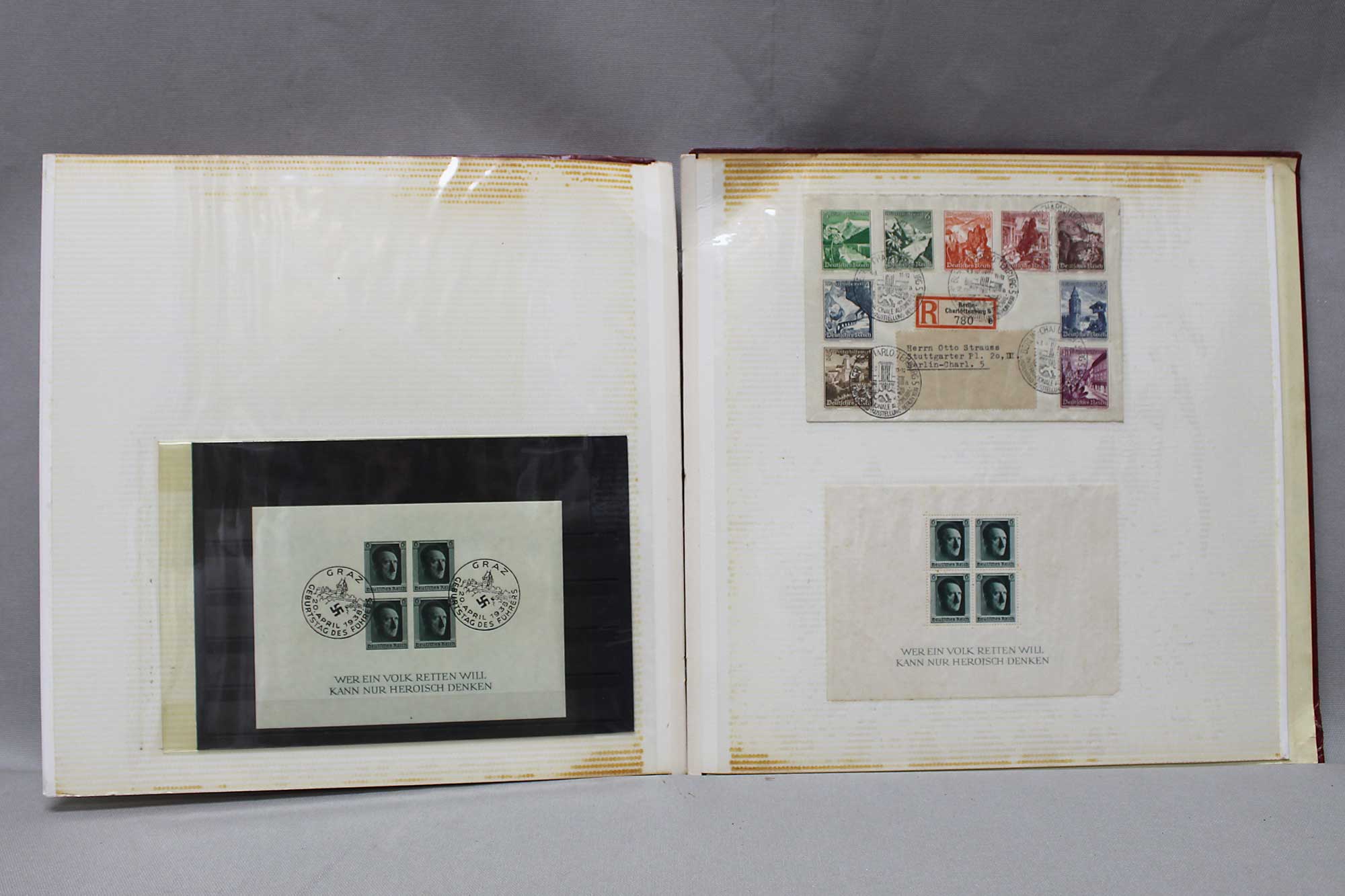 Modern Photo Album filled with miscellaneous ww2 German picture cards, envelopes, and stamps. Album contains about 27 ww2 German paper printed picture cards that you see to use to stick in picture albums, 6 ww2 German envelopes with stamps, 2 ww2 stamps type unused, group of misc group of used ww2 German stamps. Worn condition.