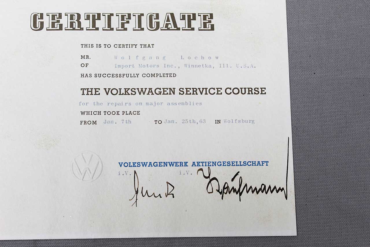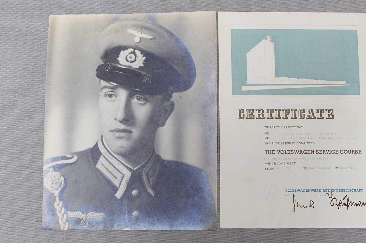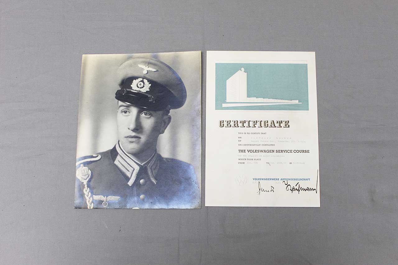 WW2 German Soldier Portrait Photo with VW Certificate. The VW Certificate is dated Jan 25, 1963 and issued in Winnetka Illinois USA. These two came together so left them together, however, I do not have anything to tie them together. Size approximately 11 1/2 inches x 9 inches. Worn condition.