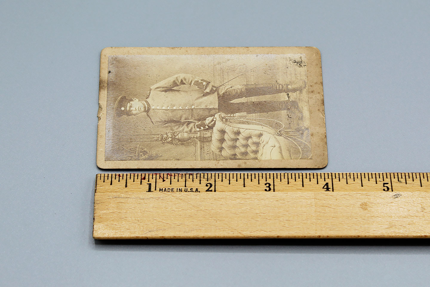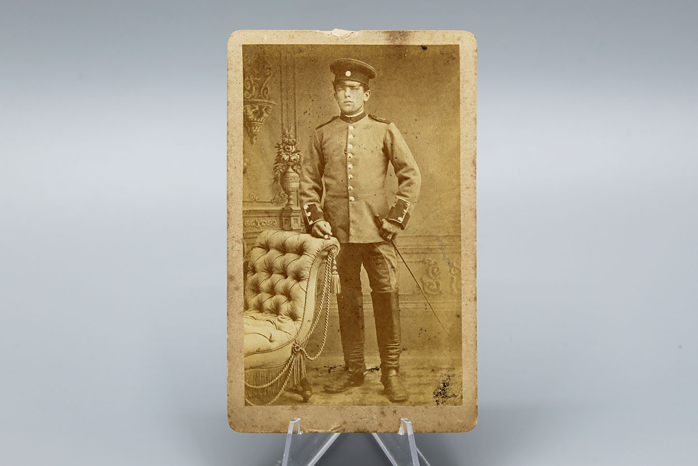 Imperial German soldier small cabinet card. Soldier in uniform w/sword. Size approximately 2 1/2 inches X 4 inches. Used and worn condition.