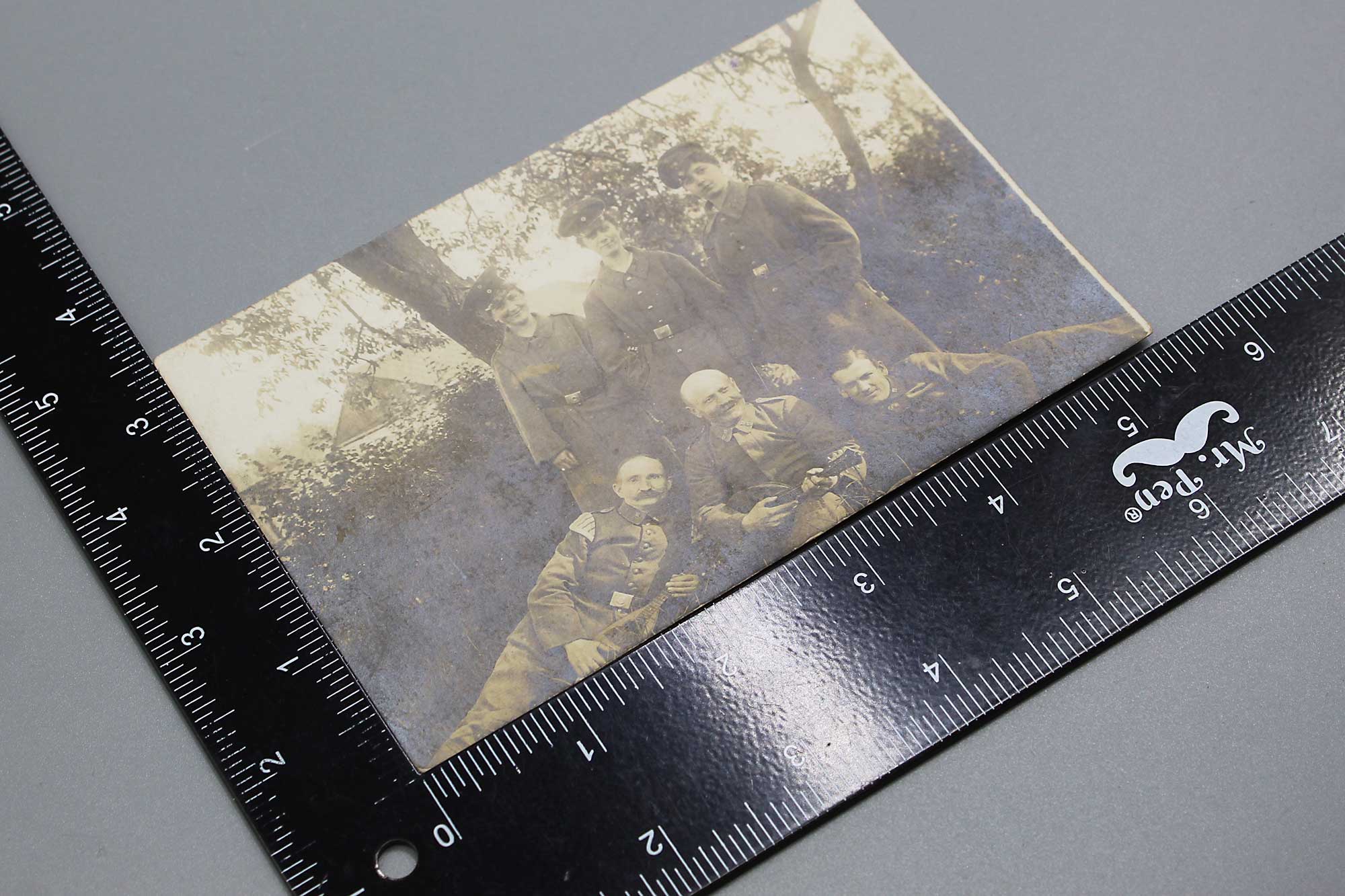 Imperial German Soldiers Photo Postcard with women dressed in uniform. Size approximately 5 1/2 inches x 3 1/2 inches. Heavily worn condition.