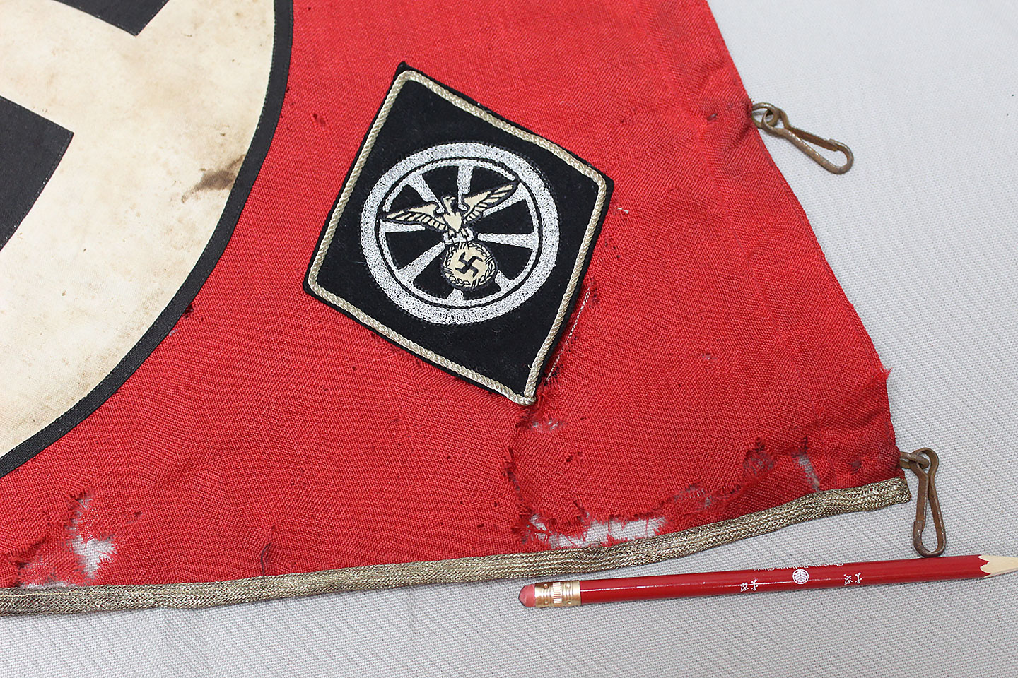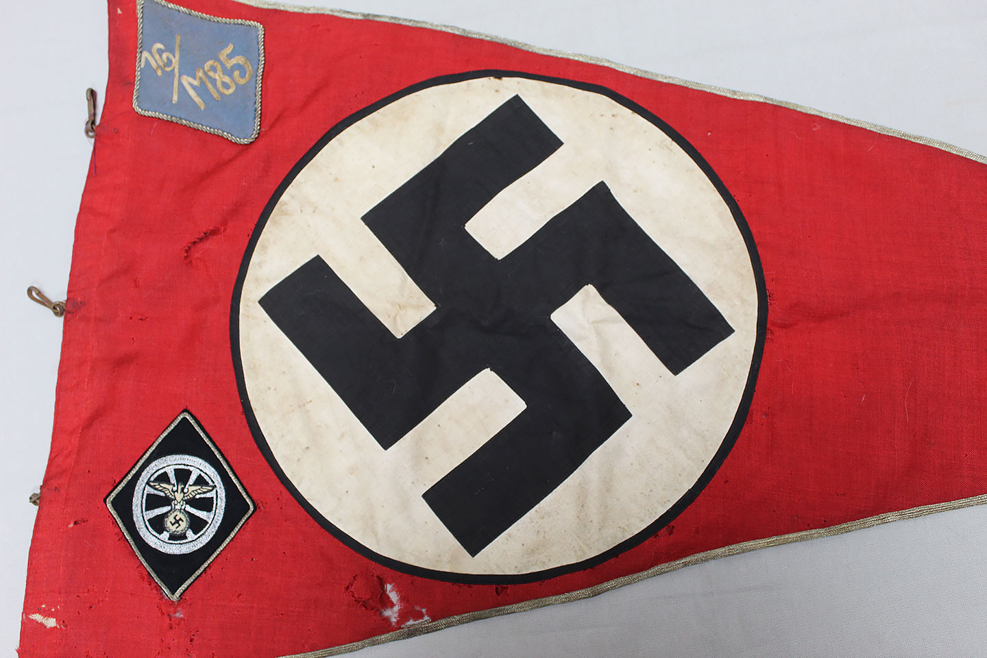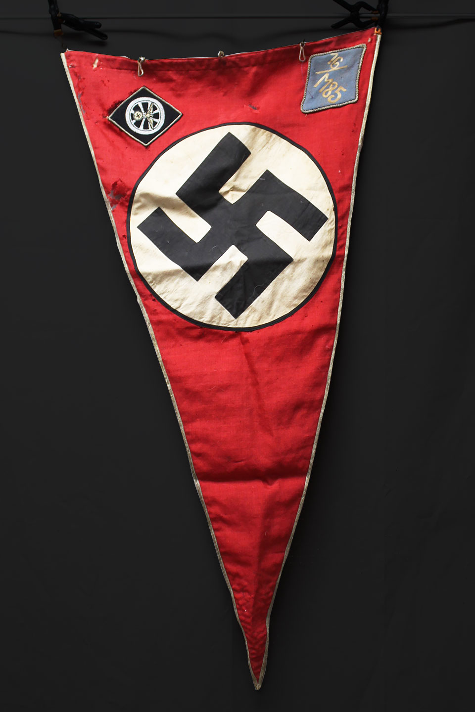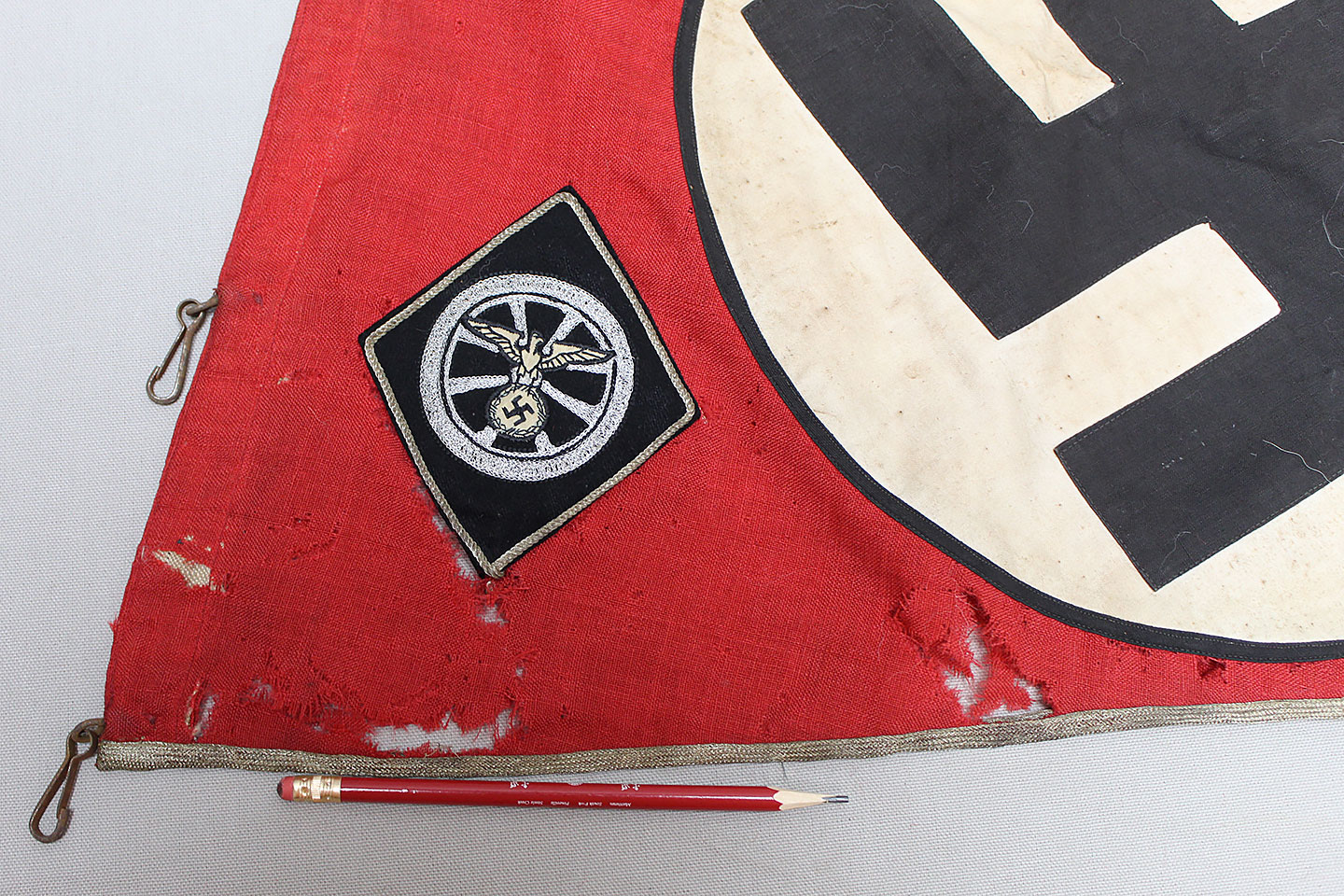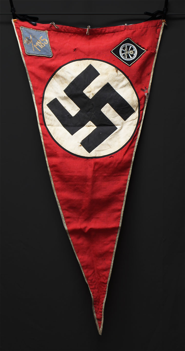 WW2 German Large NSKK Unit Pennant. Double sided. Missing one side small metal clip. Very worn and used condition with many small scattered holes, staining, and damage. Size approximately 22 inches X 45 inches. Overall a hard to find unit pennant that is in rough condition.