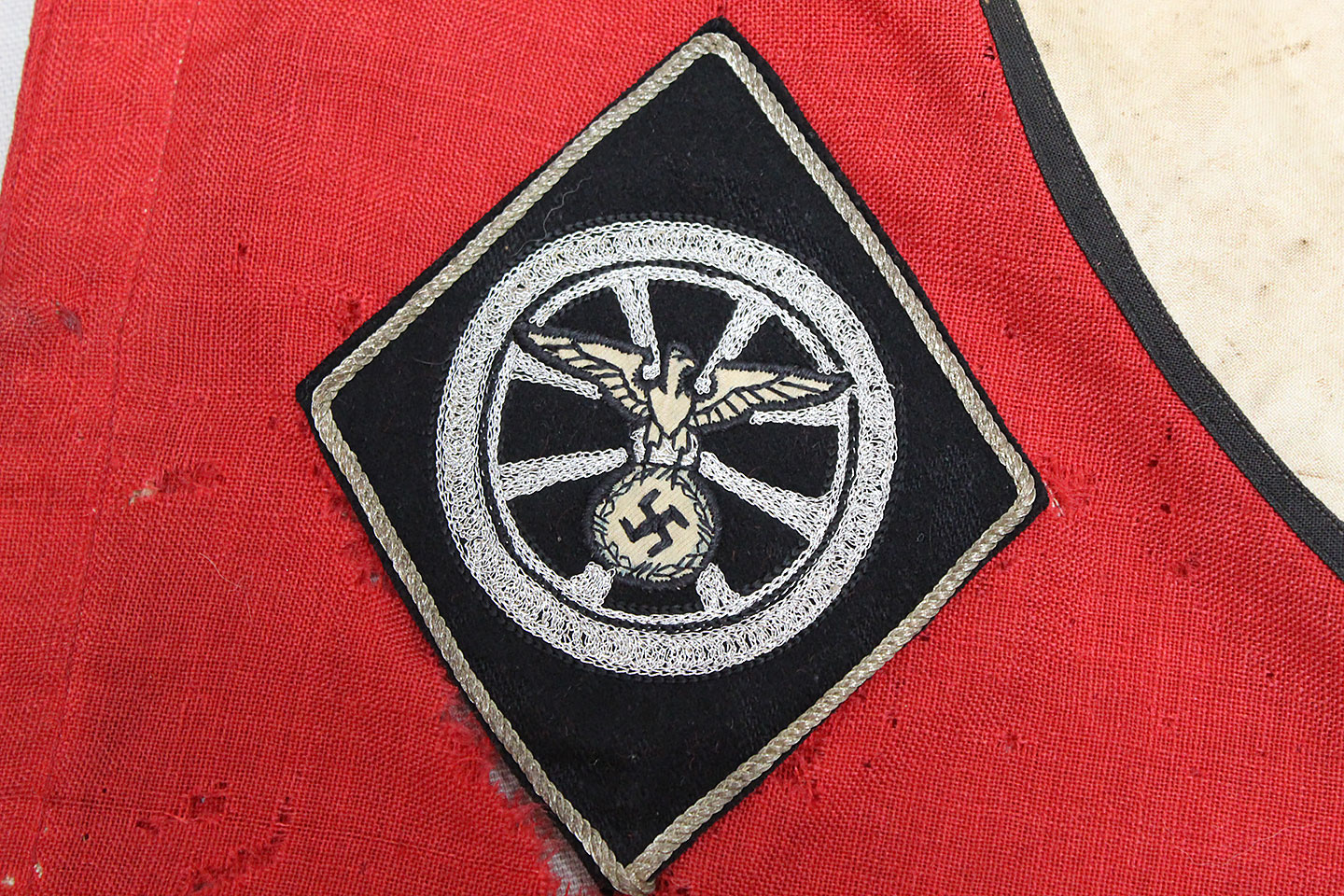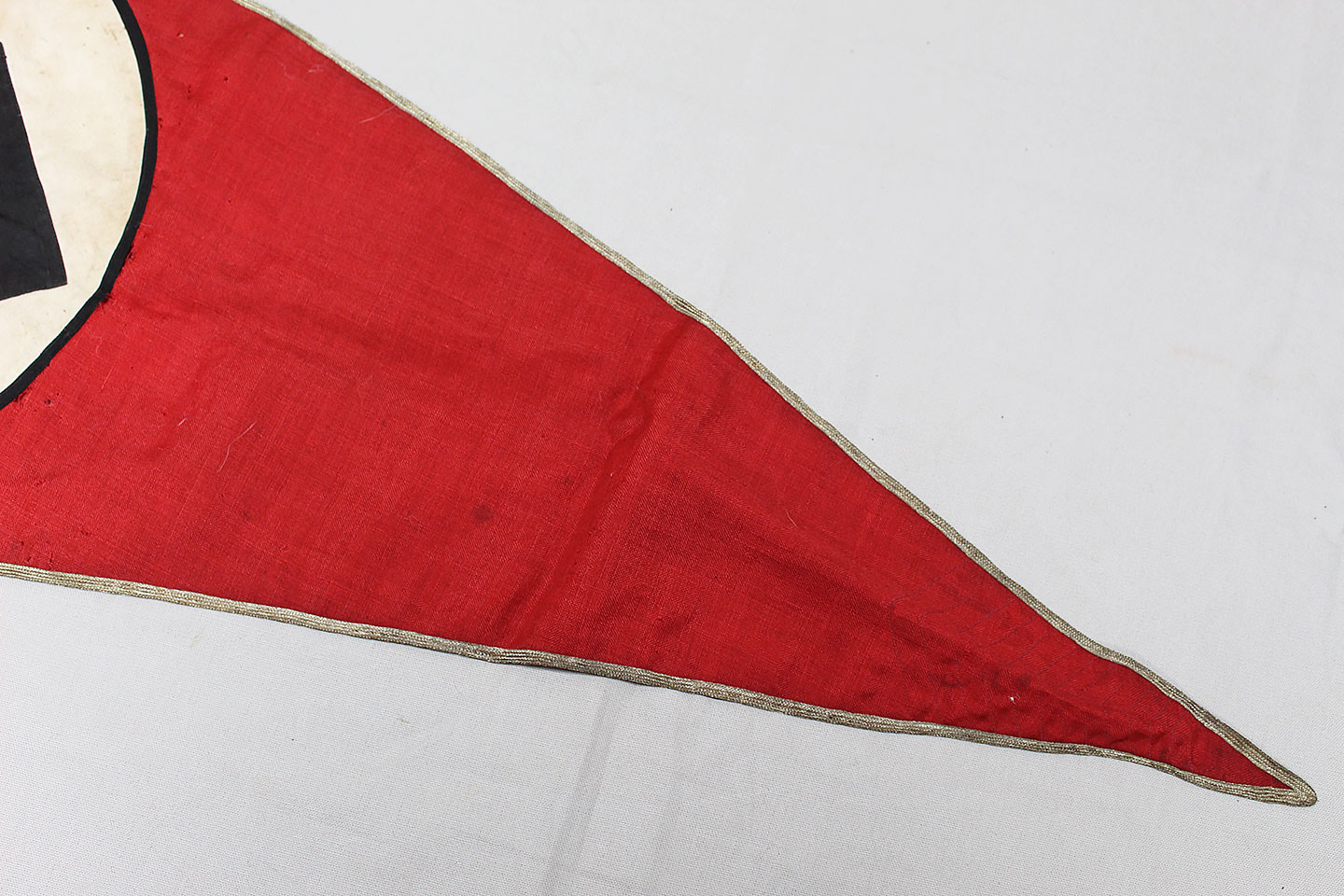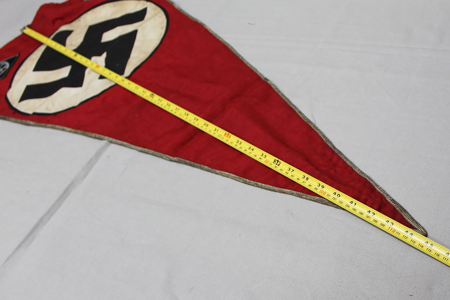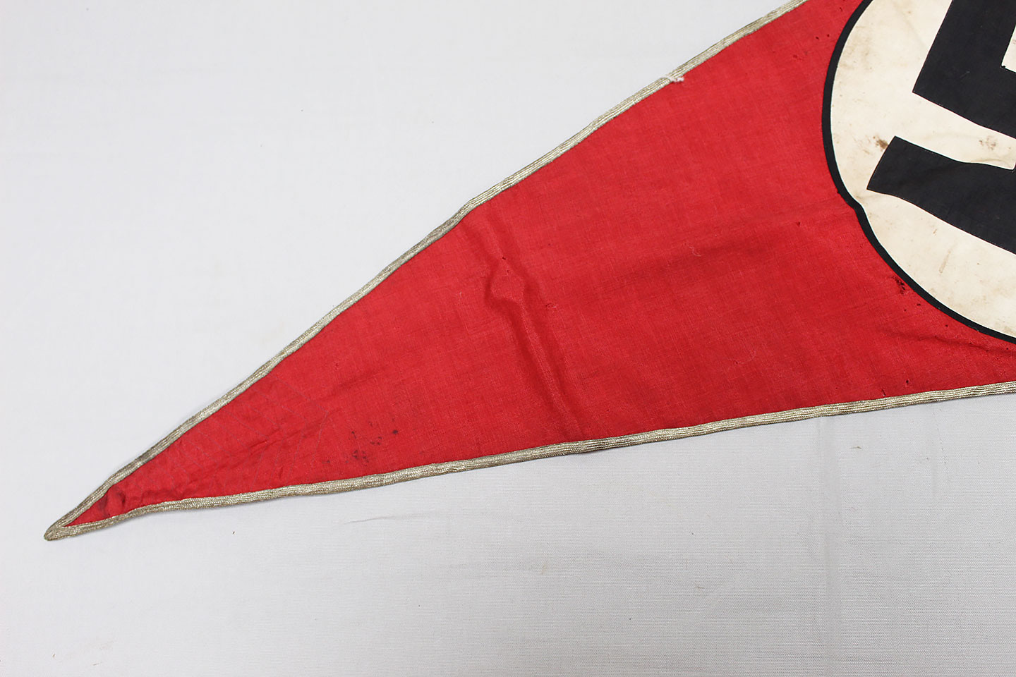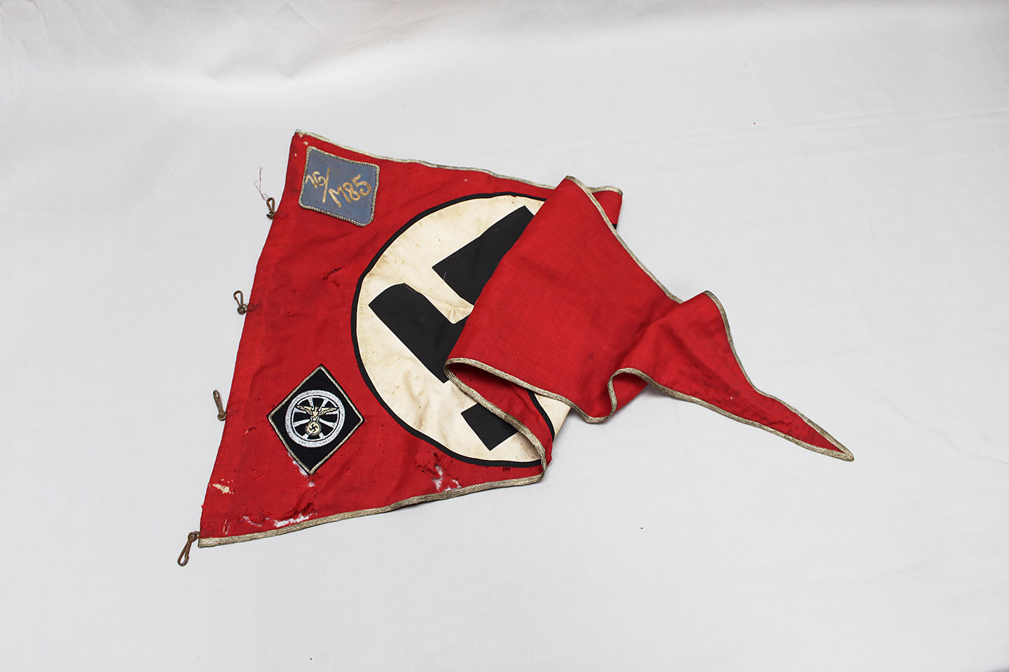 WW2 German Large NSKK Unit Pennant. Double sided. Missing one side small metal clip. Very worn and used condition with many small scattered holes, staining, and damage. Size approximately 22 inches X 45 inches. Overall a hard to find unit pennant that is in rough condition.