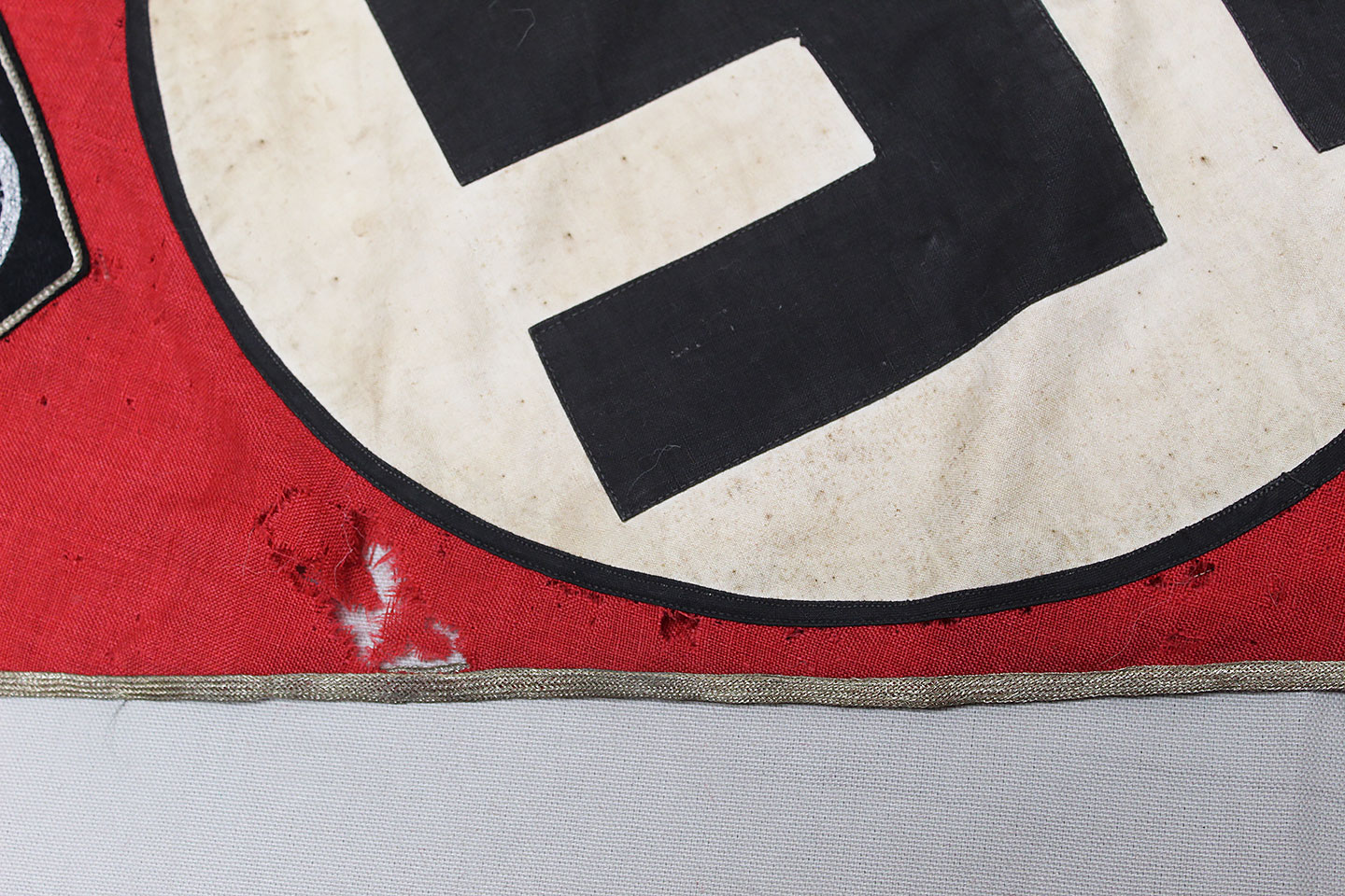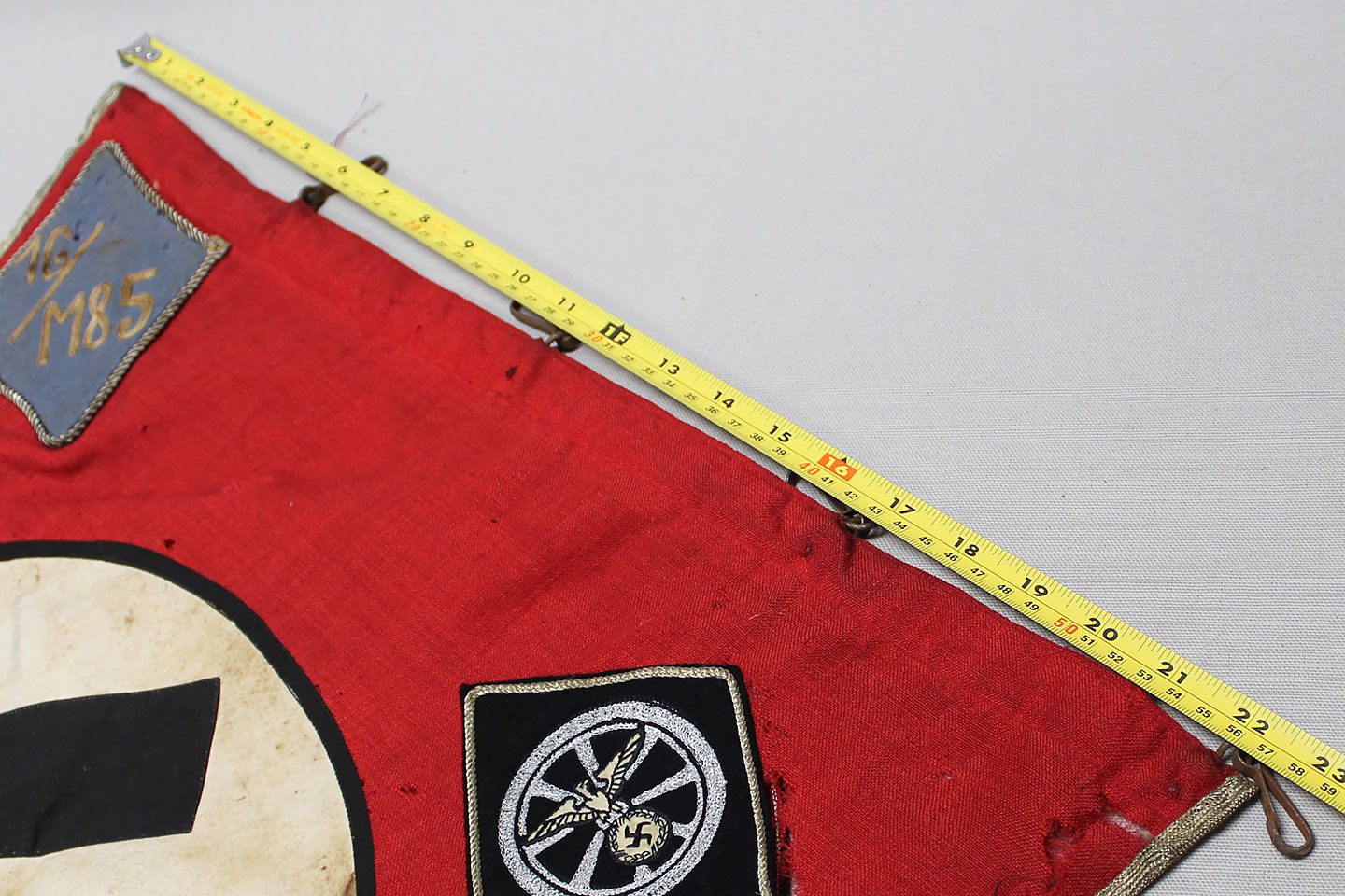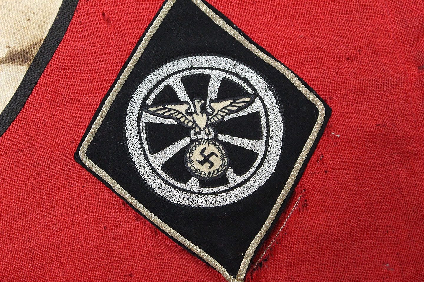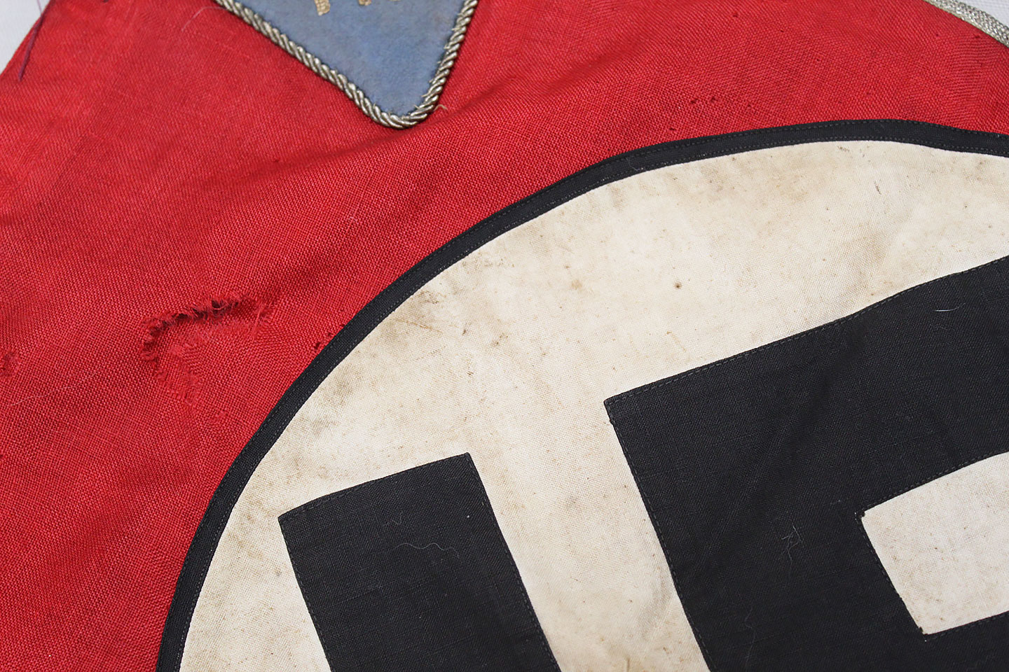 WW2 German Large NSKK Unit Pennant. Double sided. Missing one side small metal clip. Very worn and used condition with many small scattered holes, staining, and damage. Size approximately 22 inches X 45 inches. Overall a hard to find unit pennant that is in rough condition.