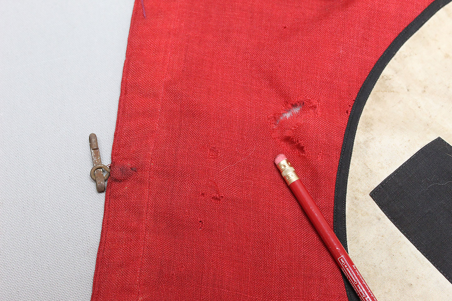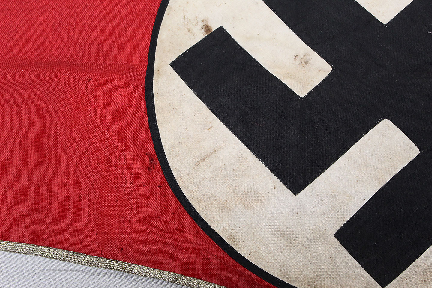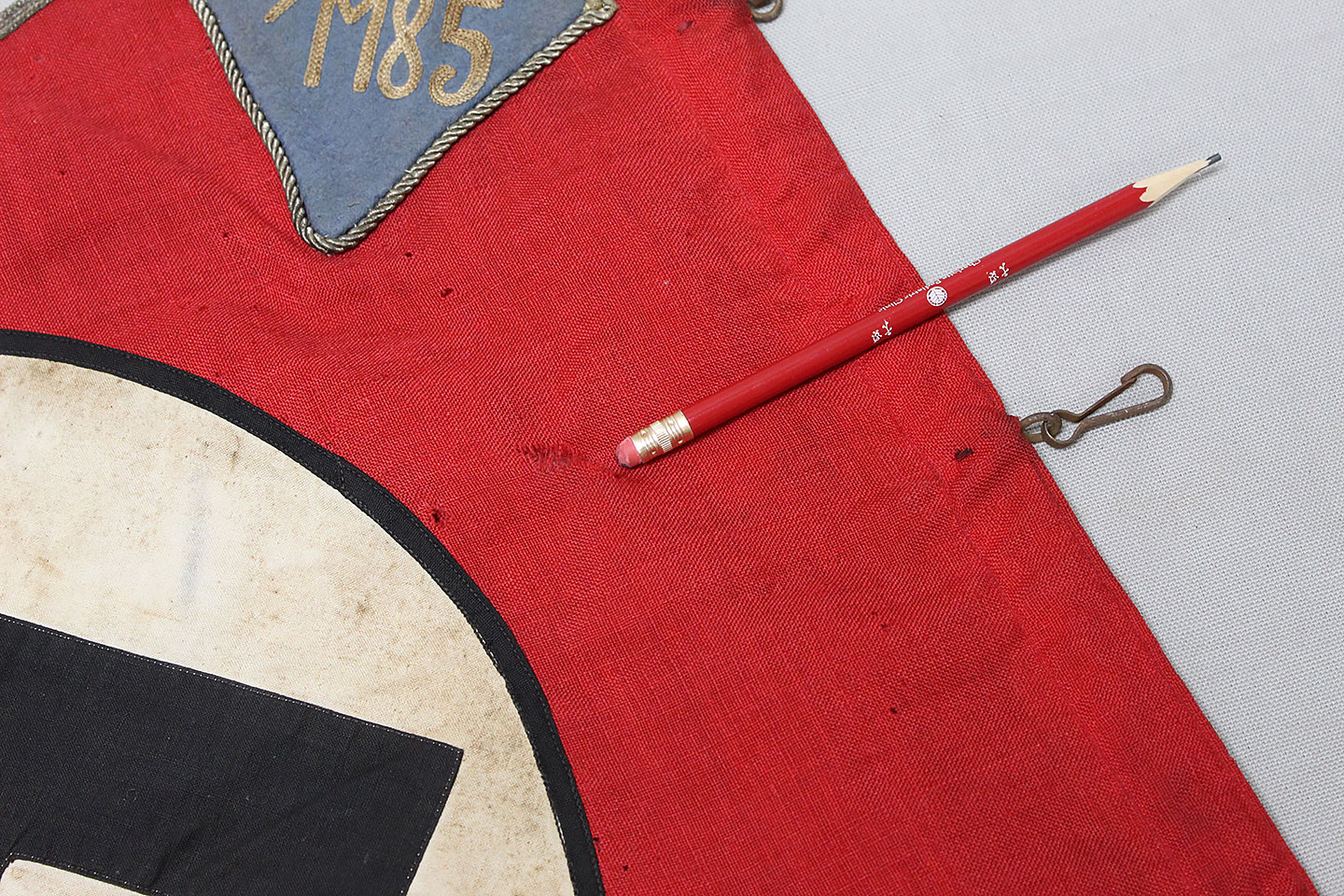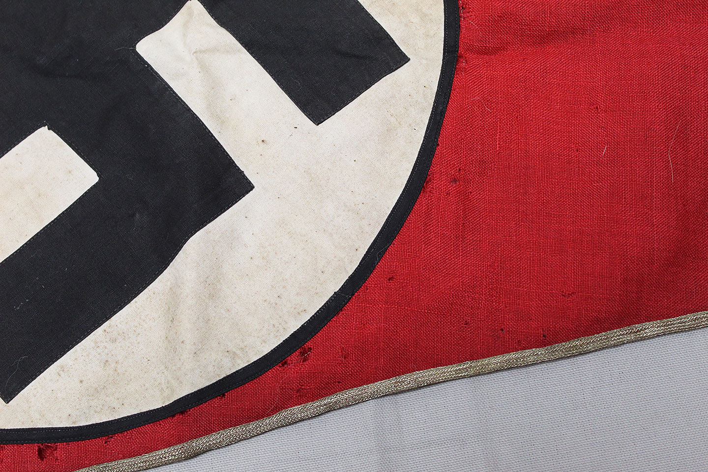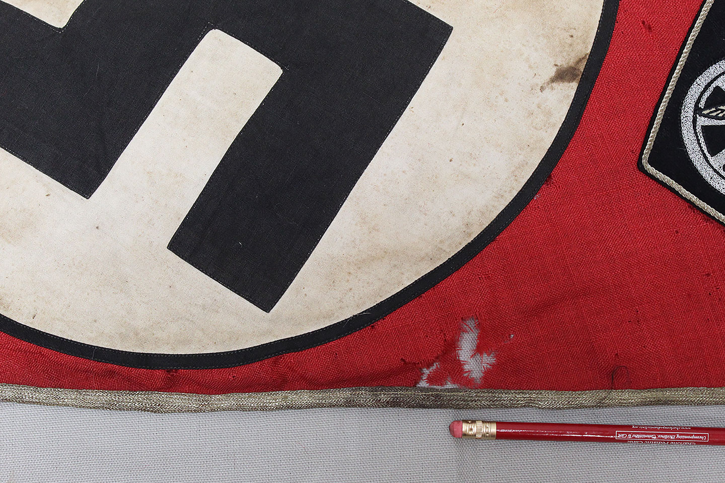 WW2 German Large NSKK Unit Pennant. Double sided. Missing one side small metal clip. Very worn and used condition with many small scattered holes, staining, and damage. Size approximately 22 inches X 45 inches. Overall a hard to find unit pennant that is in rough condition.