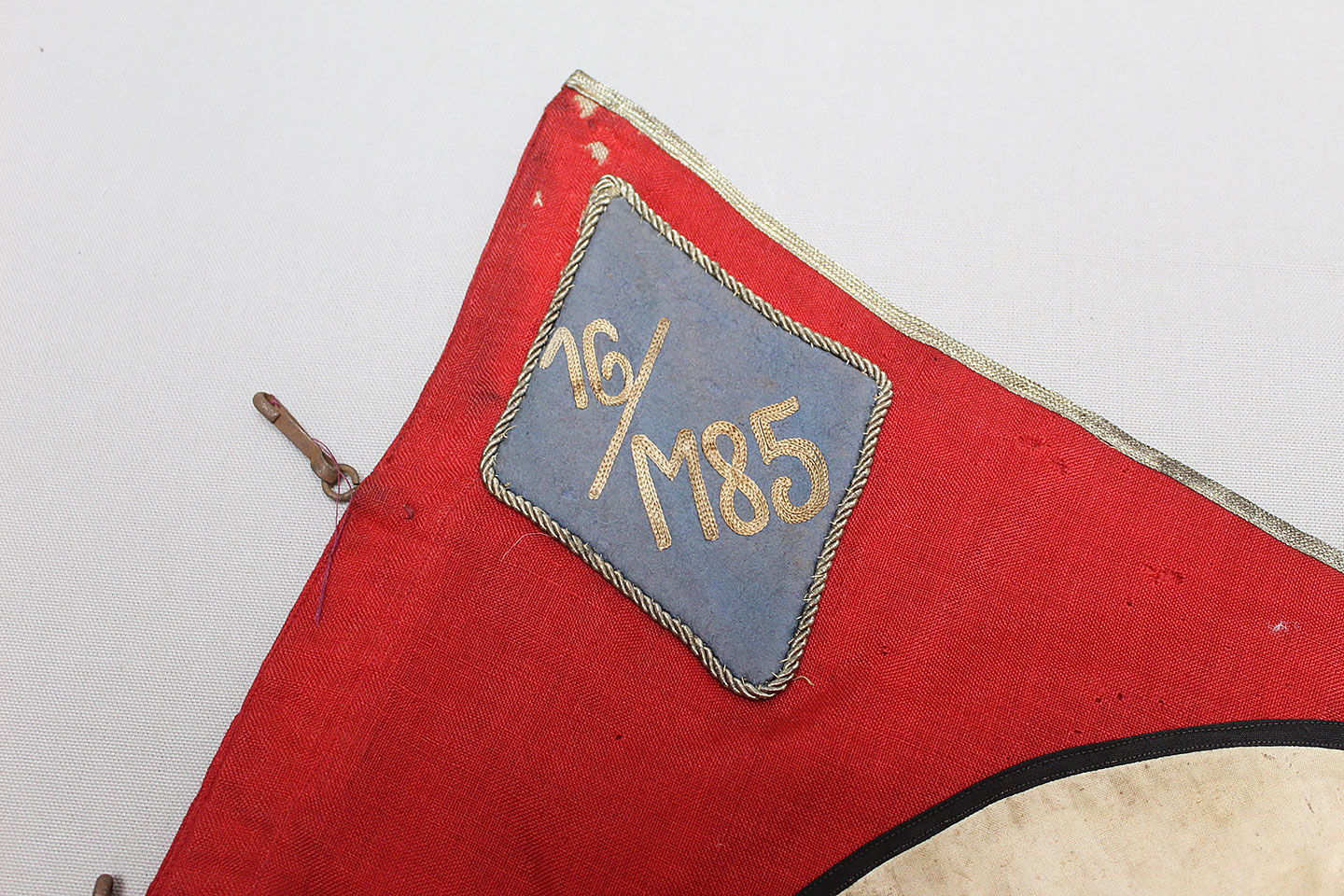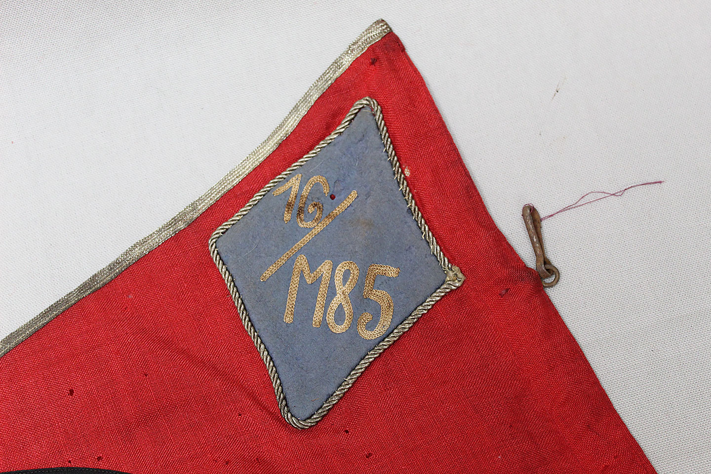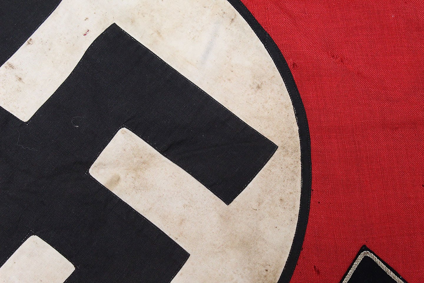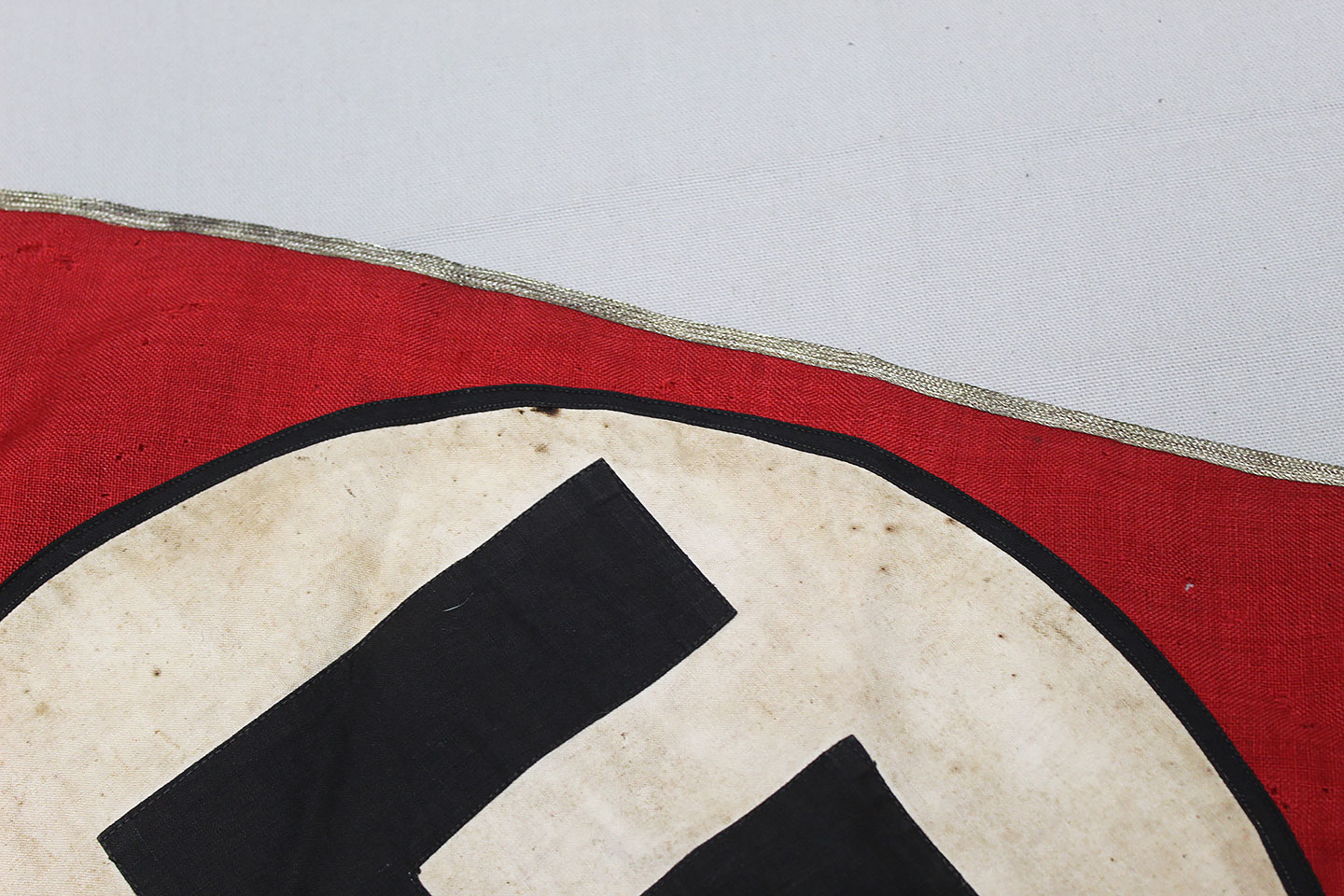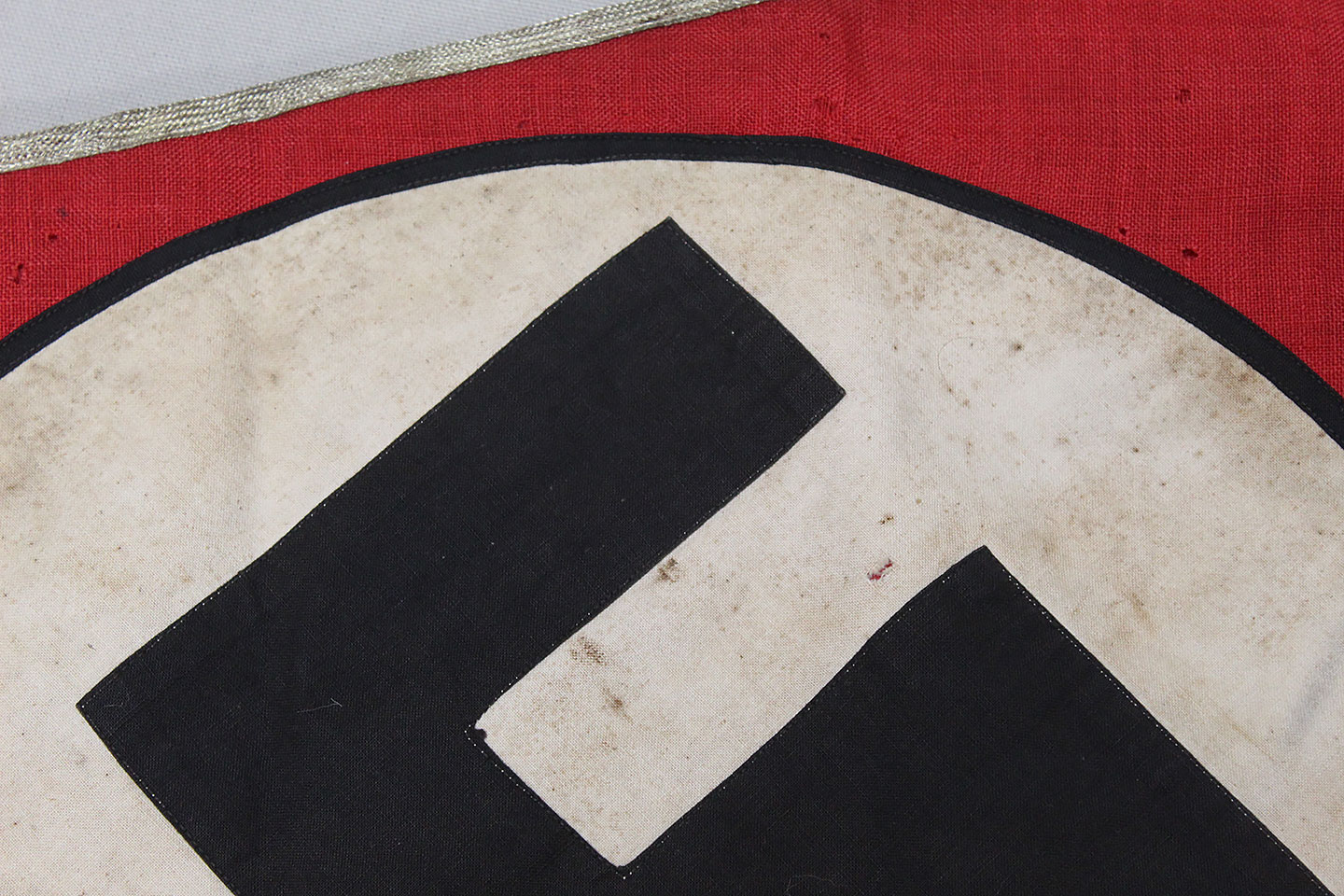 WW2 German Large NSKK Unit Pennant. Double sided. Missing one side small metal clip. Very worn and used condition with many small scattered holes, staining, and damage. Size approximately 22 inches X 45 inches. Overall a hard to find unit pennant that is in rough condition.