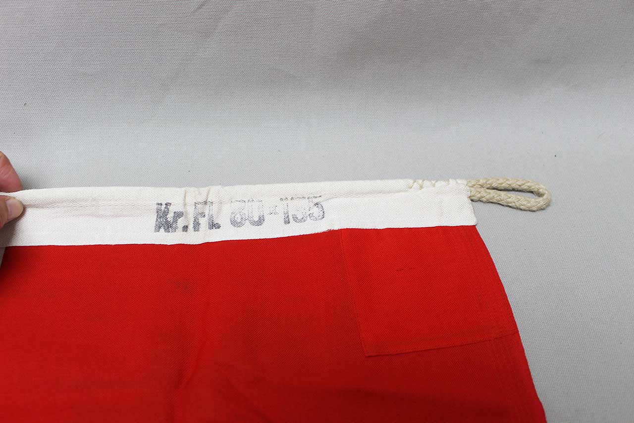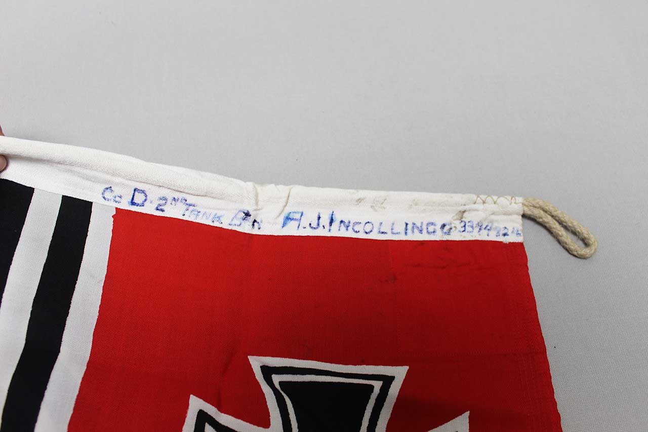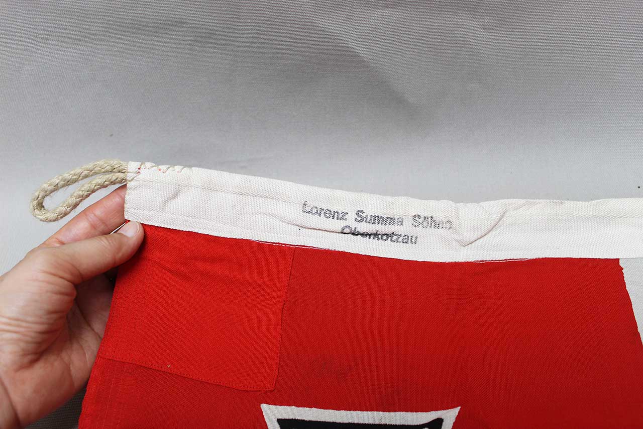 WW2 German National War Flag. Rope loops still on this flag, looped on each end. Double sided. Marker marked Lorenz Summa Sohne Oberkotzau and size marked Kr.Fl 80×135 (80cm x 130cm or about 32 inches x 53 inches), this is the sought after smaller size. Also, ink marked most likely by GI appears to be: Co D 2nd Tank Bn A.J.Incolling O,33948212. Overall decent condition with some overall wear.