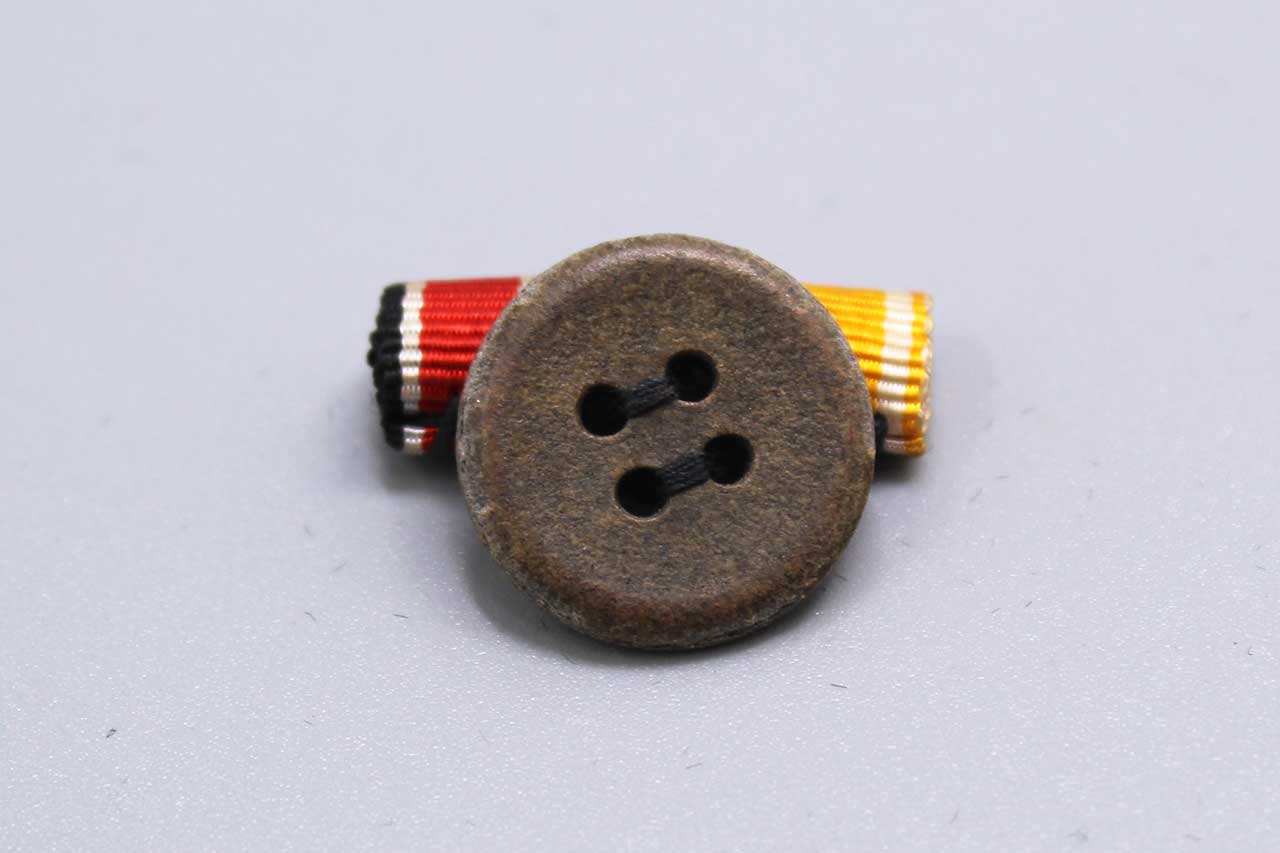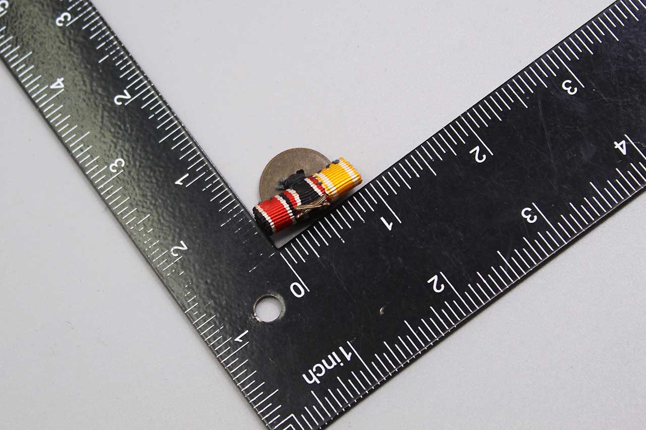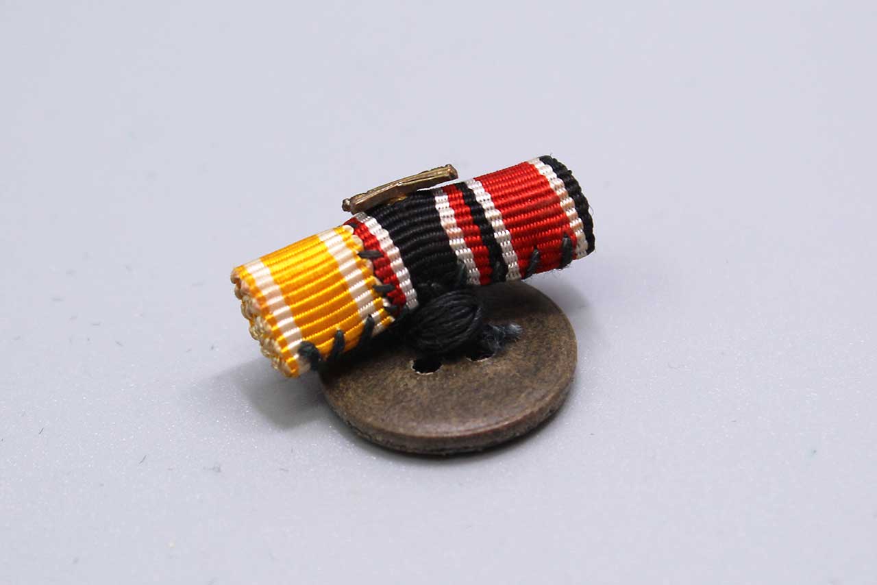 WW2 German small ribbon lapel device for the WW2 Iron Cross ribbon, War Merit Cross 2nd Class with swords ribbon, and Westwall ribbon. Worn condition.