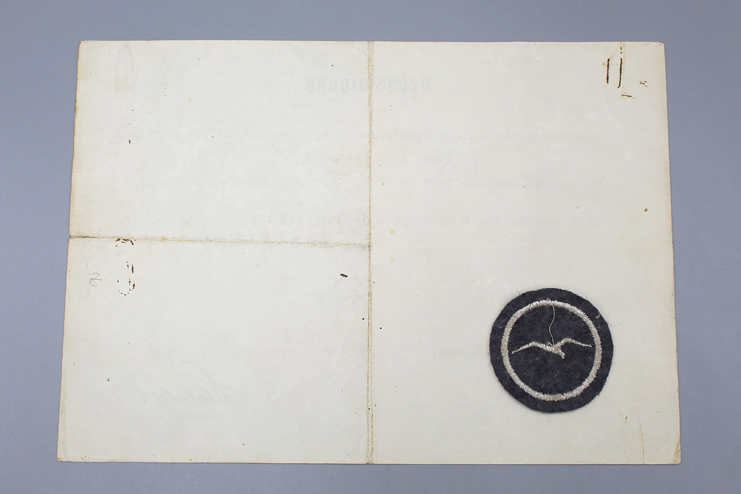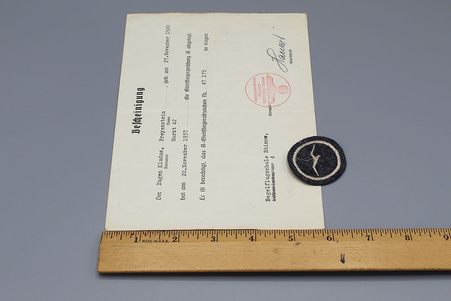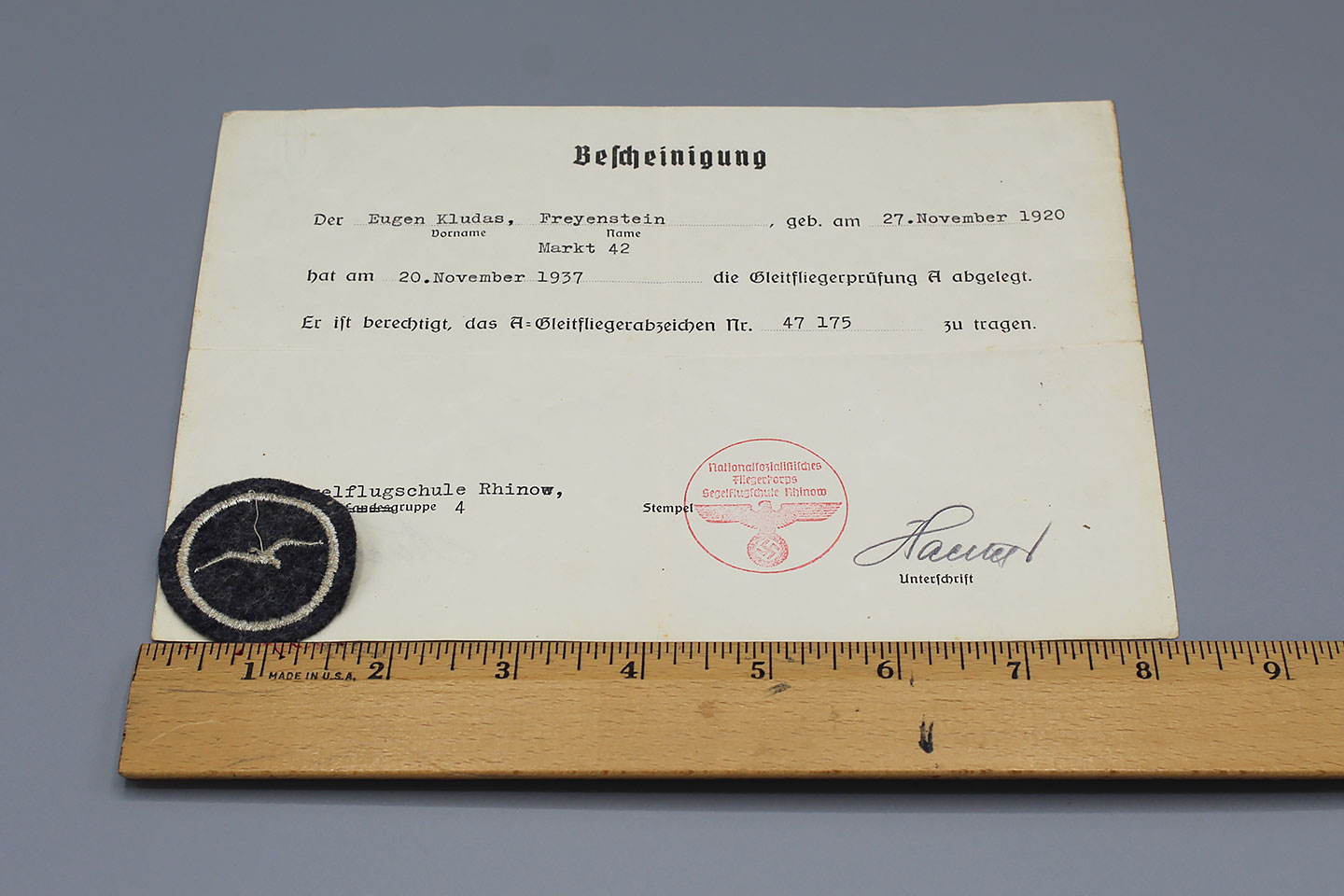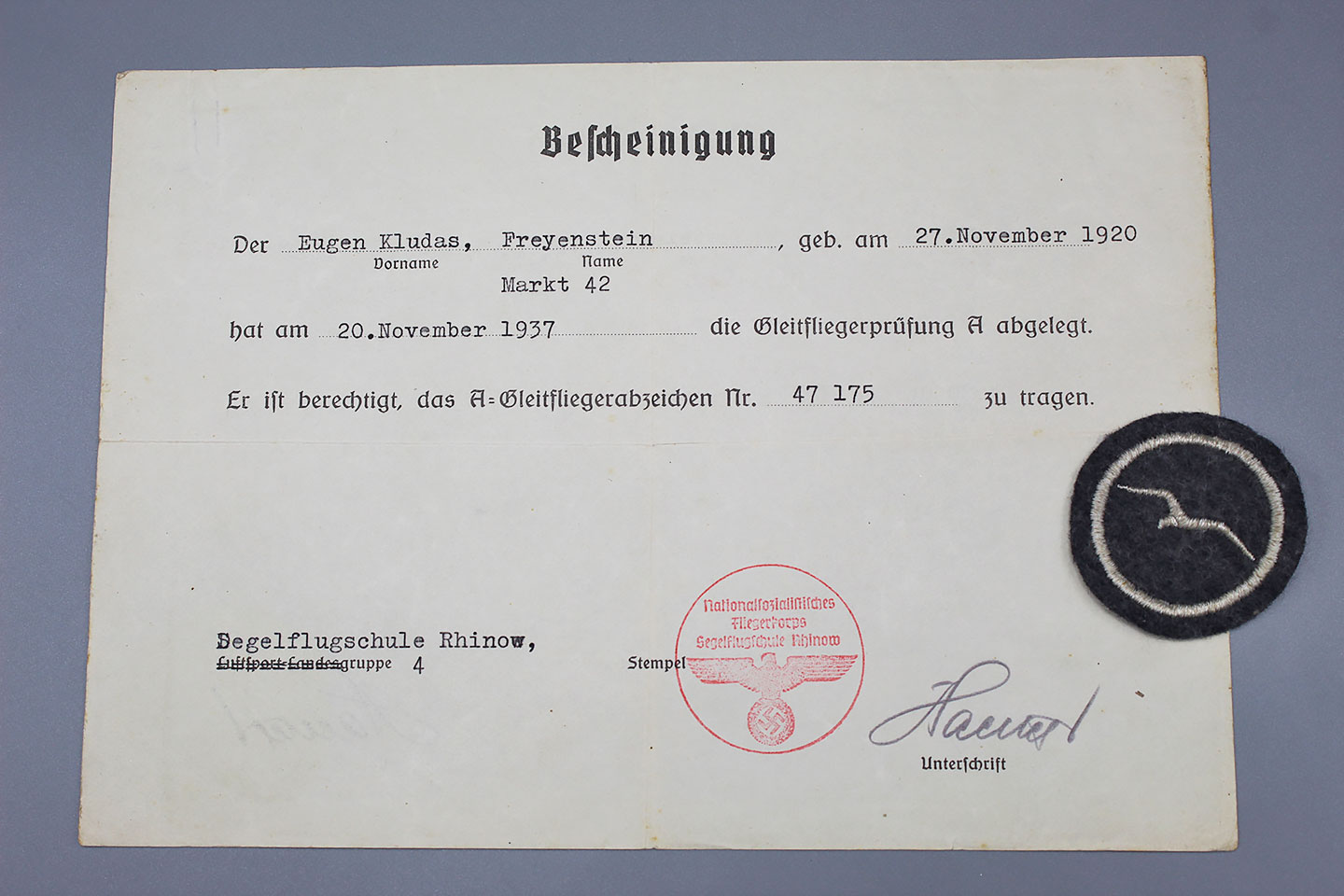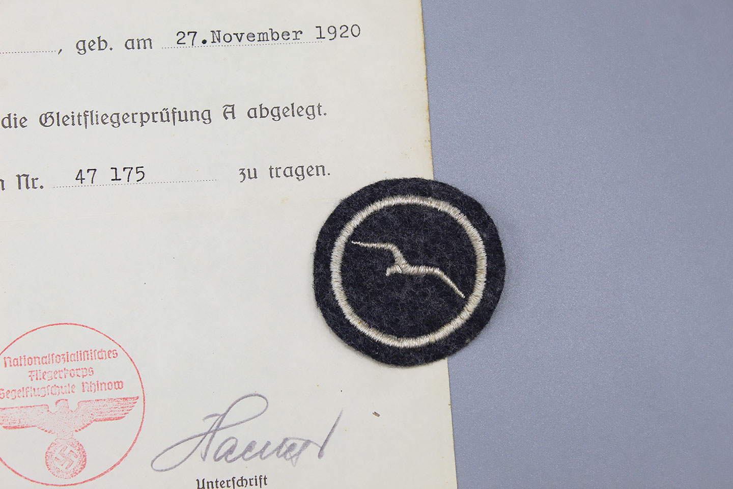 WW2 German Luftwaffe Glider Proficiency Class “A” insignia (with 1 gull). Also, has award document as well.