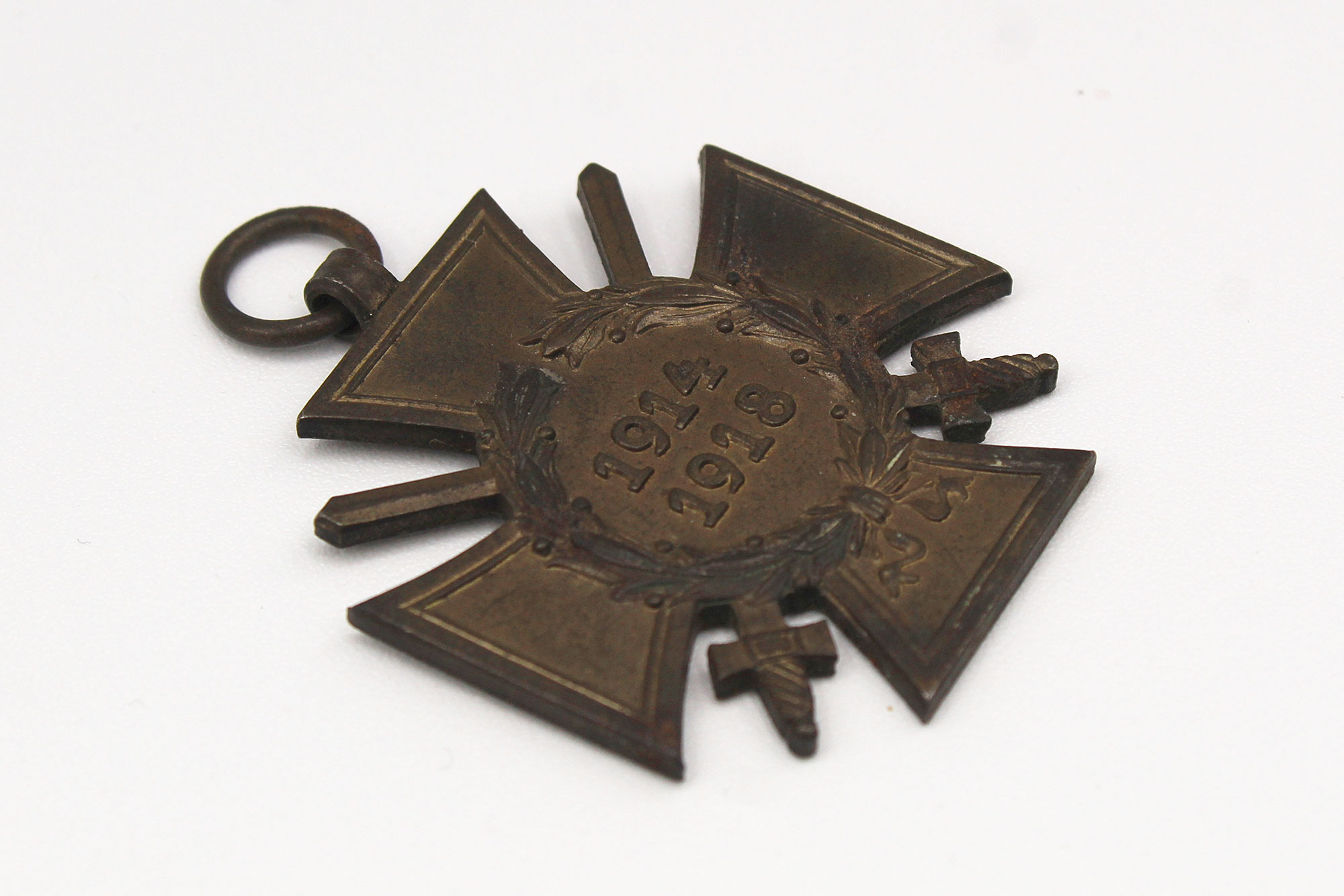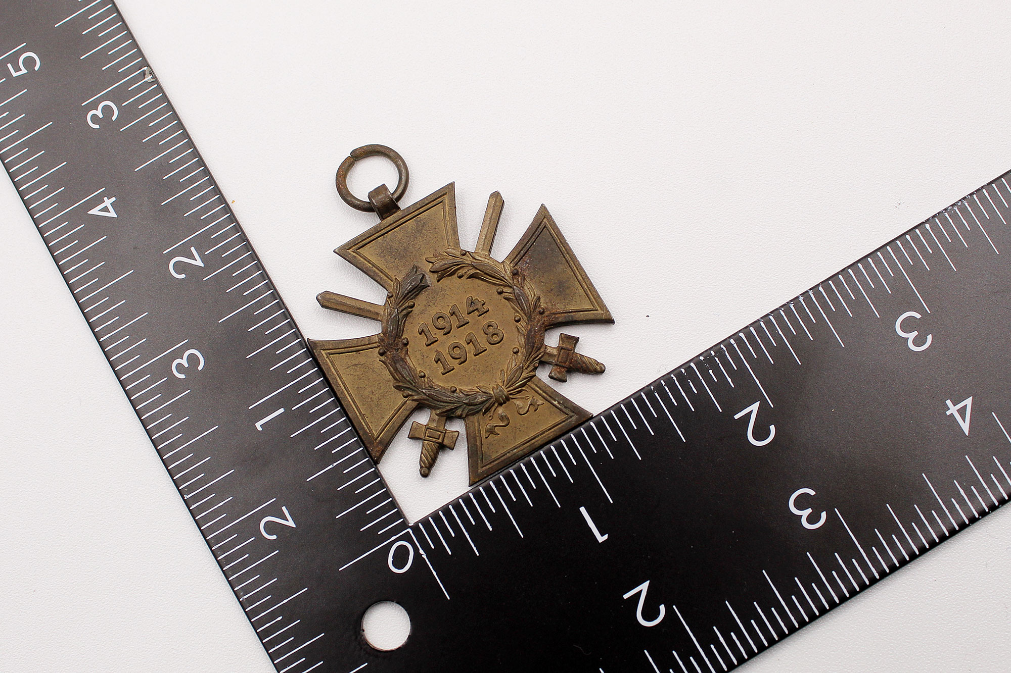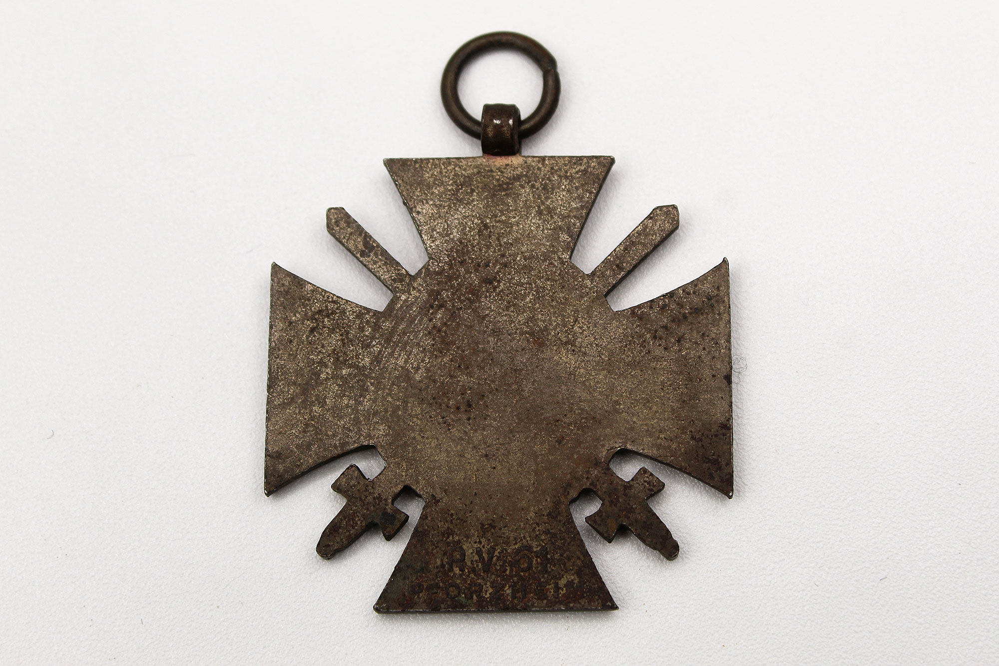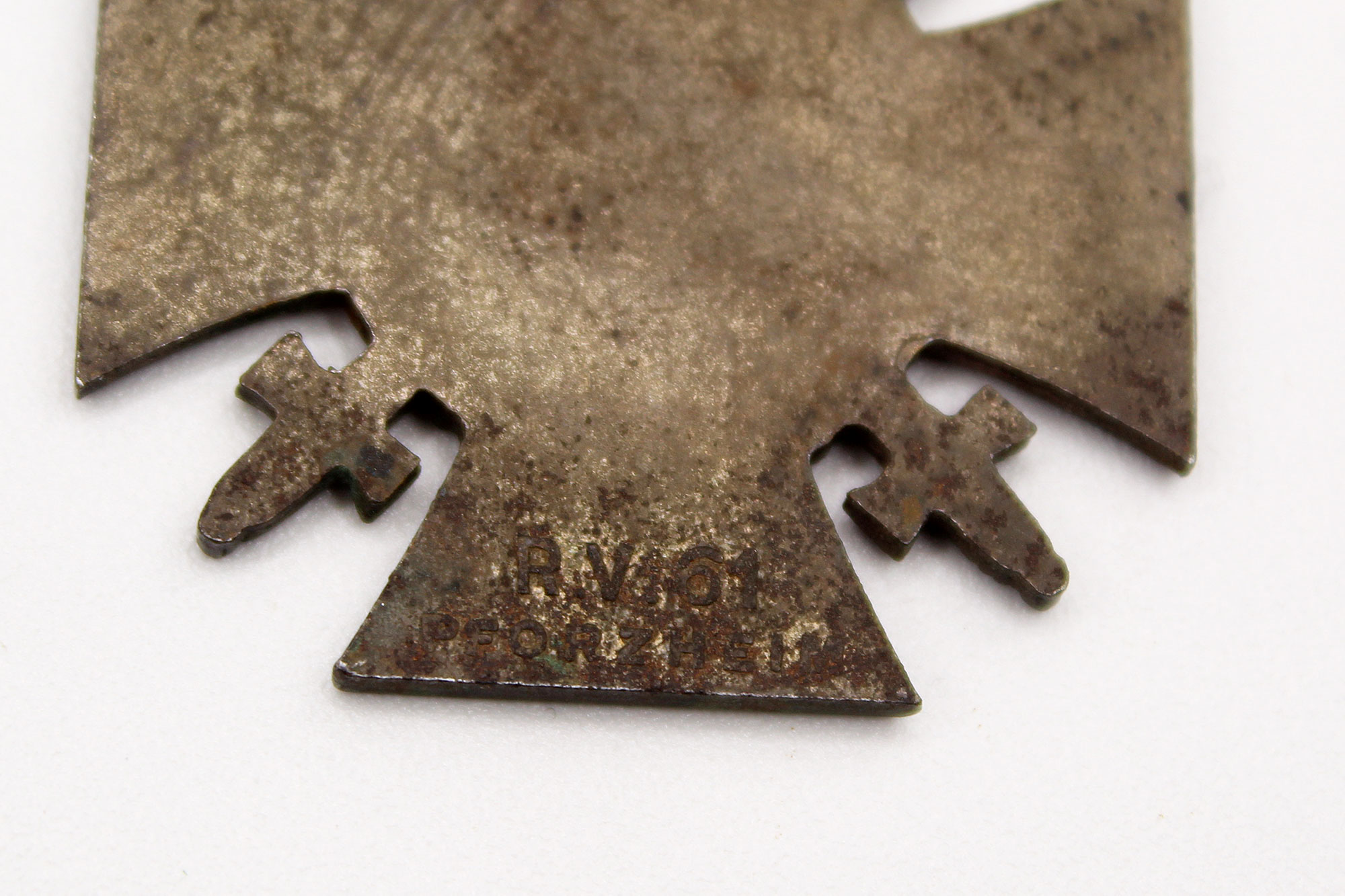 WW2 German Hindenburg honor cross with swords. No ribbon. Marker marked on lower back of medal R.V. 61 Pforzheim. Very worn condition.