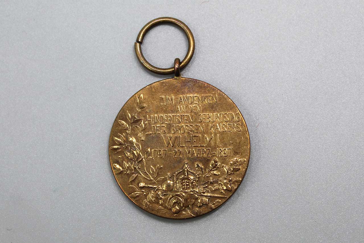 Prussian 1897 Kaiser Whilhelm Memorial Medal also known as the Centenary Medal (Zentenarmedaille). Established 1897 by Wilhelm II for the 100th Birthday of his grandfather. Awarded by Prussia to military officers, NCOs, enlisted personnel, as well as veterans. The medal is made of bronze gunmetal from captured cannons. No ribbon. Worn condition.
