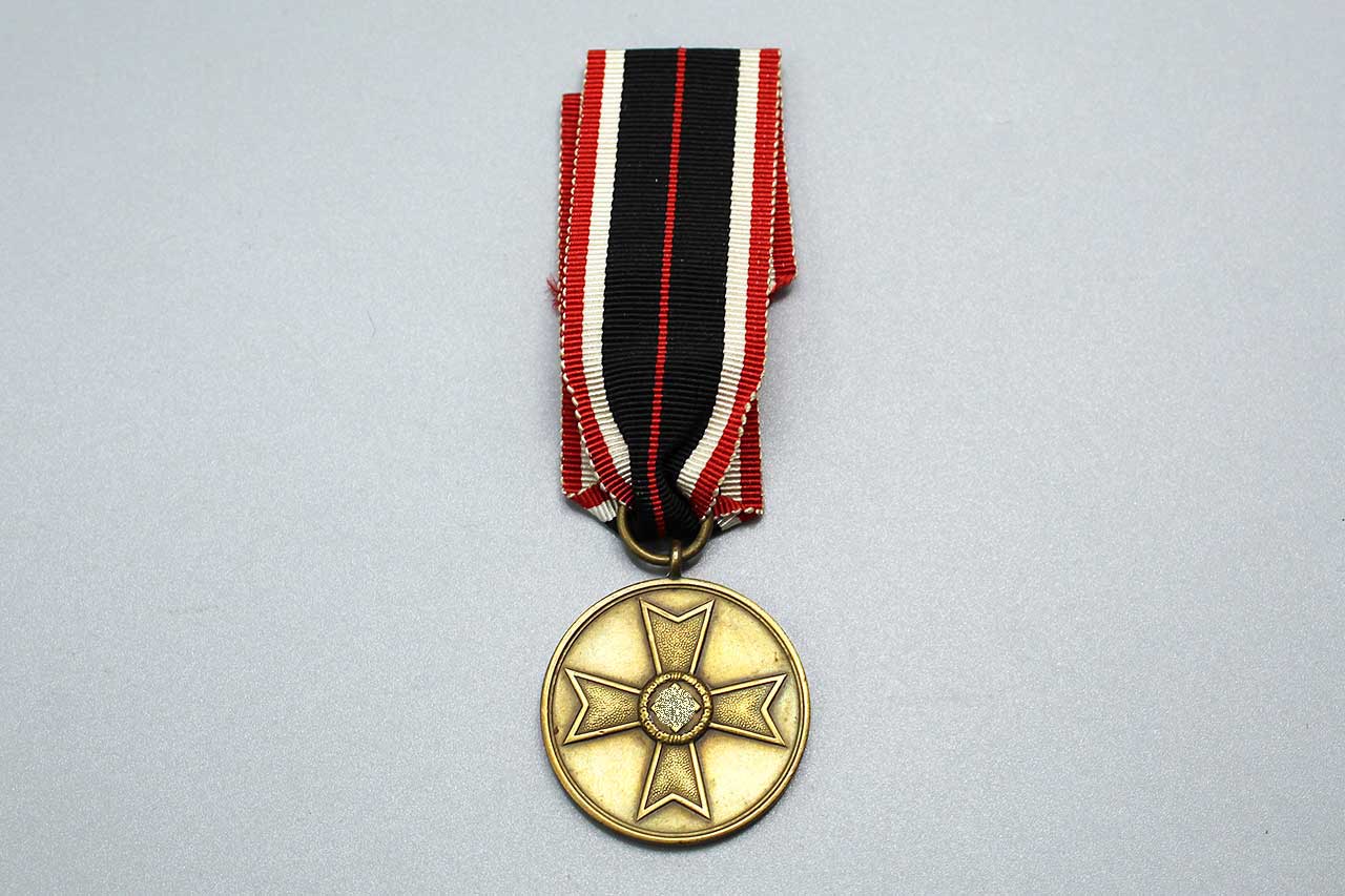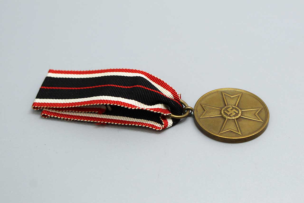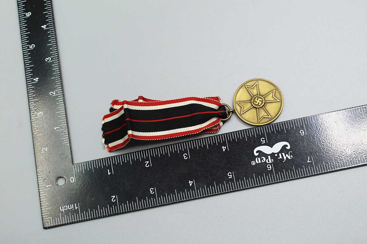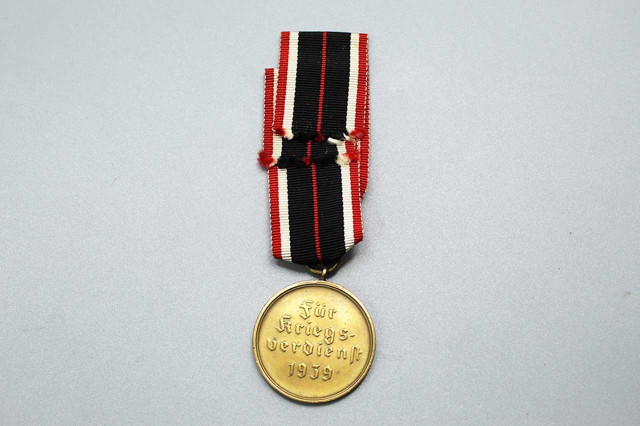 WW2 German War Merit Medal. Long ribbon. Reverse of medal has wording “Fur Kriegs-verdienst 1939” or For War Merit 1939. Worn condition.