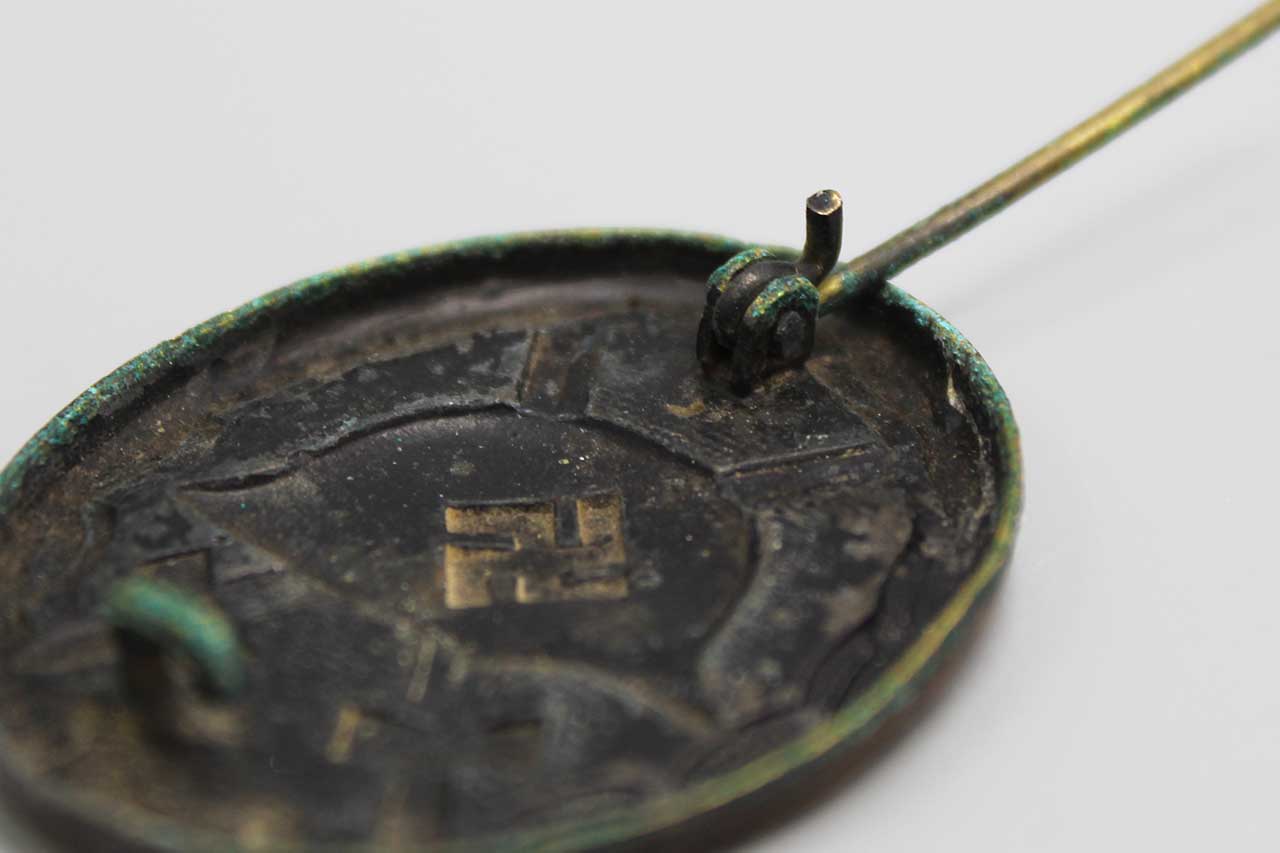 WW2 German Black Wound Badge (Verwundetenabzeichen). Round pin on back. Die Stamped brass-based badge. Worn condition.