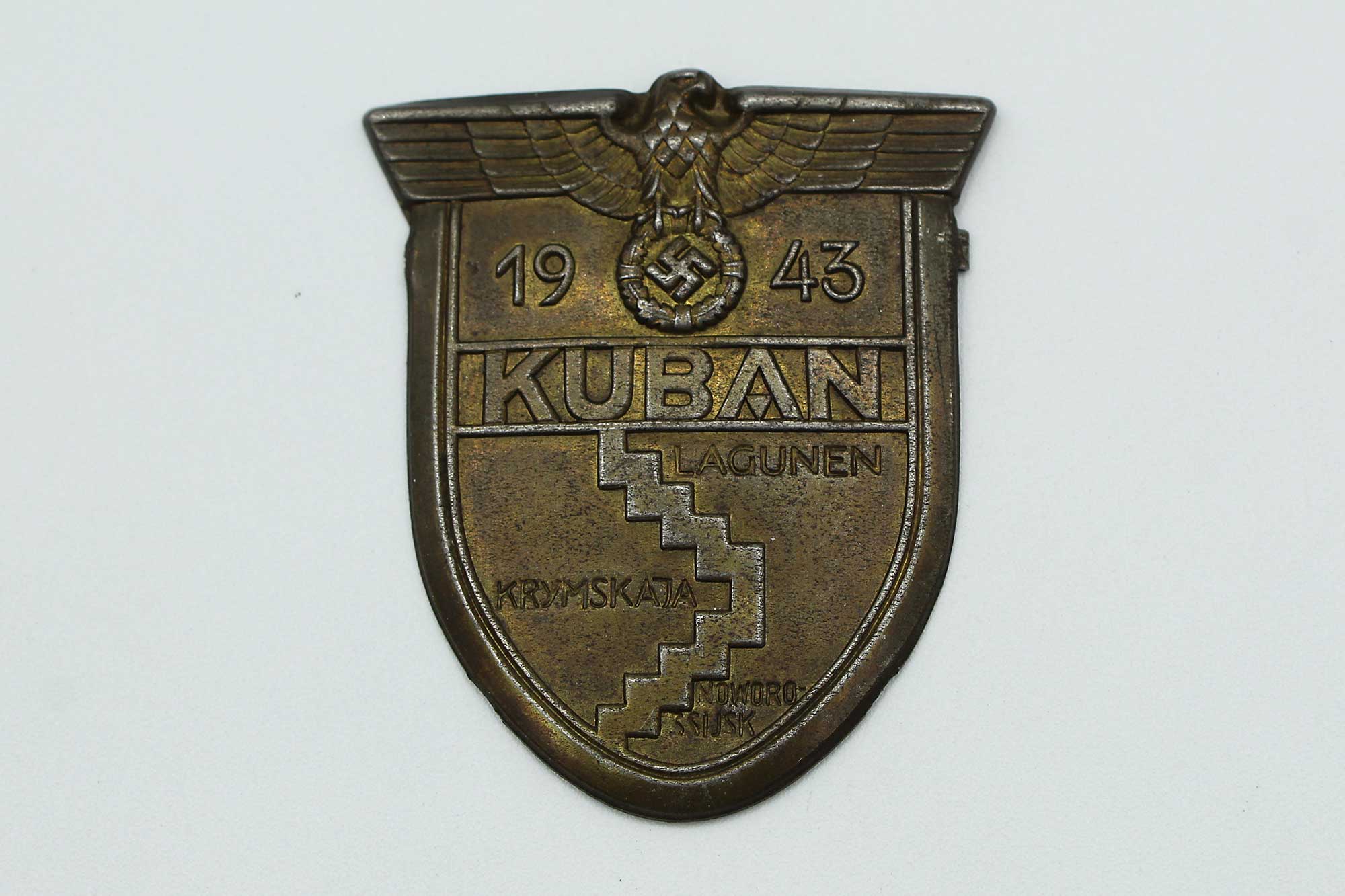WW2 German Wehrmacht Kuban Campaign Shield. Steel based die stamped shield with bronze wash. No backing plate or wool cloth. Only one of the fold-over prongs left on back. Worn condition.