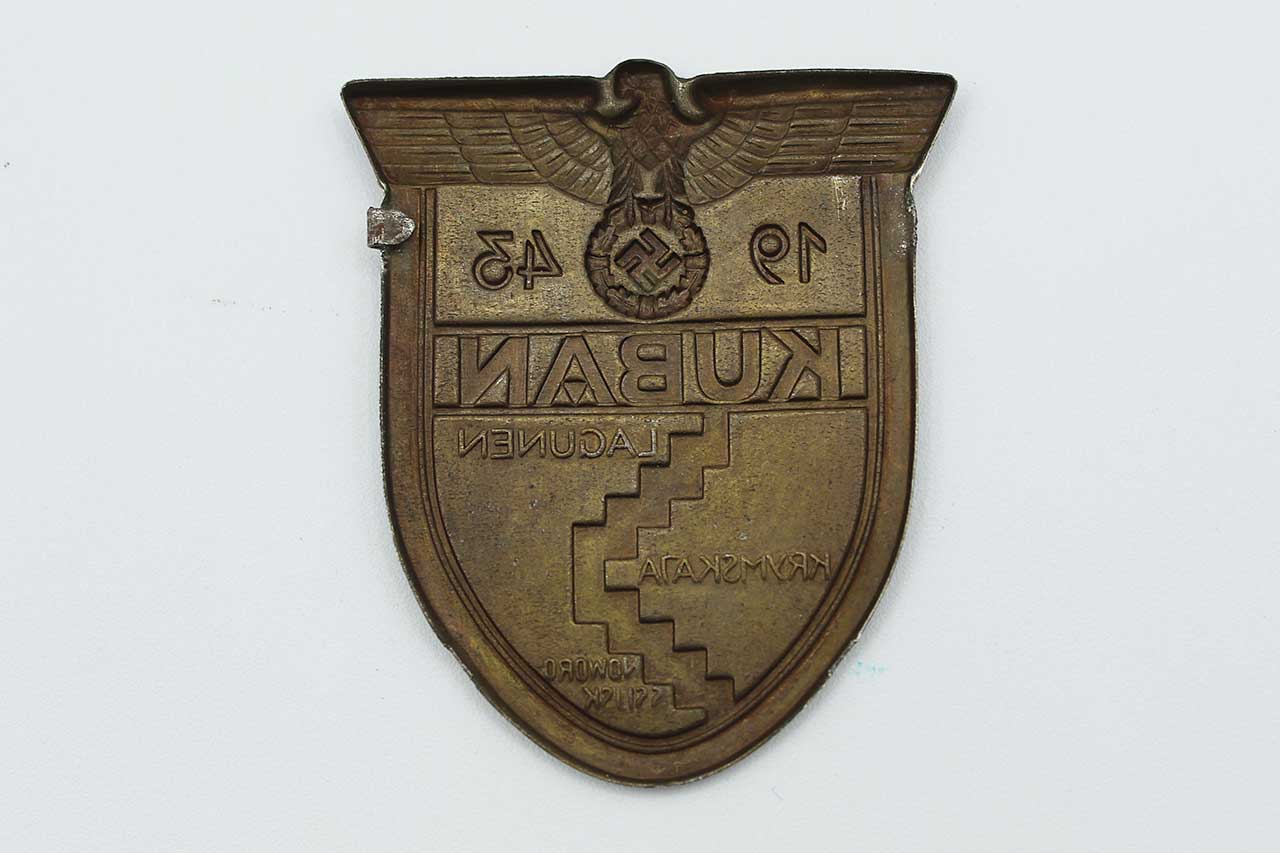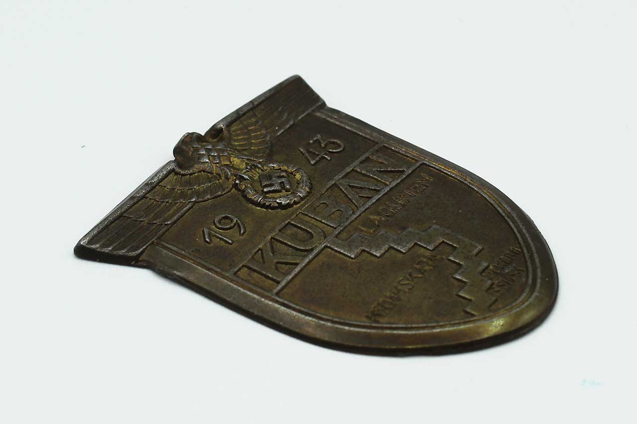 Additional Notes: The Kuban Shield (Ärmelschild Kuban) was a WW2 military decoration of WW2 Germany. It was awarded to Wehrmacht forces who fought at the Kuban bridgehead in the Soviet Union from February 1943 until October 1943. The Kuban shield was worn on the upper left sleeve of the tunic. If the recipient received more than one campaign shield, the earlier was worn above any later awards.