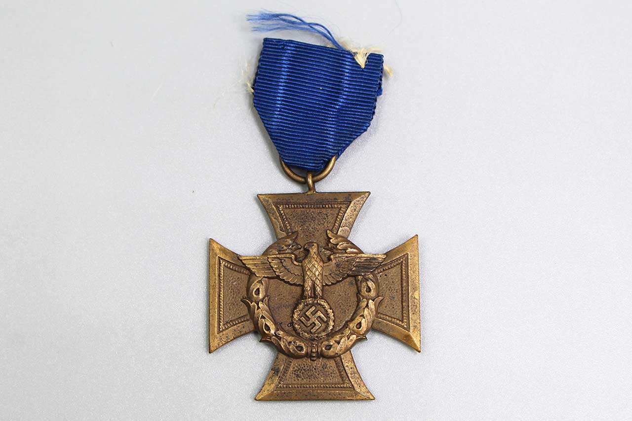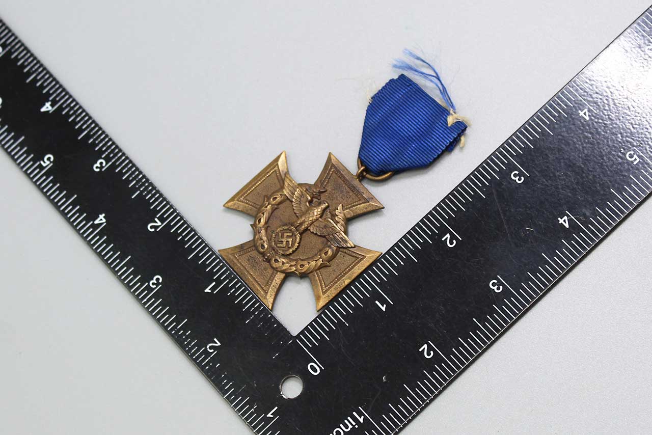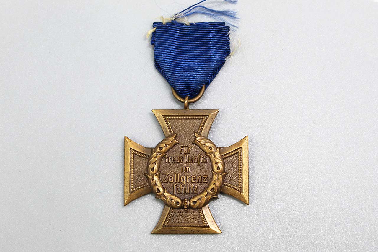 WW2 German Customs and Border Protection Service Medal (Zollgrenzschutz-Ehrenzeichen). Only a small portion of dark blue ribbon left. The back of medal has the wording: FÜR TREUE DIENSTE IM ZOLLGRENZ-SCHUTZ (FOR FAITHFUL SERVICE IN BORDER PROTECTION). Worn condition.