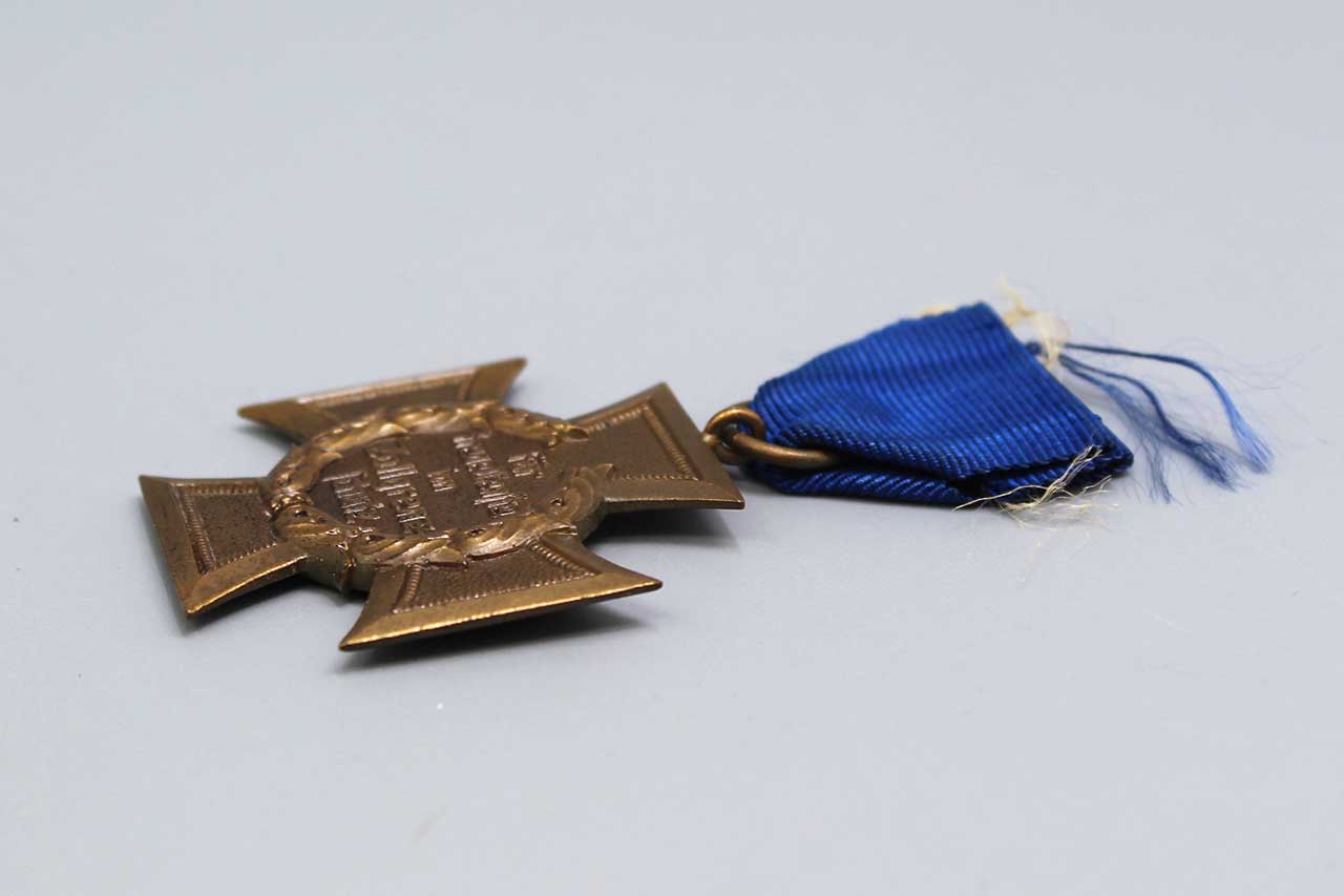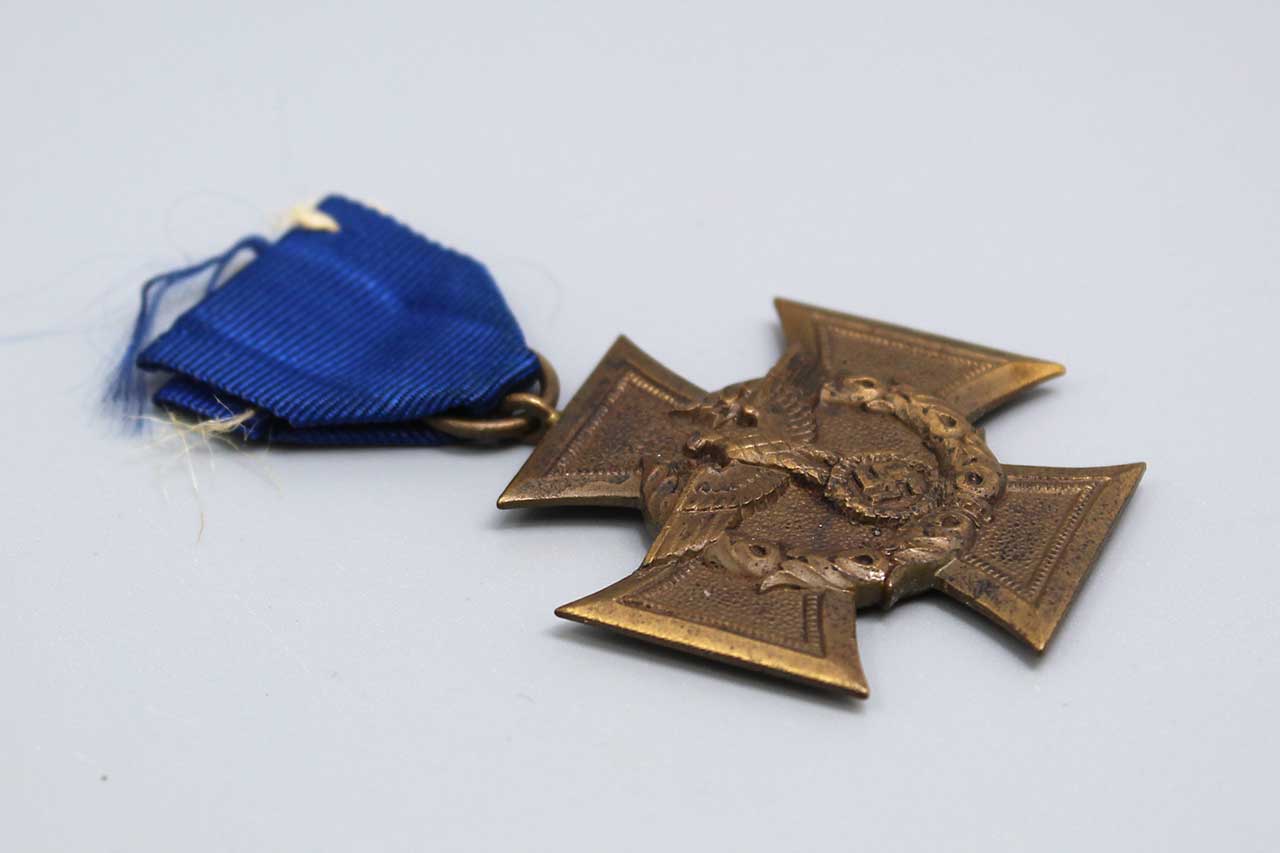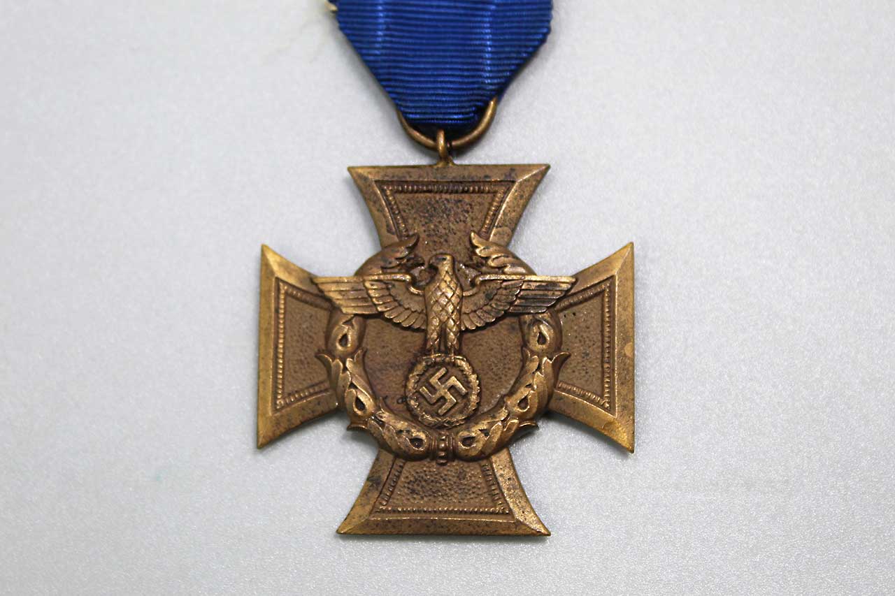 WW2 German Customs and Border Protection Service Medal (Zollgrenzschutz-Ehrenzeichen). Only a small portion of dark blue ribbon left. The back of medal has the wording: FÜR TREUE DIENSTE IM ZOLLGRENZ-SCHUTZ (FOR FAITHFUL SERVICE IN BORDER PROTECTION). Worn condition.