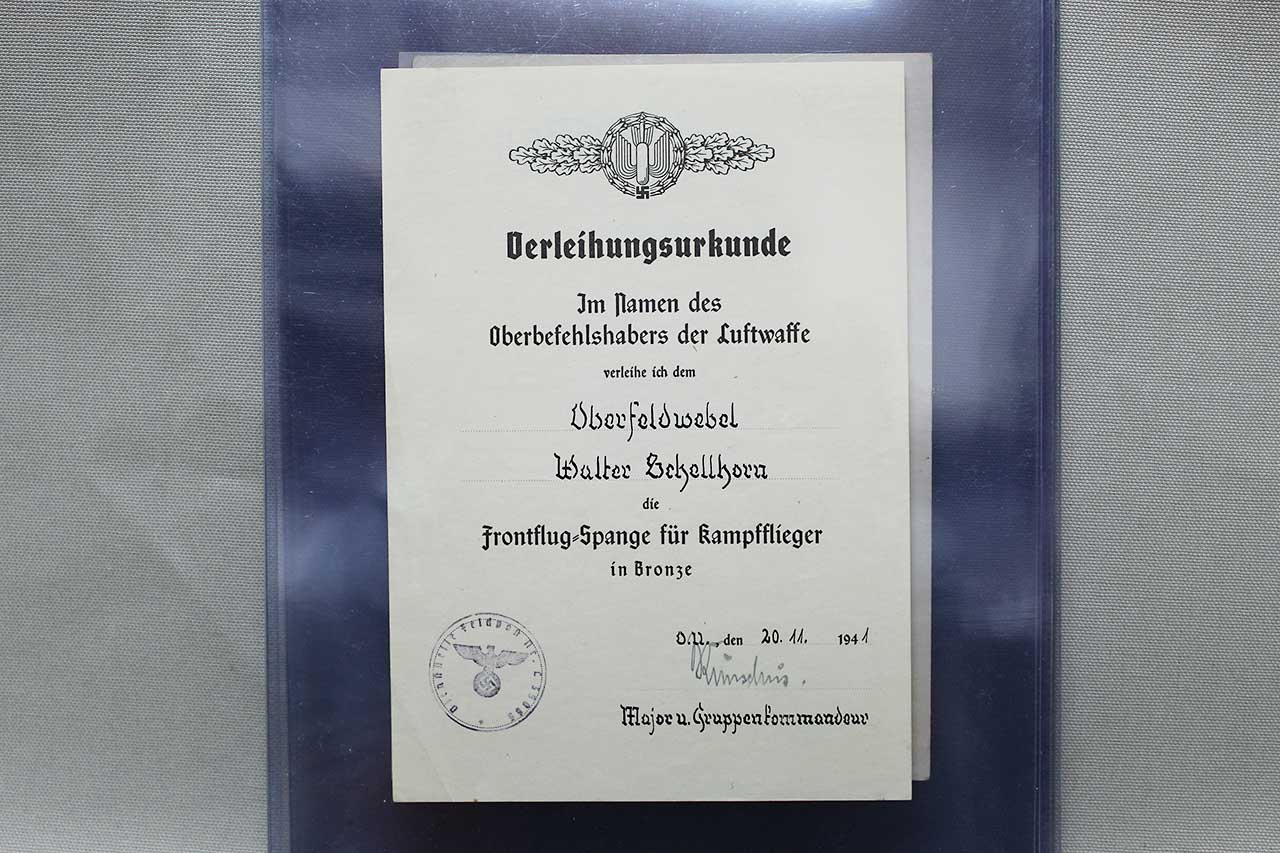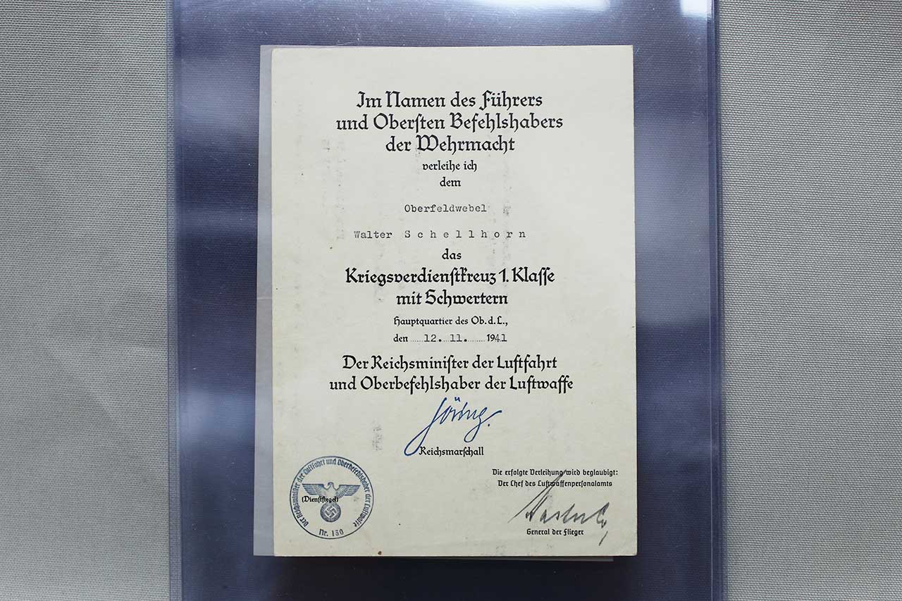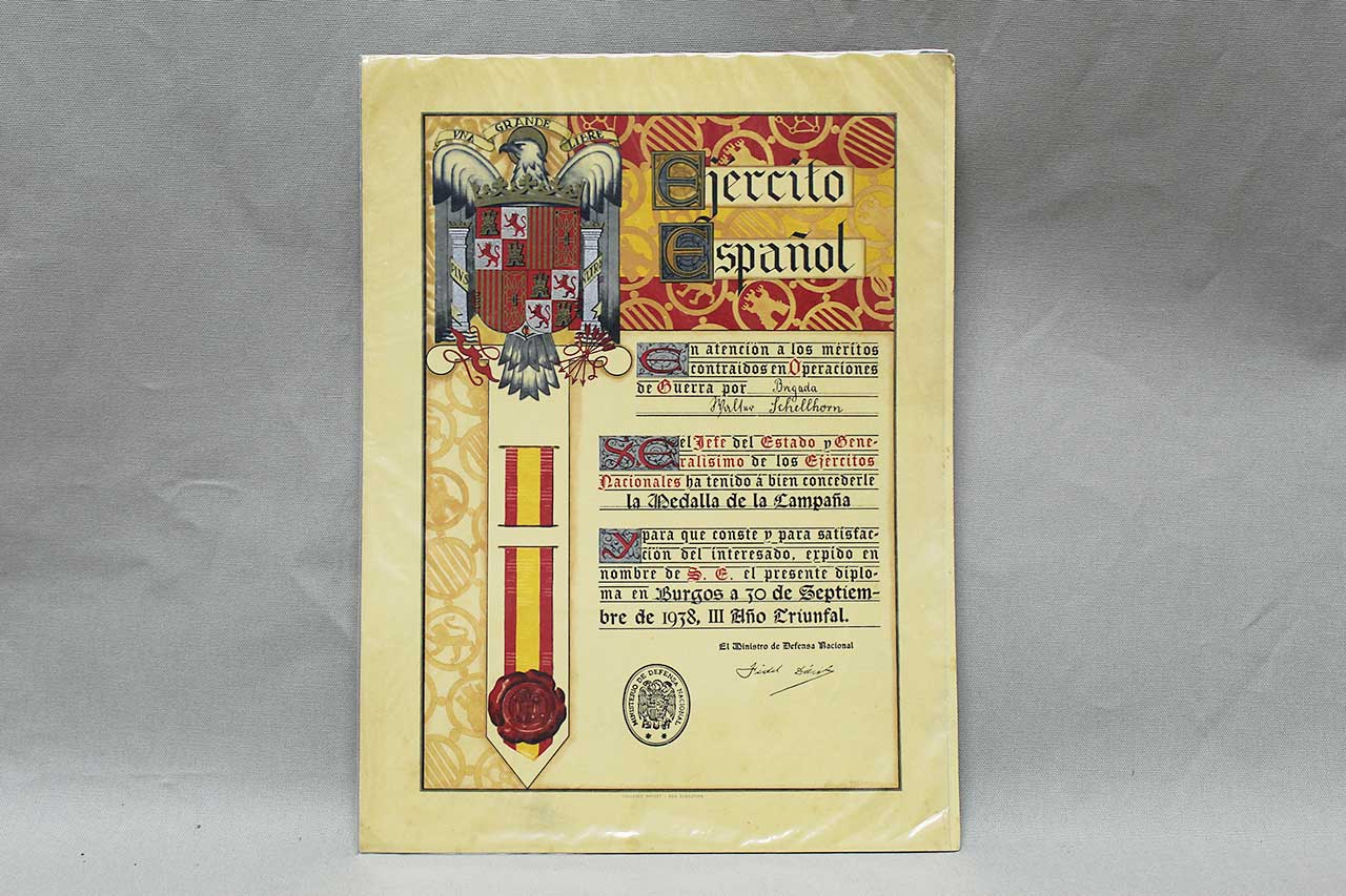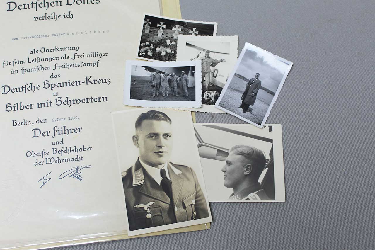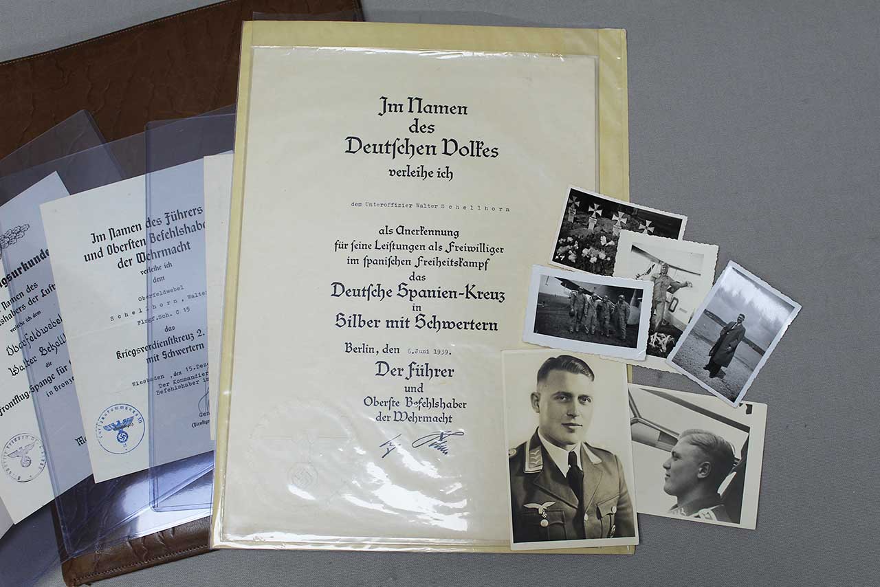 WW2 German Luftwaffe Pilot Group with a large leather documentation presentation holder along with several award documents to Luftwaffe Oberfeldwebel Walter Schellhorn. Group includes award documents for: WW2 German Spanish Cross in Silver with swords document dated Juni 1939 to Unteroffizier Walter Schenllorn; WW2 Iron Cross 1st class document dated 1942; War Merit Cross 2nd class with swords document dated 1940 to him as a Oberfeldwebel; War Merit Cross 1st class with swords document dated 1941 also as a Oberfeldwebel; Luftwaffe Bomber’s clasp in Bronze document dated 1941 as a Oberfeldwebel; A very colorful Spanish Civil War Campaign Medal 1936-1939 document dated 1938. Group also includes several period photos. A very nice group with an assortment of awards documents and pictures.
