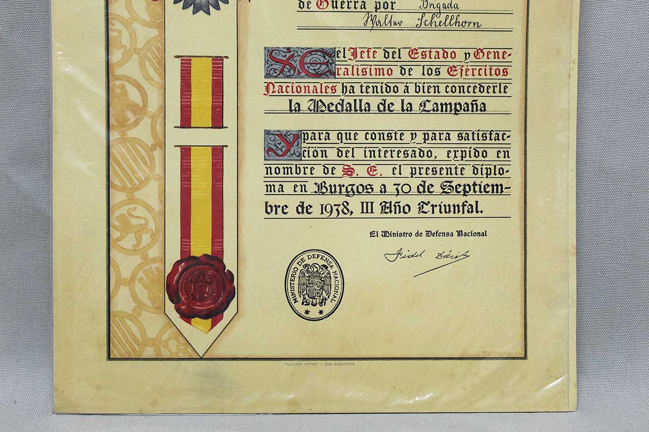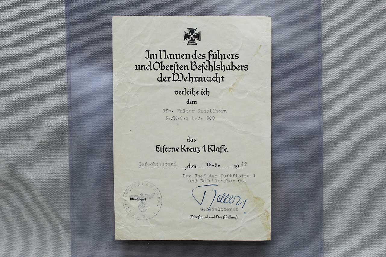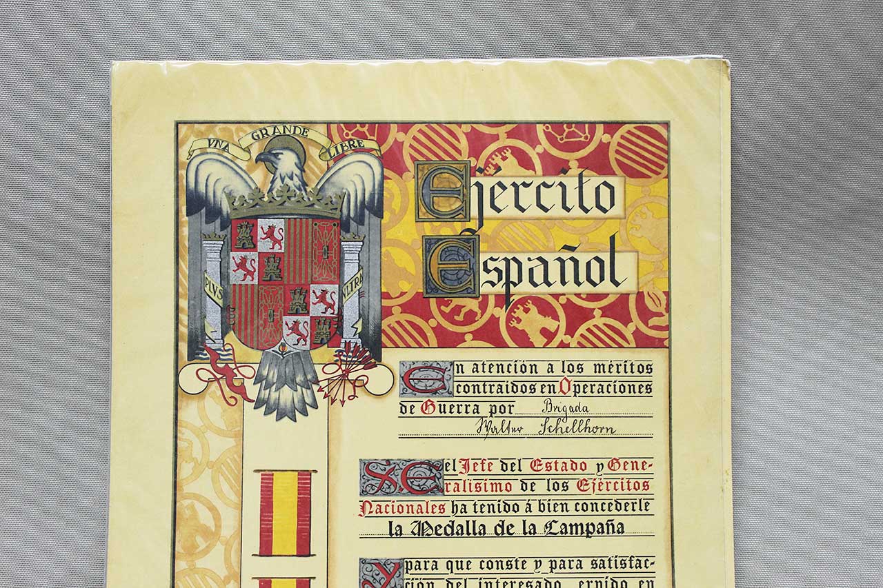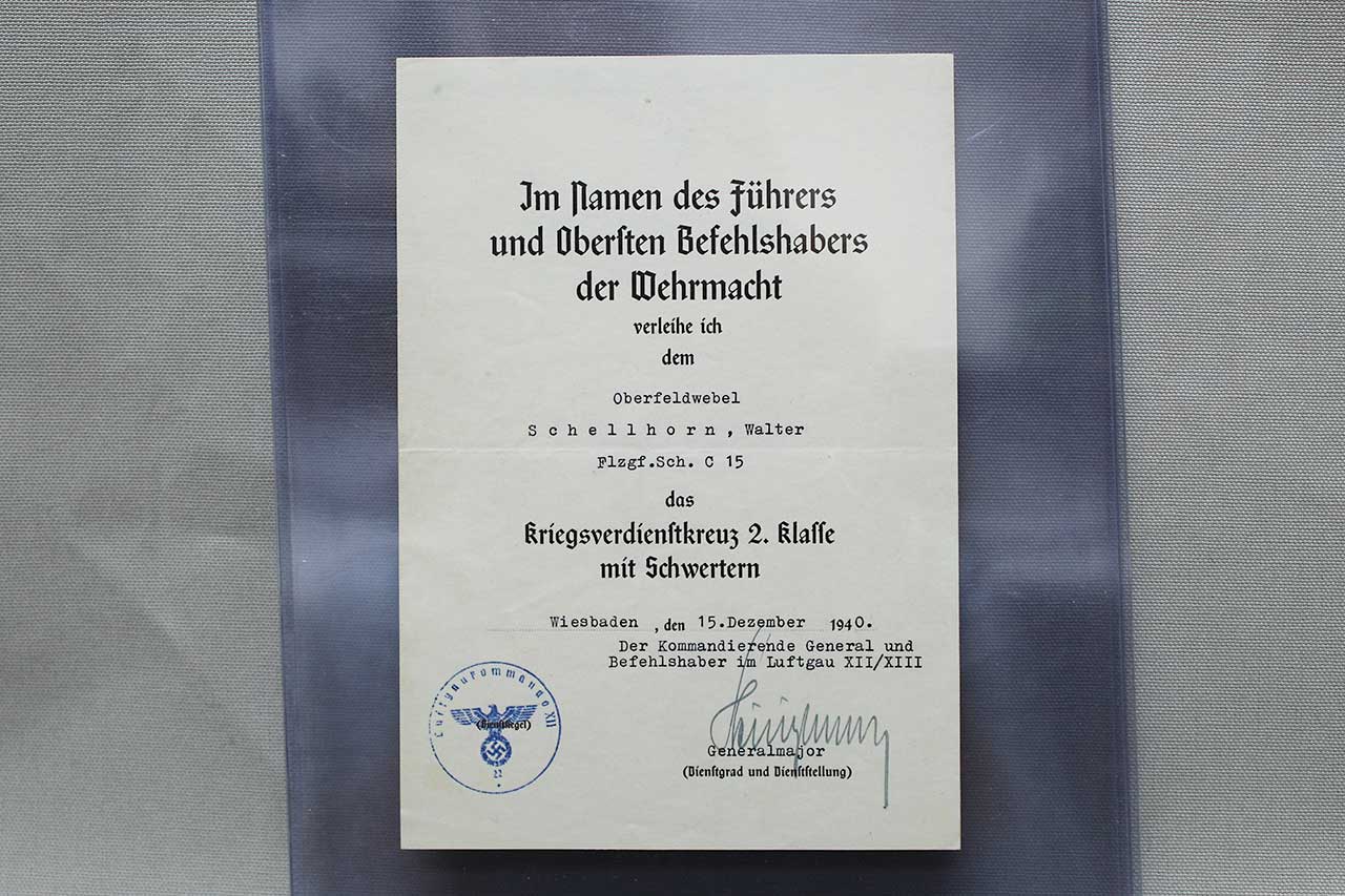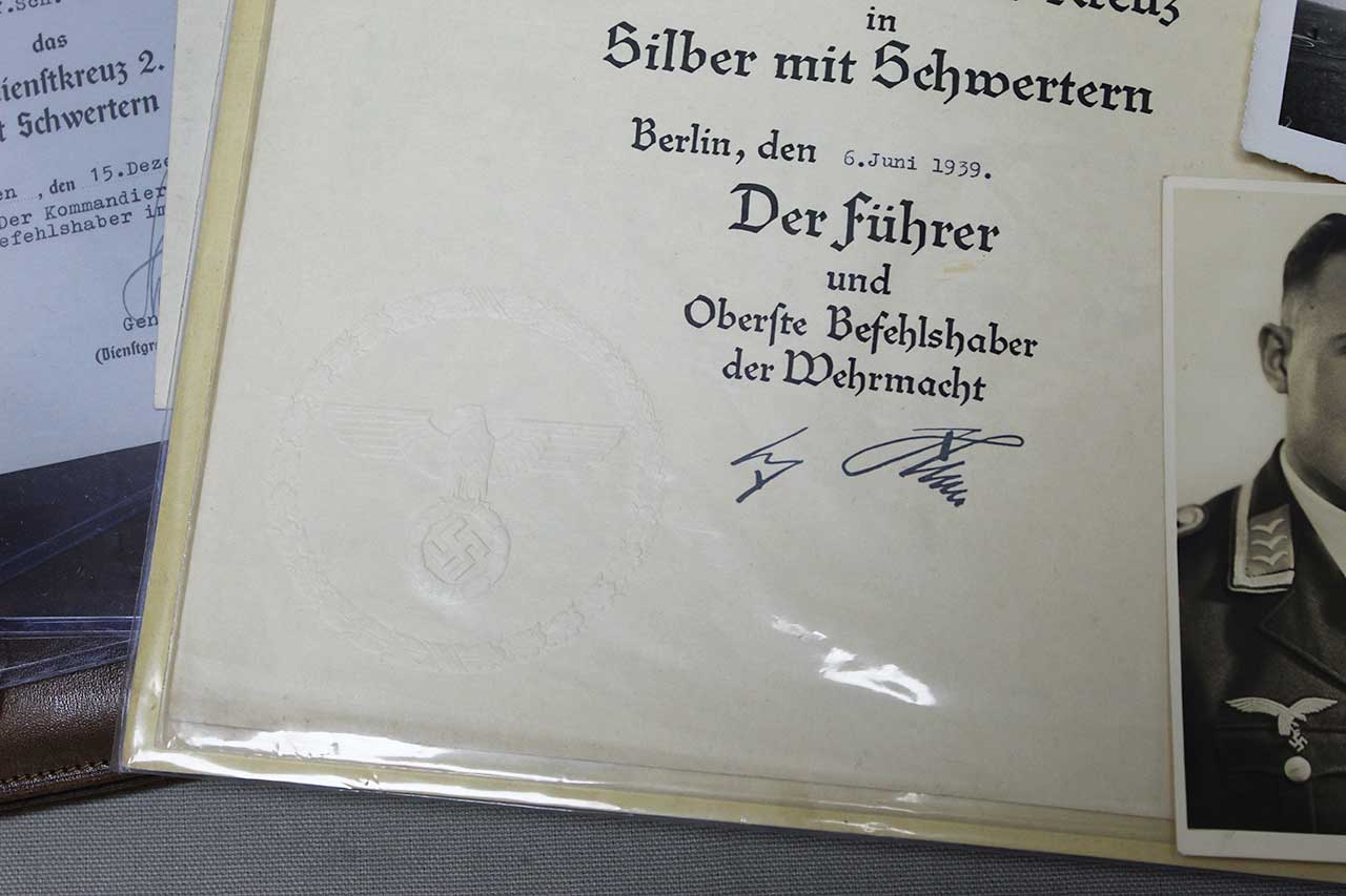 WW2 German Luftwaffe Pilot Group with a large leather documentation presentation holder along with several award documents to Luftwaffe Oberfeldwebel Walter Schellhorn. Group includes award documents for: WW2 German Spanish Cross in Silver with swords document dated Juni 1939 to Unteroffizier Walter Schenllorn; WW2 Iron Cross 1st class document dated 1942; War Merit Cross 2nd class with swords document dated 1940 to him as a Oberfeldwebel; War Merit Cross 1st class with swords document dated 1941 also as a Oberfeldwebel; Luftwaffe Bomber’s clasp in Bronze document dated 1941 as a Oberfeldwebel; A very colorful Spanish Civil War Campaign Medal 1936-1939 document dated 1938. Group also includes several period photos. A very nice group with an assortment of awards documents and pictures.