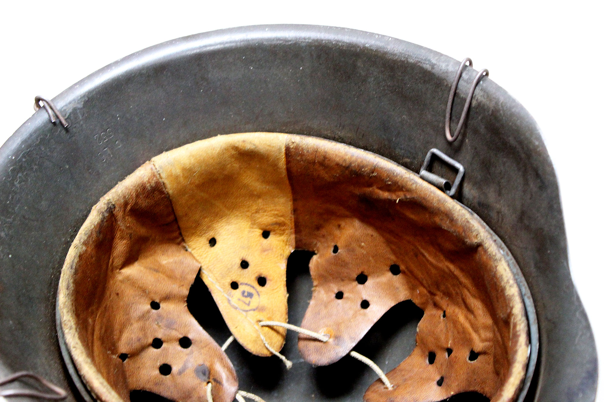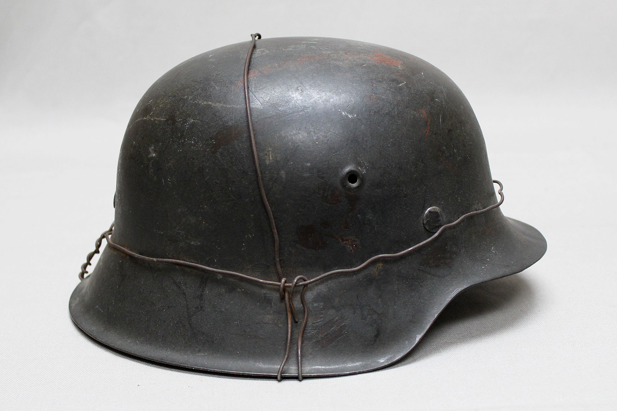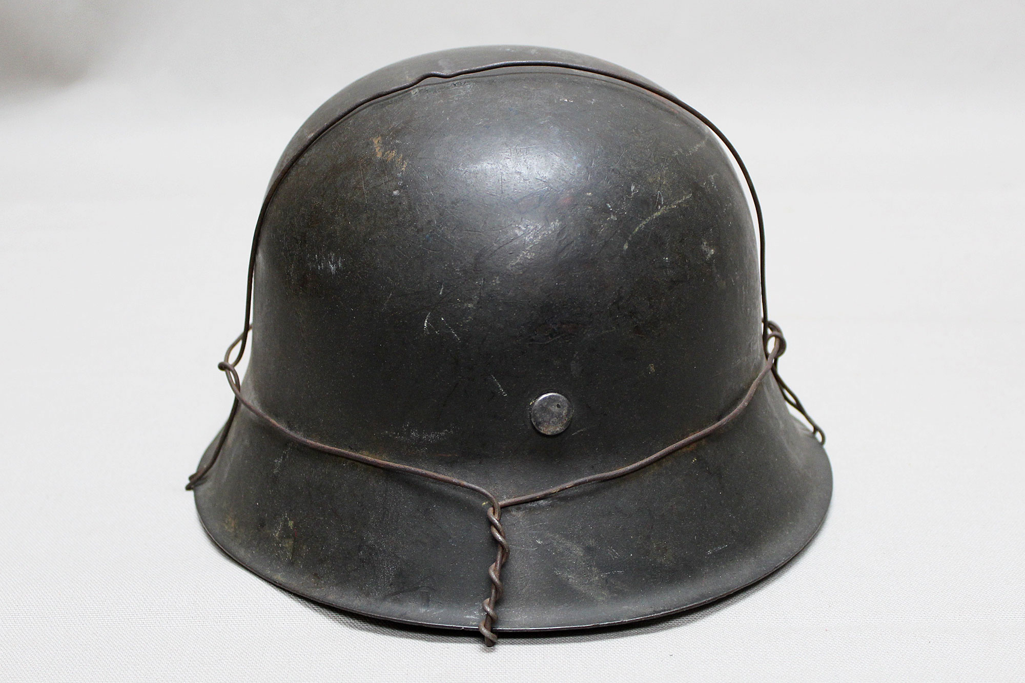WW2 German Army M42 Combat Helmet with Single Wire type camo. Exterior paint in good condition and wire displays nicely on helmet. Size and marker mark appears to be ckl64 (the “4” is very light). Production/Lot # appears to be 552 (there might be a number after the 2, however, very light and hard to make out if it is actually something there). Spliced liner (you can see the one lighter finger that is spliced in) is in good overall condition and is ink size stamped 57 and has drawstring. Interior of helmet has ink dome stamped. Overall, a nice looking M42 Army combat helmet that displays well.