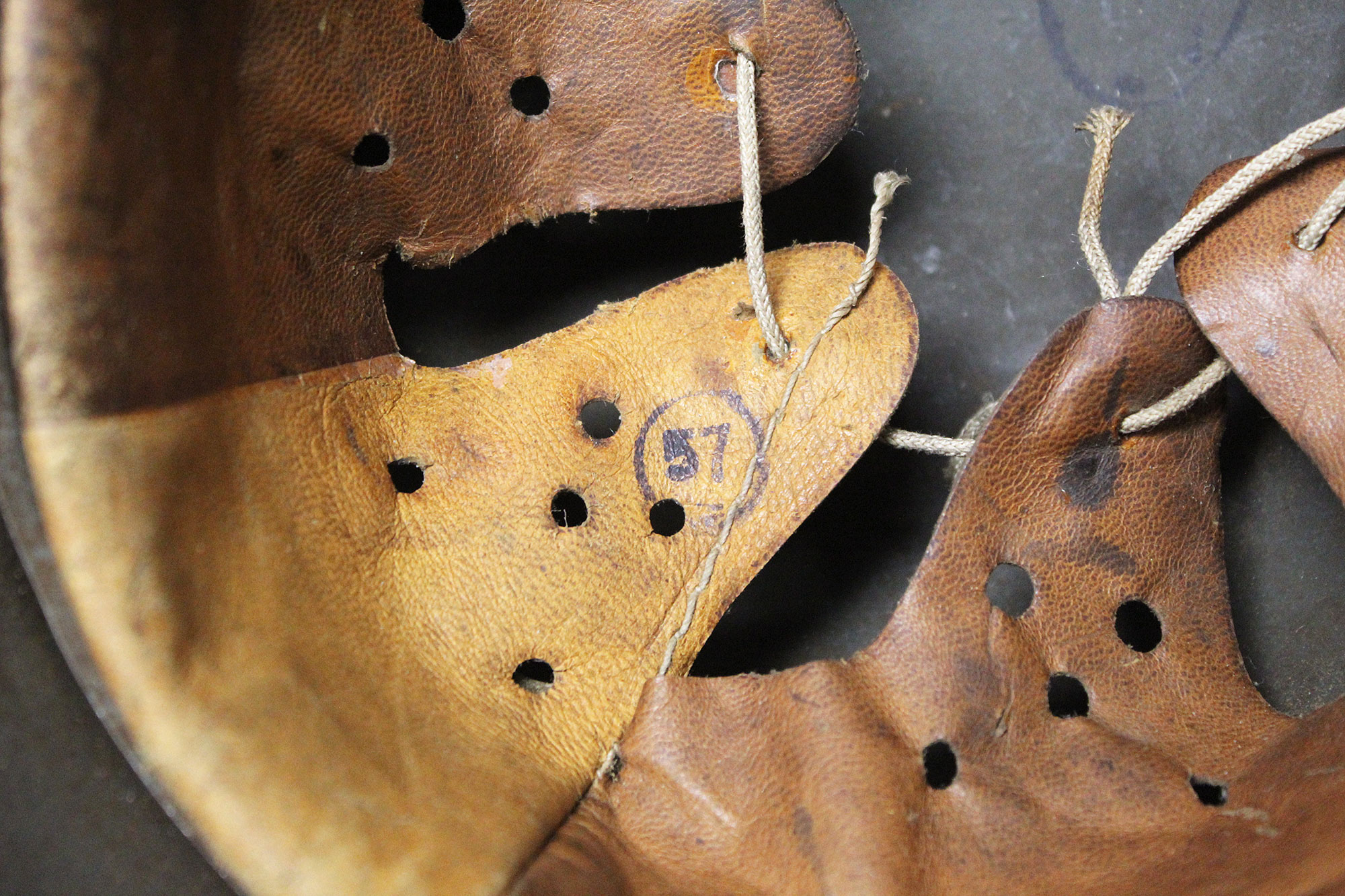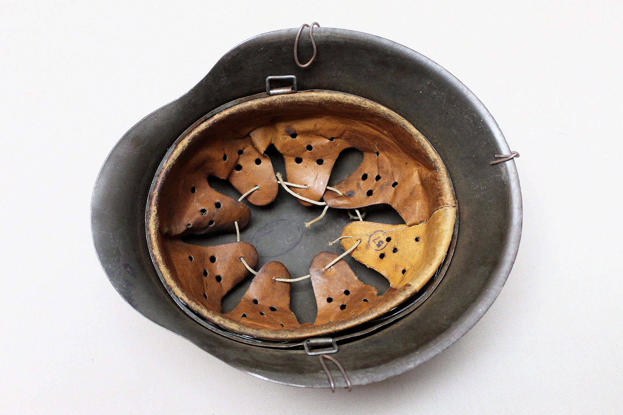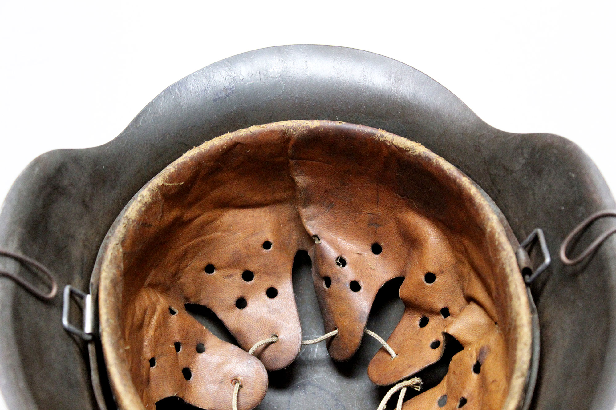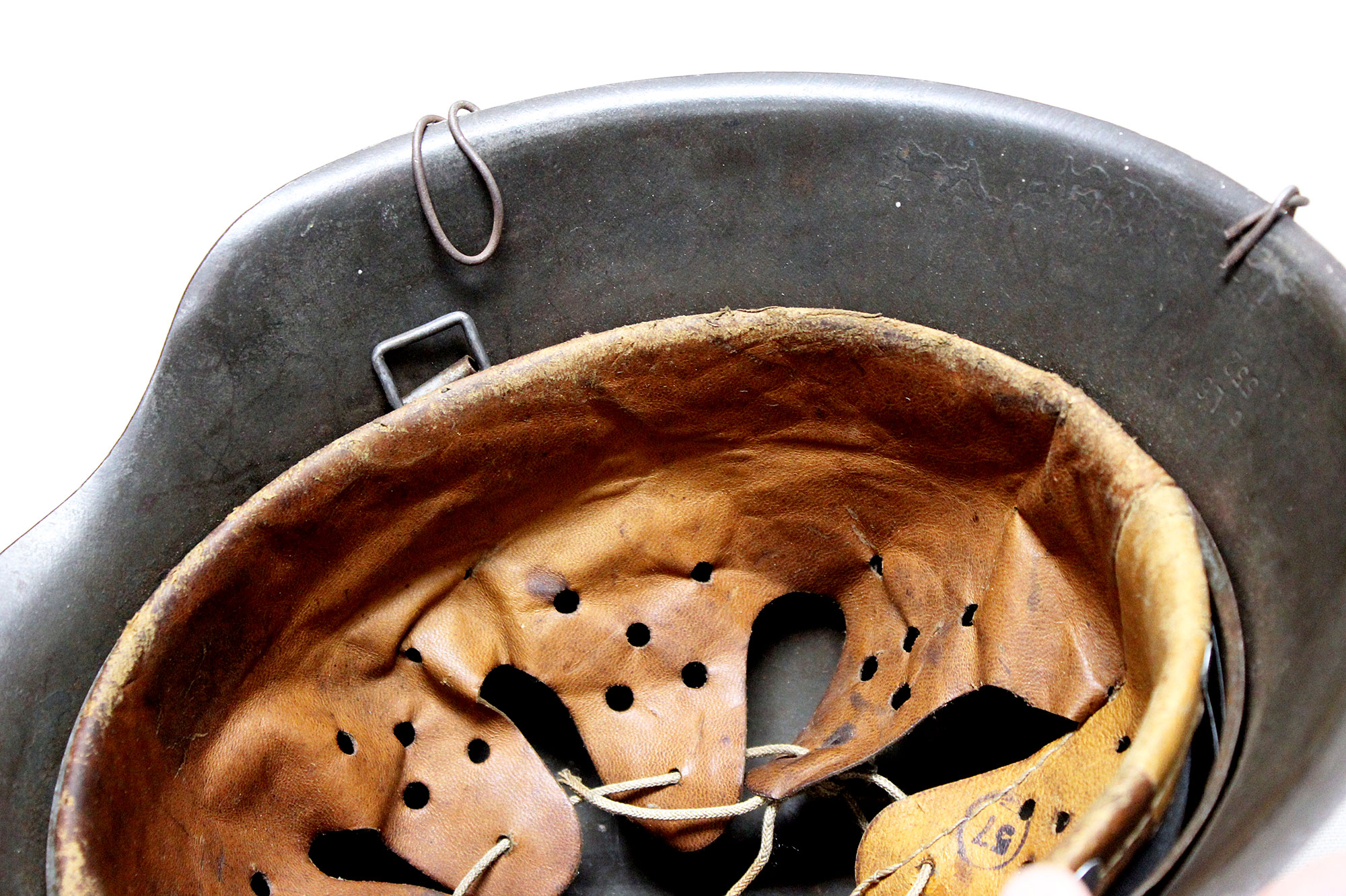 WW2 German Army M42 Combat Helmet with Single Wire type camo. Exterior paint in good condition and wire displays nicely on helmet. Size and marker mark appears to be ckl64 (the “4” is very light). Production/Lot # appears to be 552 (there might be a number after the 2, however, very light and hard to make out if it is actually something there). Spliced liner (you can see the one lighter finger that is spliced in) is in good overall condition and is ink size stamped 57 and has drawstring. Interior of helmet has ink dome stamped. Overall, a nice looking M42 Army combat helmet that displays well.