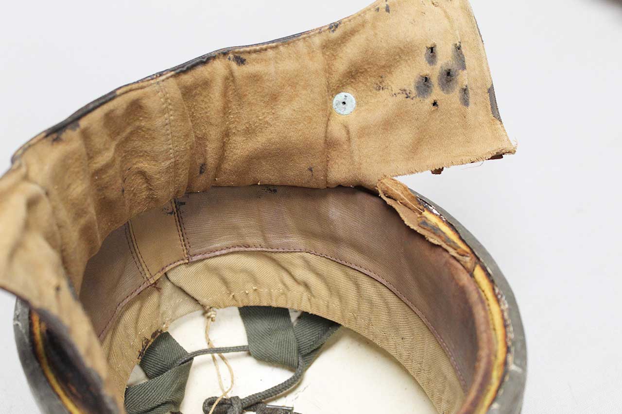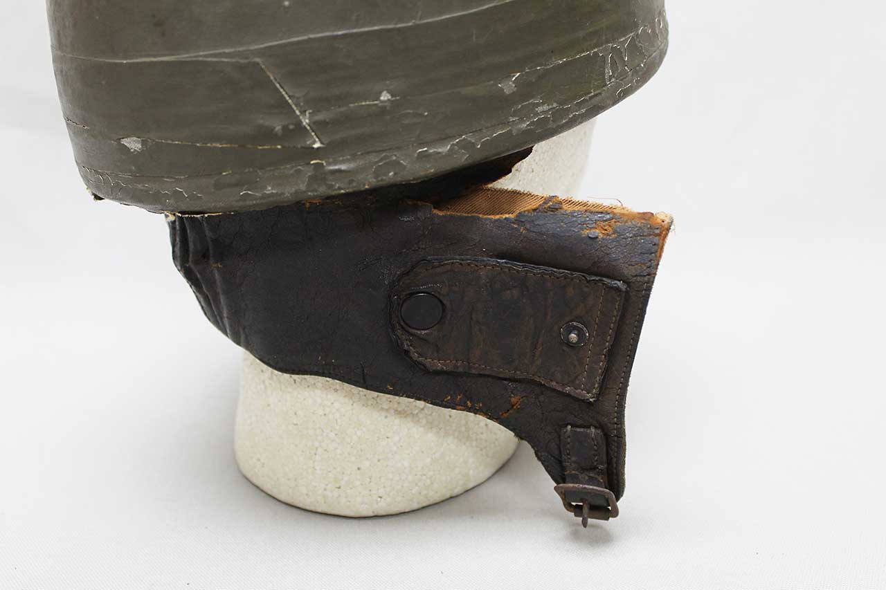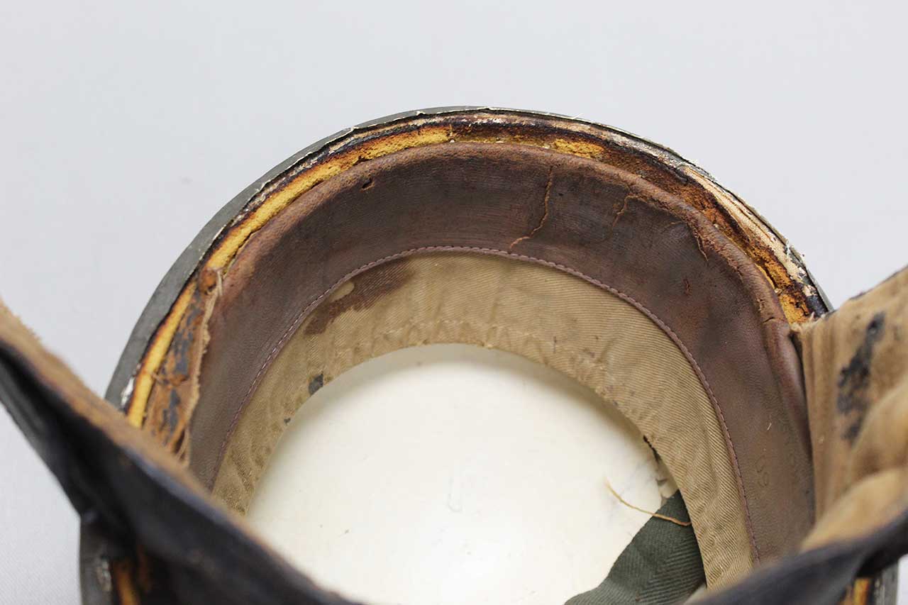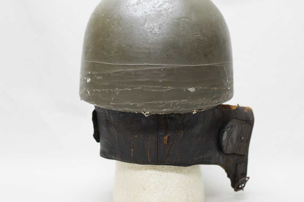 Canadian Dispatch Rider Helmet. Marked “60 NO 102” on the interior leather sweatband. Appears to be made out of some type of fiber like material. Missing some of the liner, mostly the center portion area. Heavily worn condition with rip area near where the neck flap folds into the helmet and heavy wear to interior.