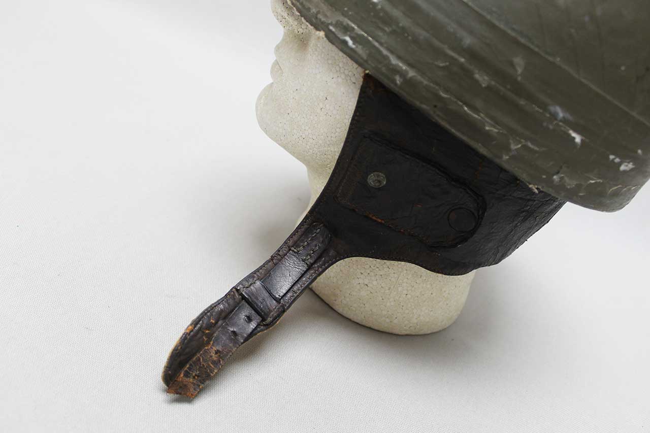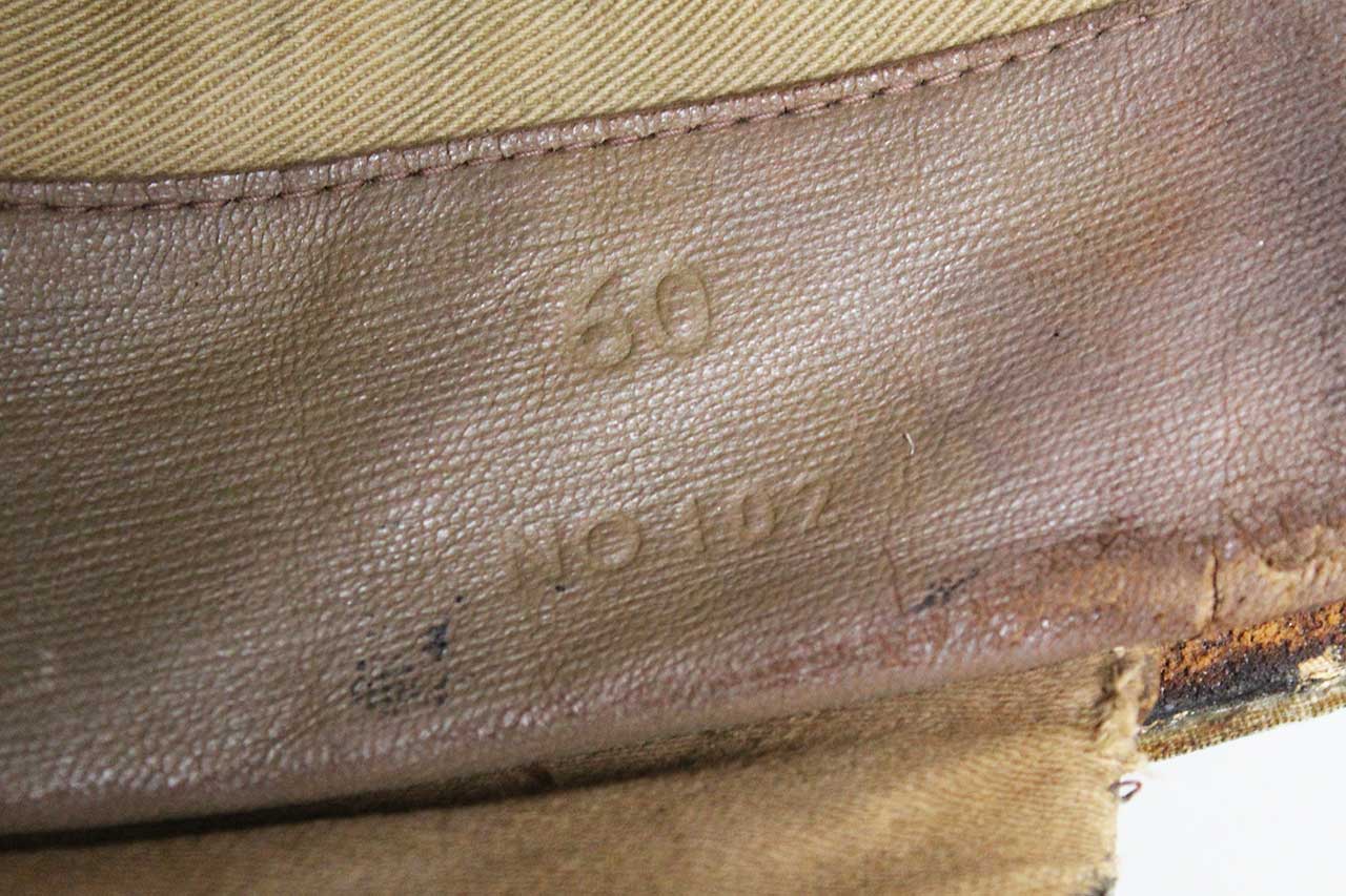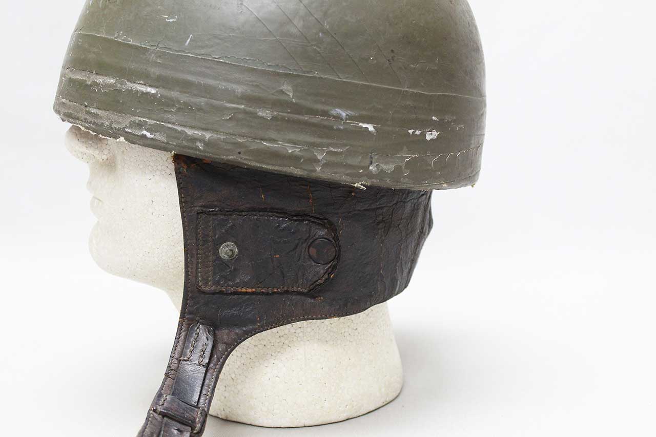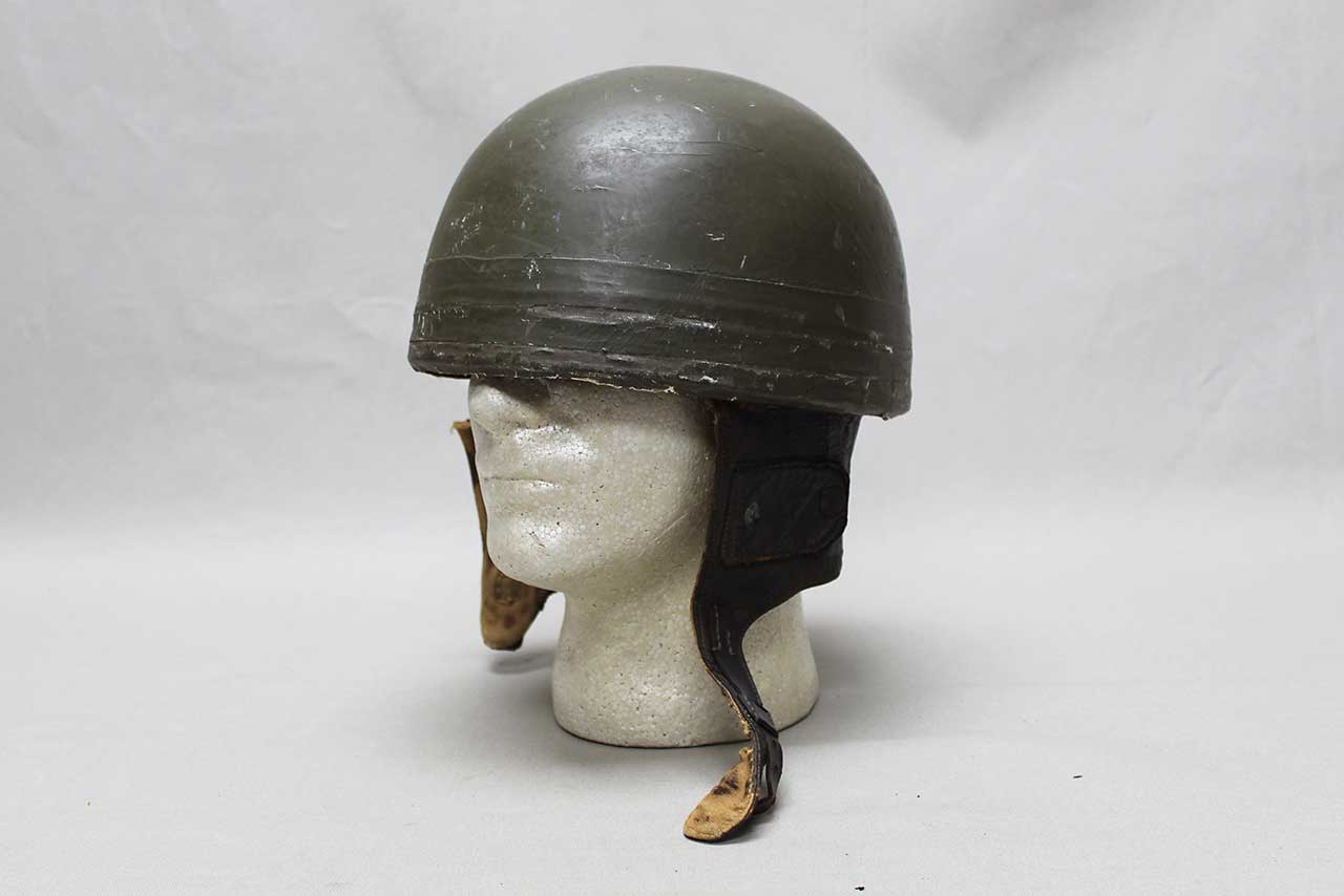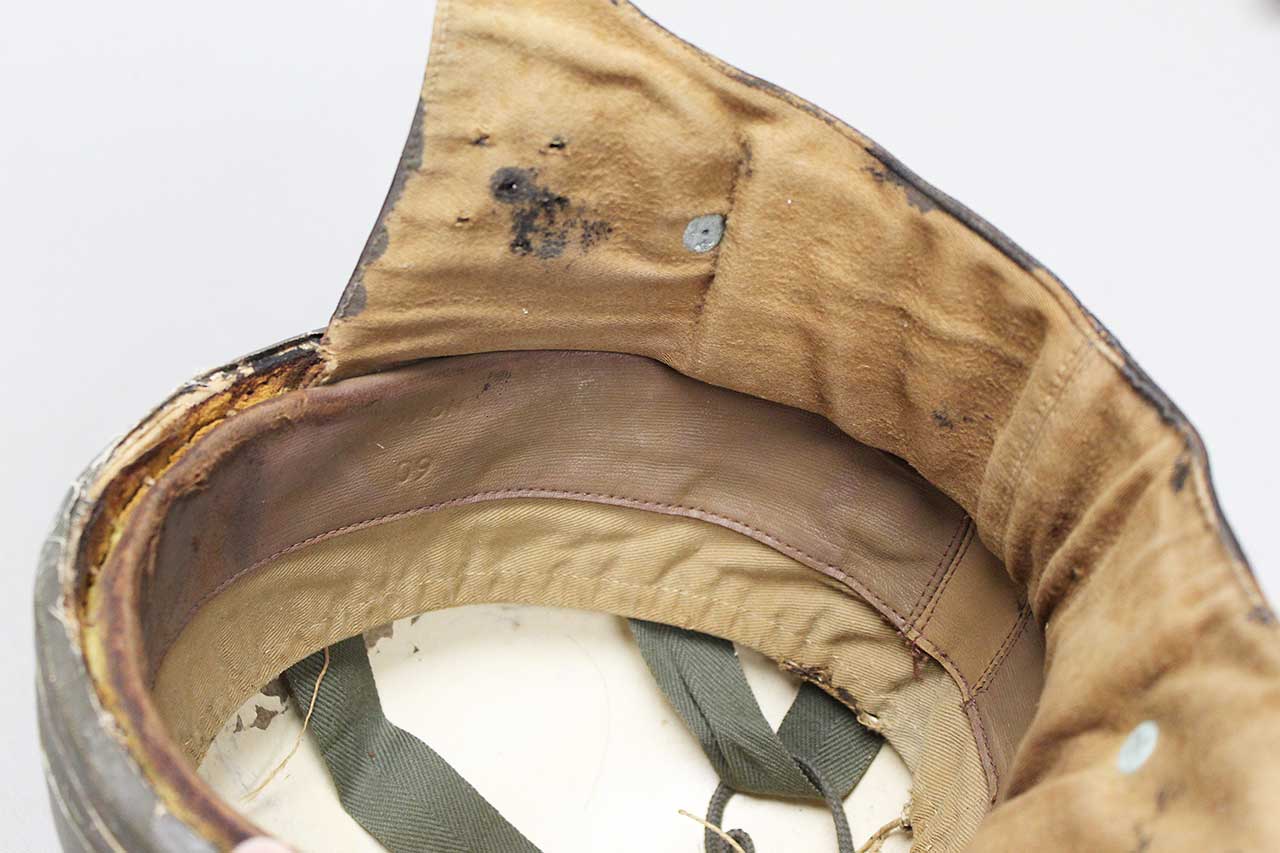 Canadian Dispatch Rider Helmet. Marked “60 NO 102” on the interior leather sweatband. Appears to be made out of some type of fiber like material. Missing some of the liner, mostly the center portion area. Heavily worn condition with rip area near where the neck flap folds into the helmet and heavy wear to interior.