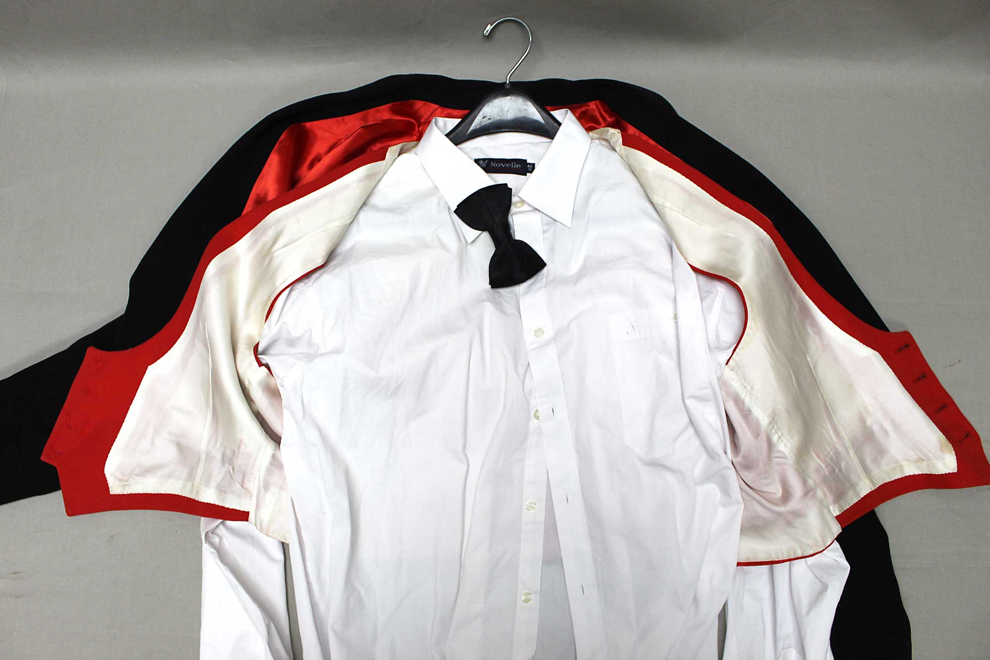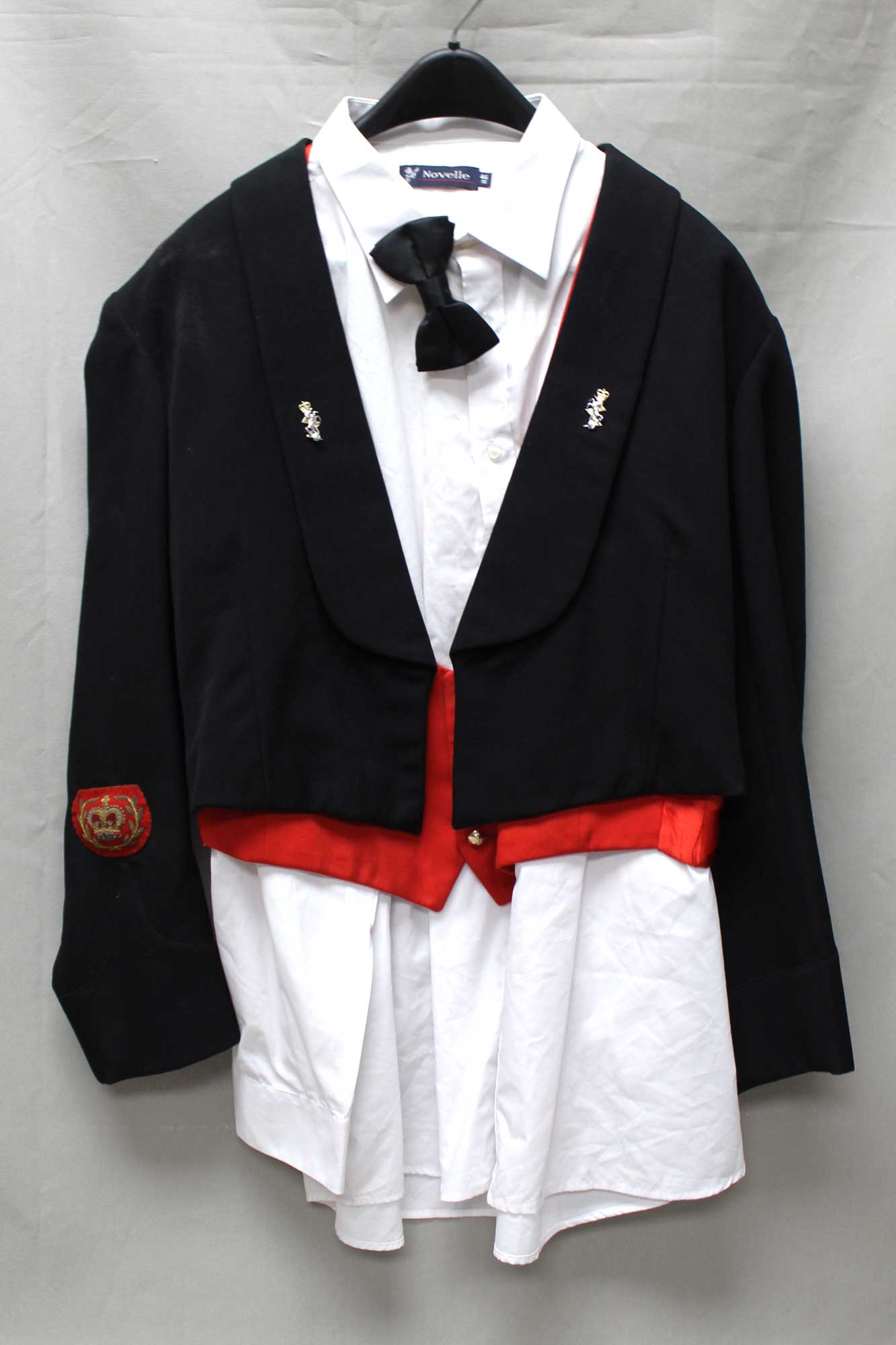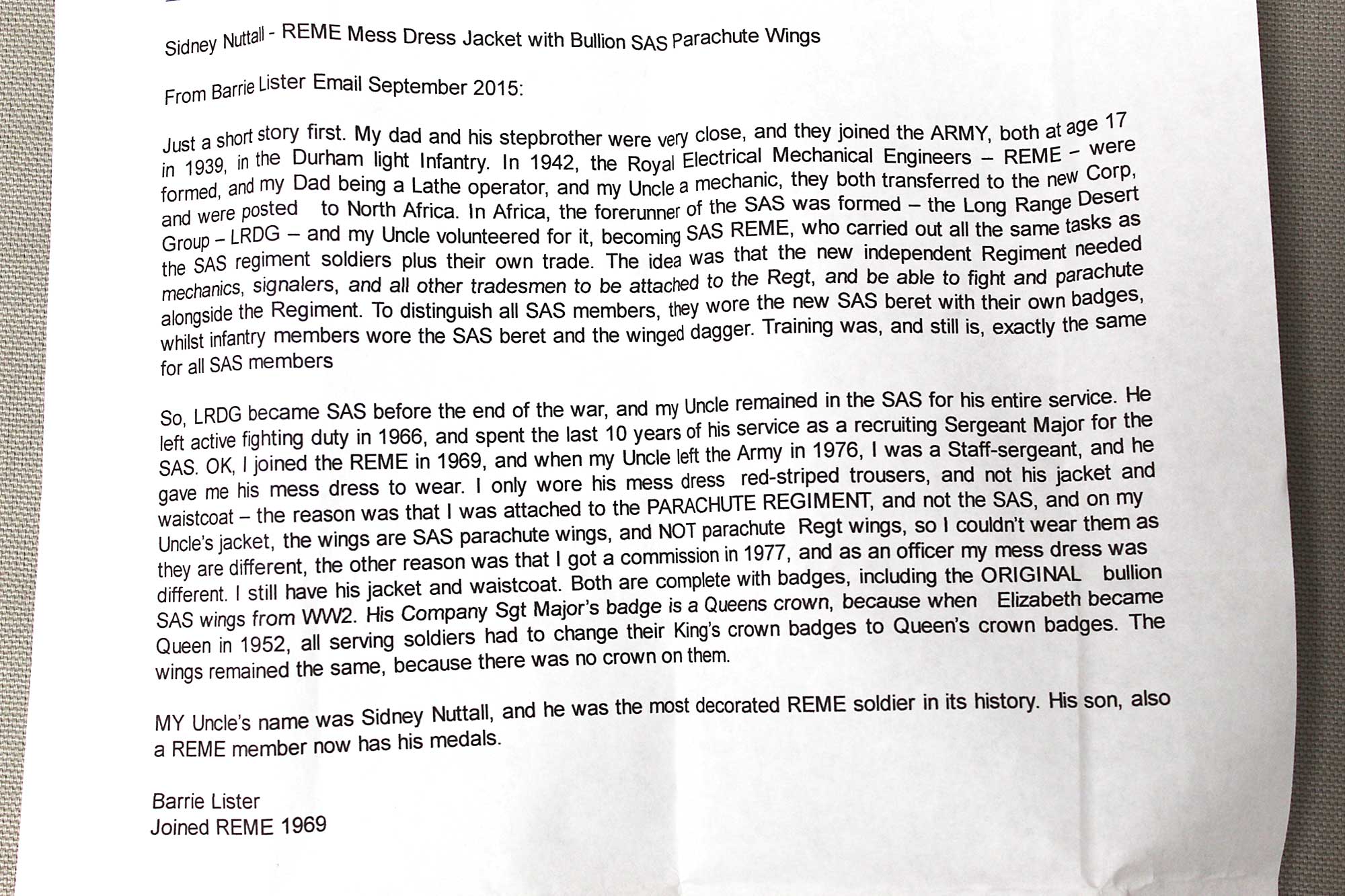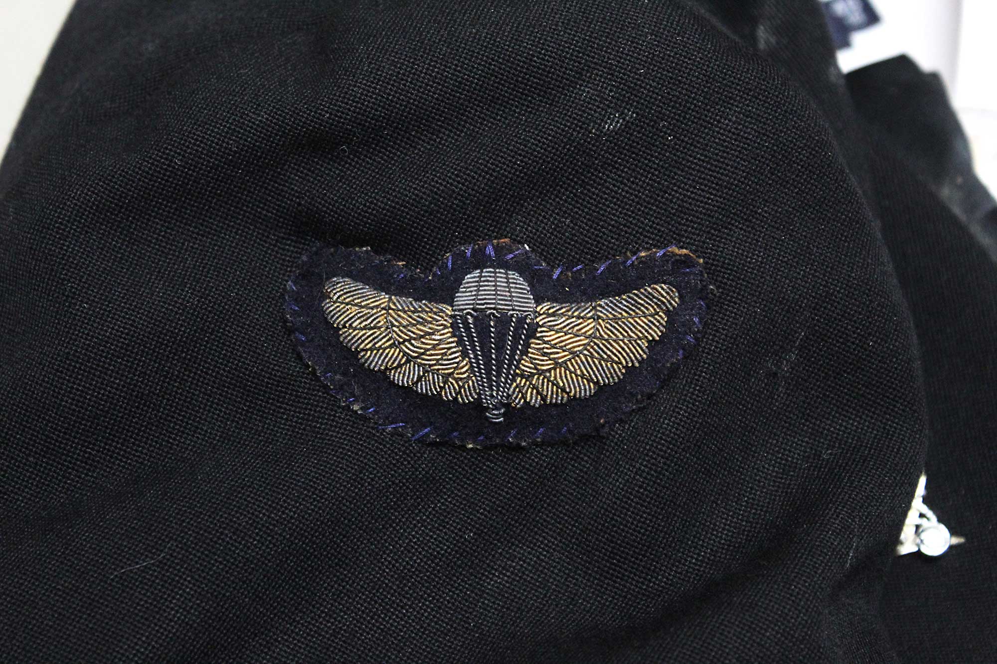 British Military Dress Jacket. Has British Bullion SAS Parachute Wings on sleeve. Also, has bullion crown insignia on sleeve. Group also has shirt, tie, and vest. Also, comes with information from family member with unofficial provenance to Sidney Nuttall REME. Worn condition.