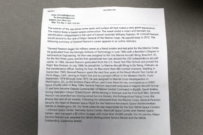 United States Marine Corps (USMC) Officer Visor Cap. The exterior of the cap shows some spots annd surface dirt, however, display well. The interior body is basket weave construction. Marker marked in dome area: “Headwear by Great Norther Union Made Phila. Pa”. The sweat shield is intact and beneath the identification compartment is the card of Colonel Jeremiah Williams Pearson, III. Colonel Pearson would ascend to the rank of Major General of the Marine Corps. He passed away in 2012. Below is a summary of General Pearson’s career as it appears in an online obituary.