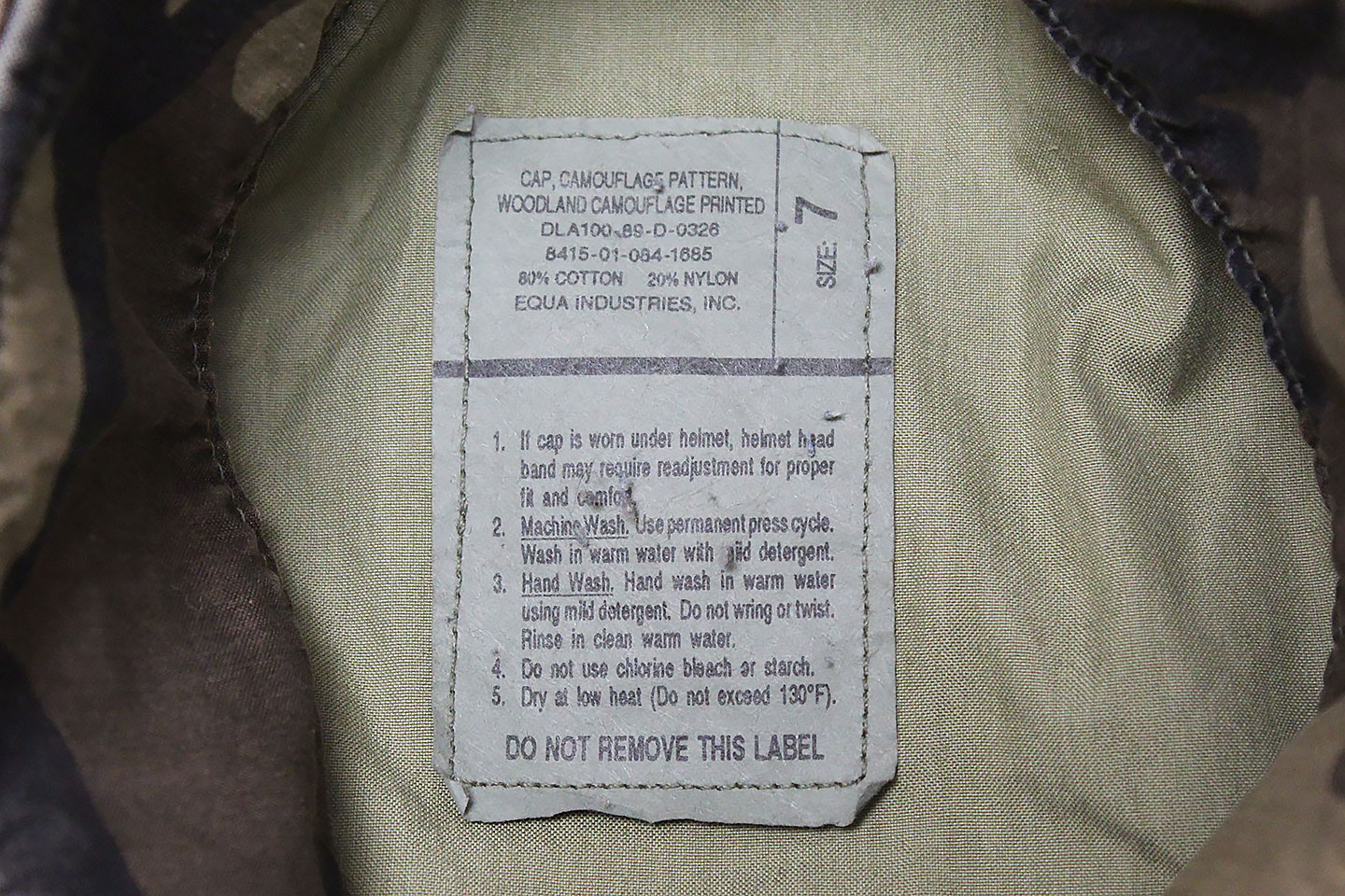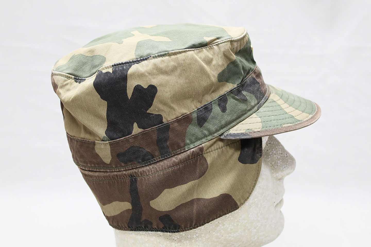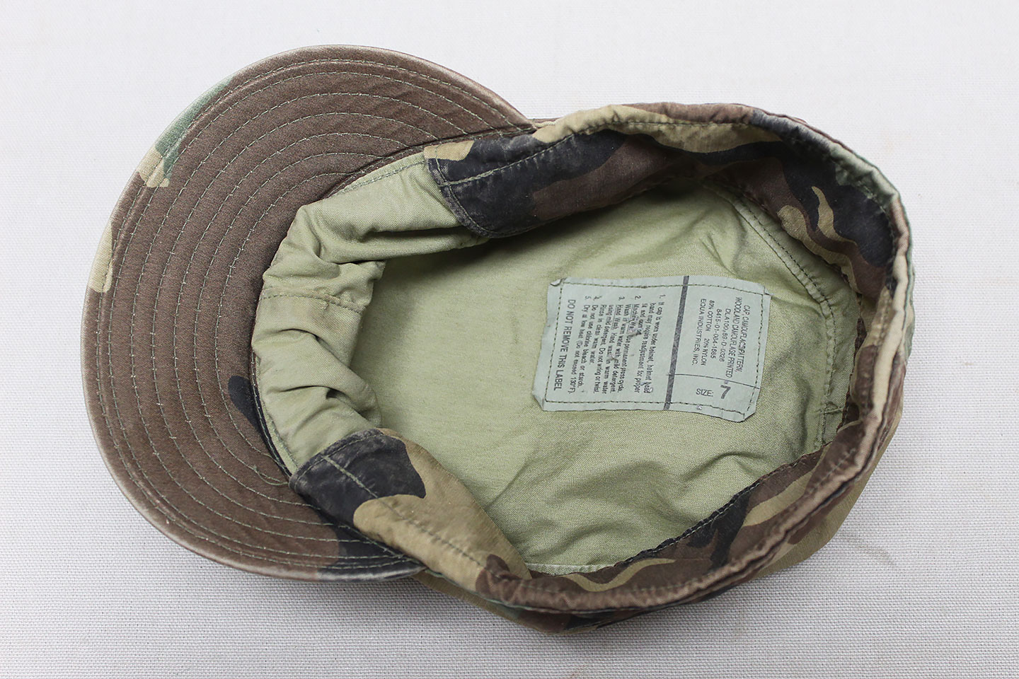 U.S. Army BDU (Woodland Camo) Cap with Veteran Pin on front of cap. Tag is contract dated 1989 and size marked 7. Worn and used condition.