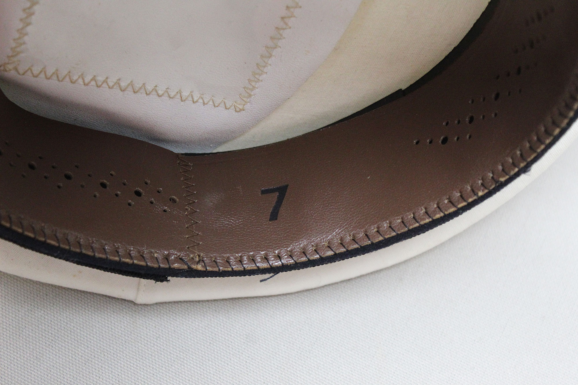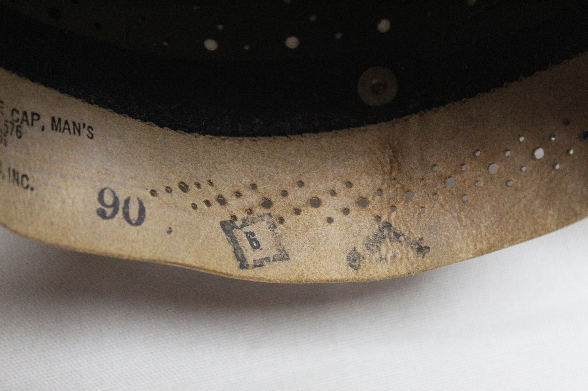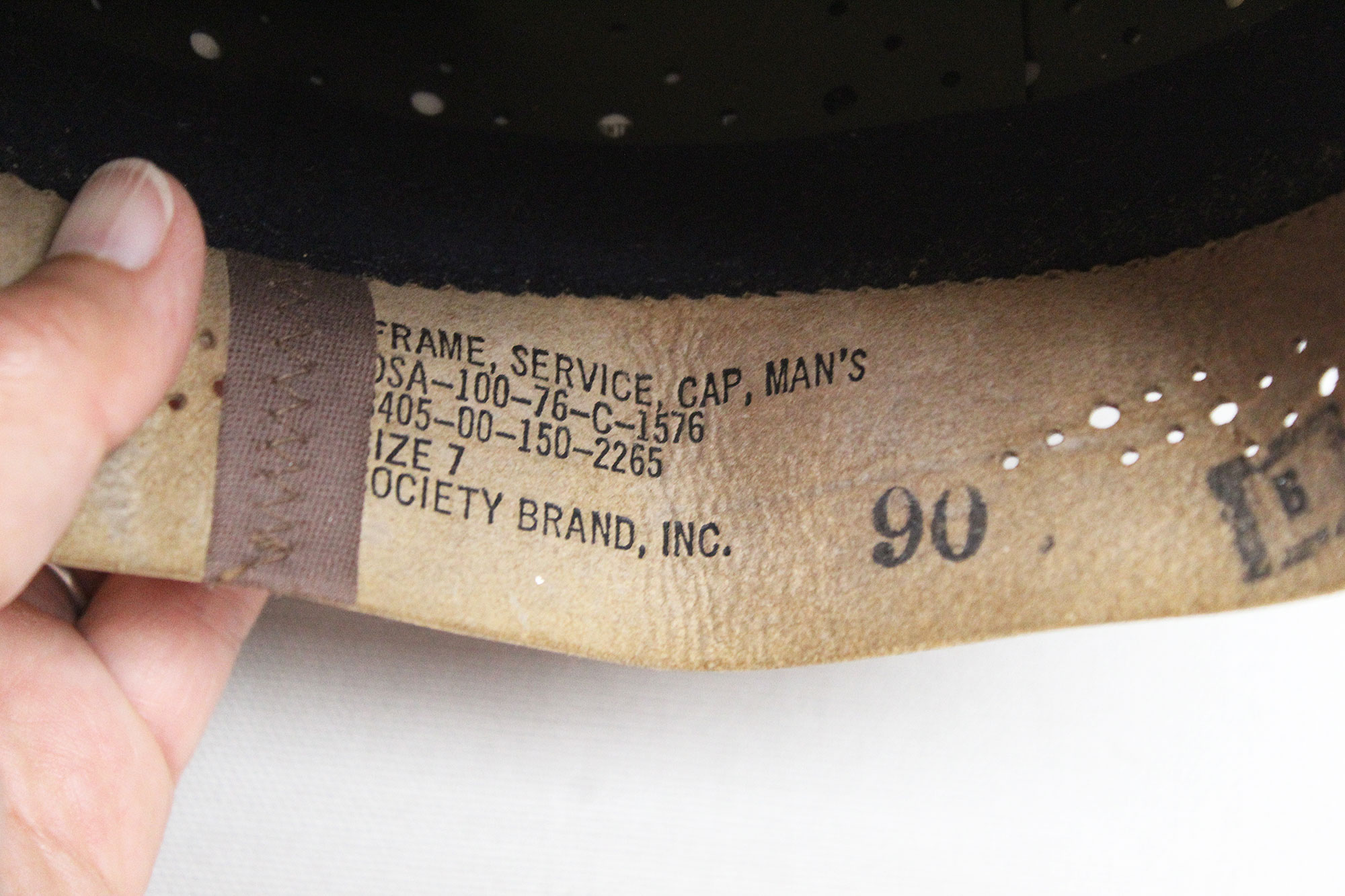 United States Navy Officer White Top Visor Cap. Size 7 marked on sweatband. Also, under sweatband is size marked 7 and contract dated DSA-100-76-c for contract date of 1976. Worn condition.