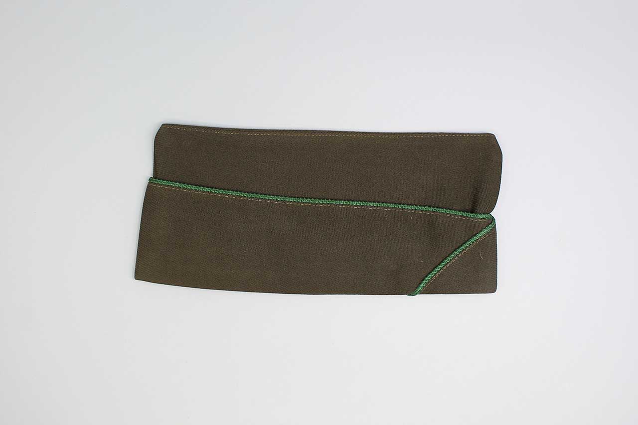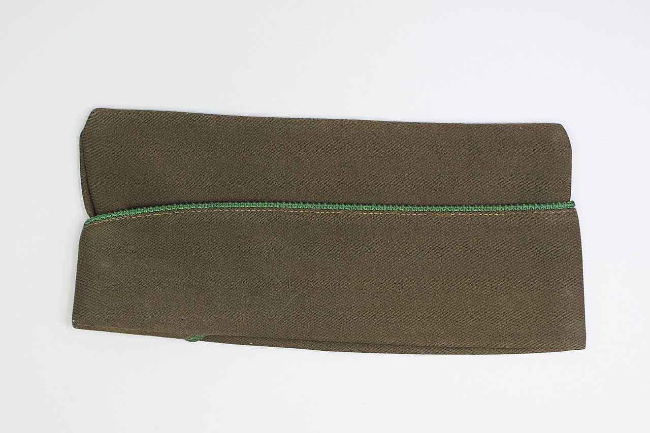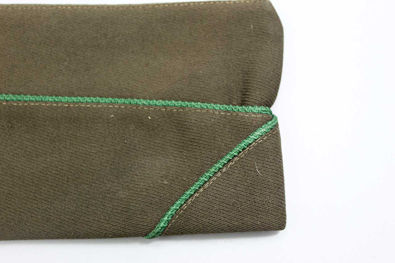 Additional Notes: For garrison caps, there were two basic styles, the PX (Post Exchange) style and the Issue style. The PX style has squared ends to the garrison cap. The PX style caps were typically purchased privately by soldiers and sold in the PX’s, department stores, and tailor shops around the country. This PX style is rectangular in appearance and does not have the pleat in the top as seen in the Issue style caps. The Issue style cap was issued to all troops by the Quartermaster of the U.S. Army. The Issue style caps have a pleated top and is similar in profile to the cap worn in World War I. The top curves upward from the rear and slopes downward toward the front. Both PX and Issue style caps were widely worn and both are equally correct for display and use.
