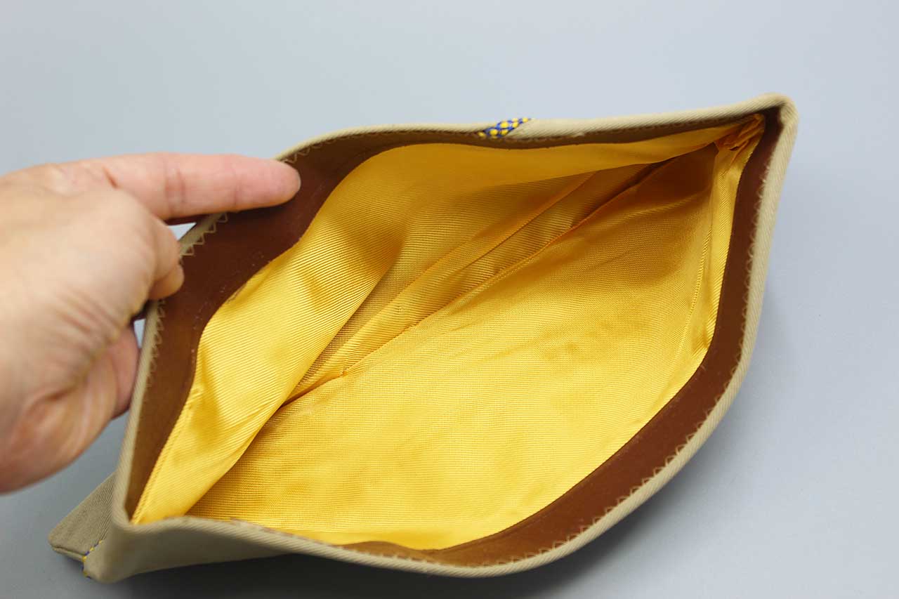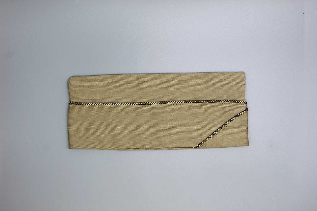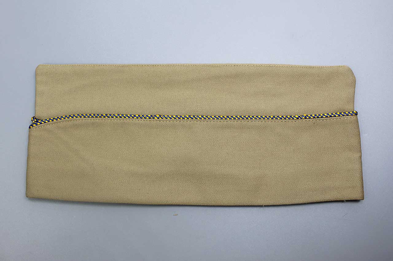United States Army Tropical (Khaki) Garrison Cap. Appears to be Army Chemical Warfare Service Piping (Cobalt Blue and Golden Yellow). Size (Lot/Price) tag on interior marked 7 3/8. PX style cap. Most likely 1940s-1950s (ww2-Korea) era. Worn condition.