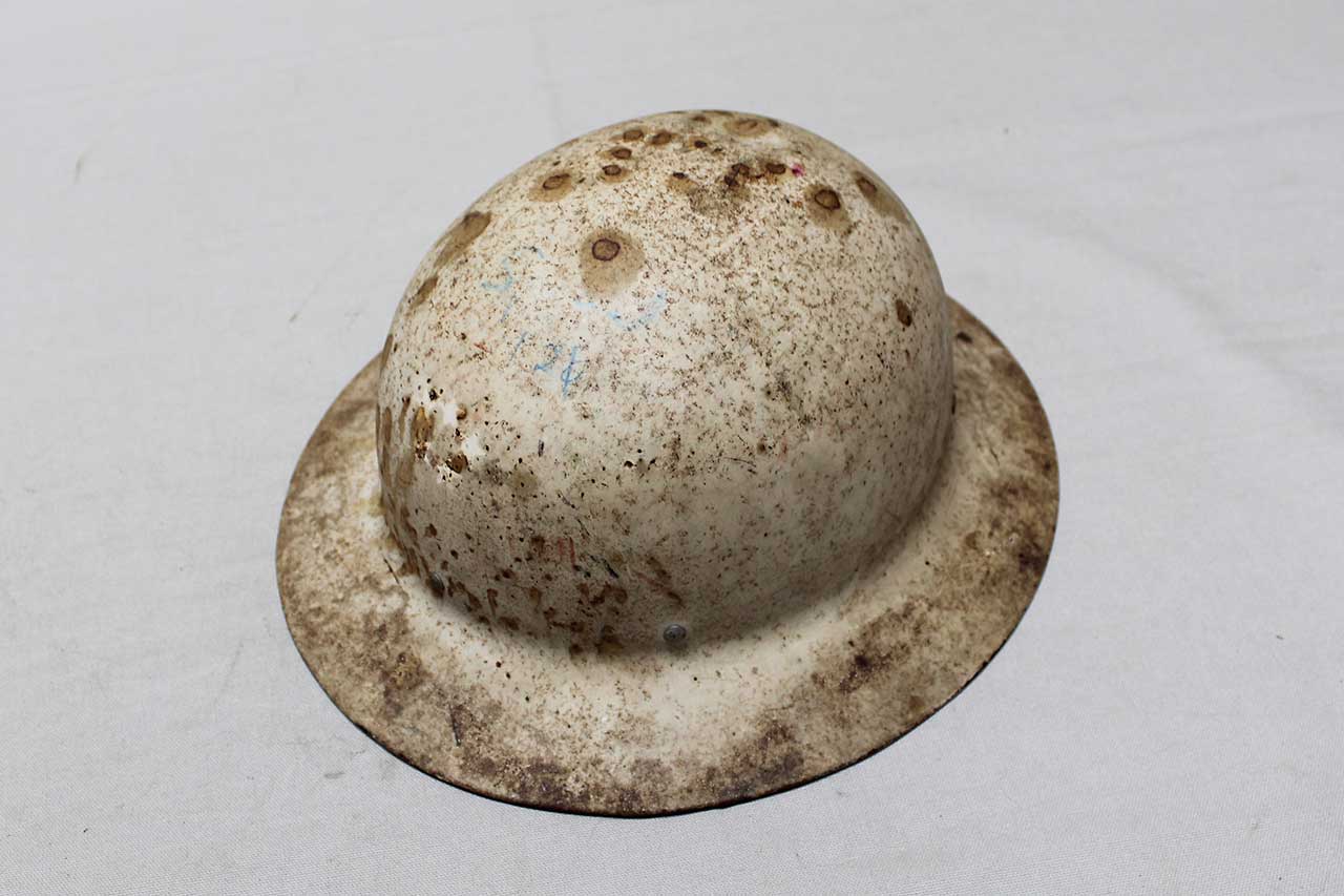 United States Civil Defense helmet. Most likely 1940s (ww2) era. Exterior of helmet very heavily worn condition with no insignia on exterior of helmet and some ink writing on exterior. Interior of helmet marked U.S. Govt Property O.C.D. on interior rim. Interior has very worn condition liner straps. No chinstrap. Very heavily worn condition.