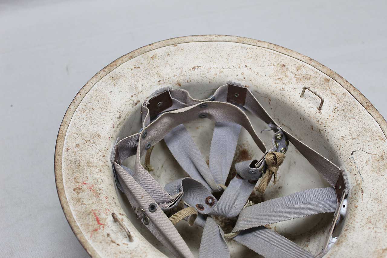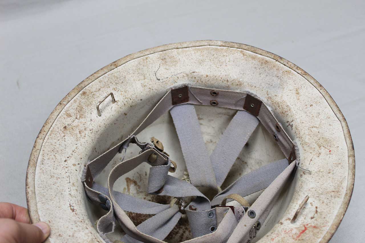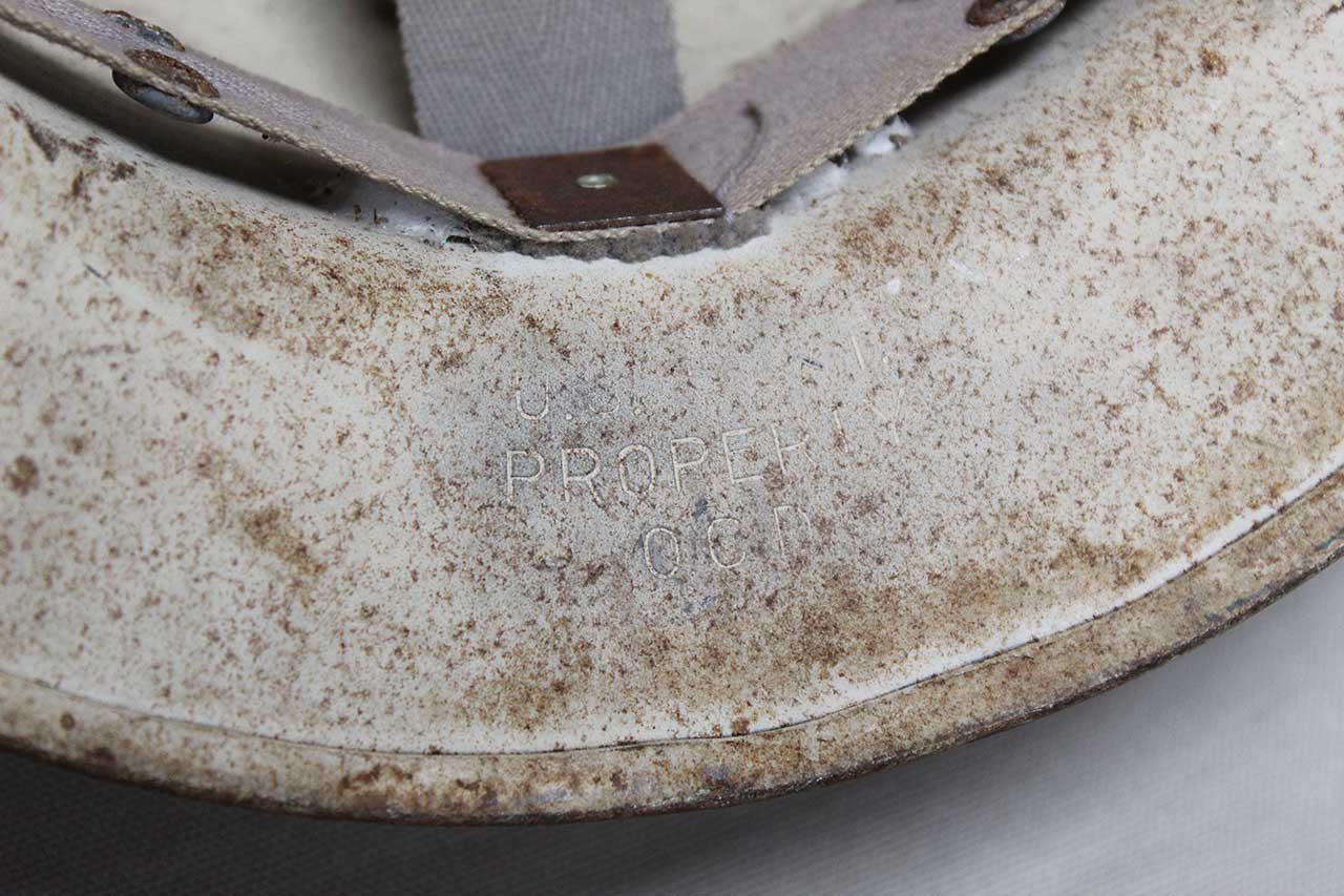 Additional Notes: During WW2, the United States Civil Defense helmets were issued to air raid wardens and other civil defense personnel. These helmets were typically white and could feature a selection of Civil Defense emblems on the front. They were used in drills and emergency situations to help coordinate civilian protection efforts. The Office of Civilian Defense (O.C.D.) oversaw civil defense initiatives, organizing volunteers to assist in firefighting, first aid, and other emergency response tasks. These helmets were often stamped with “U.S. GOV’T PROPERTY O.C.D.”, marking them as official government-issued gear.