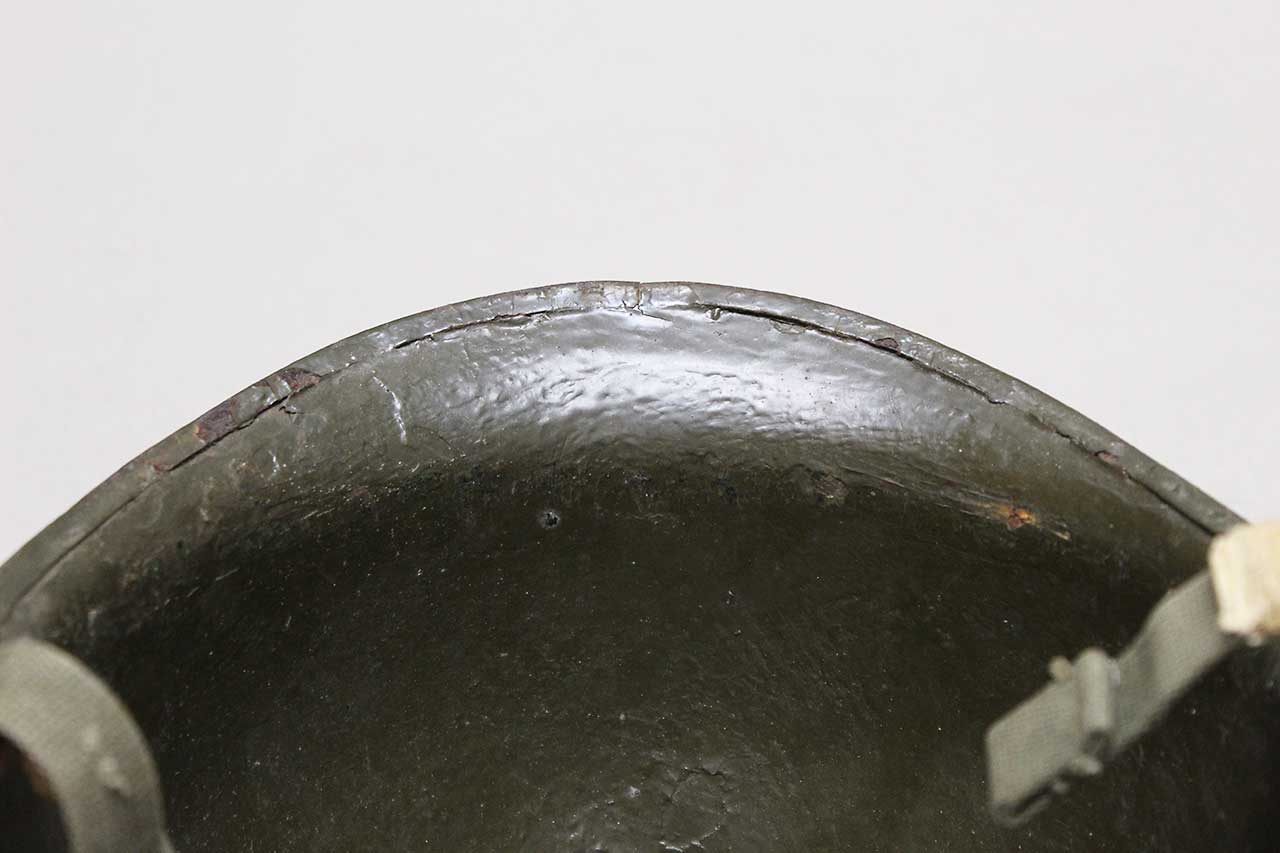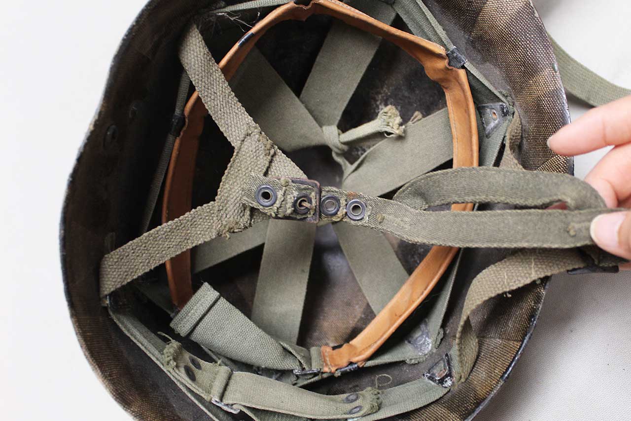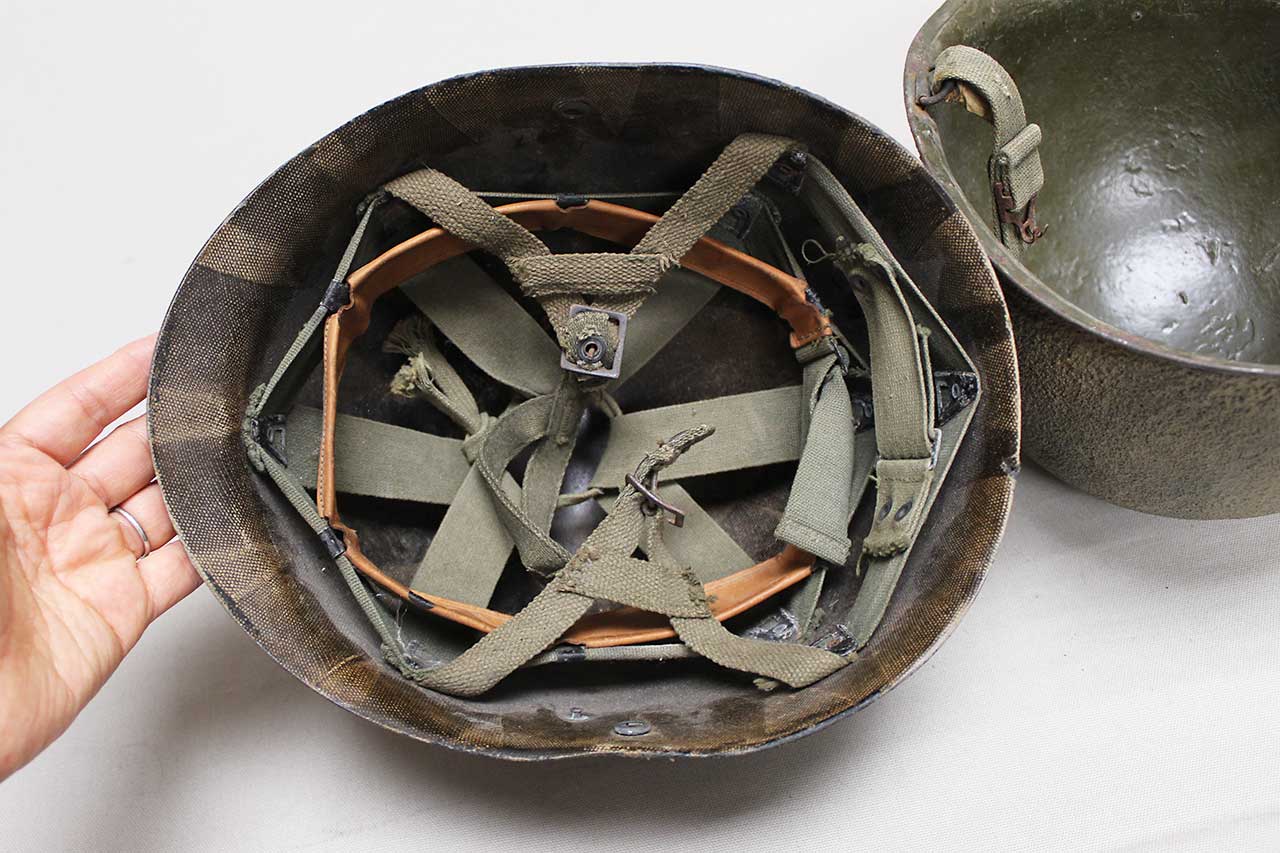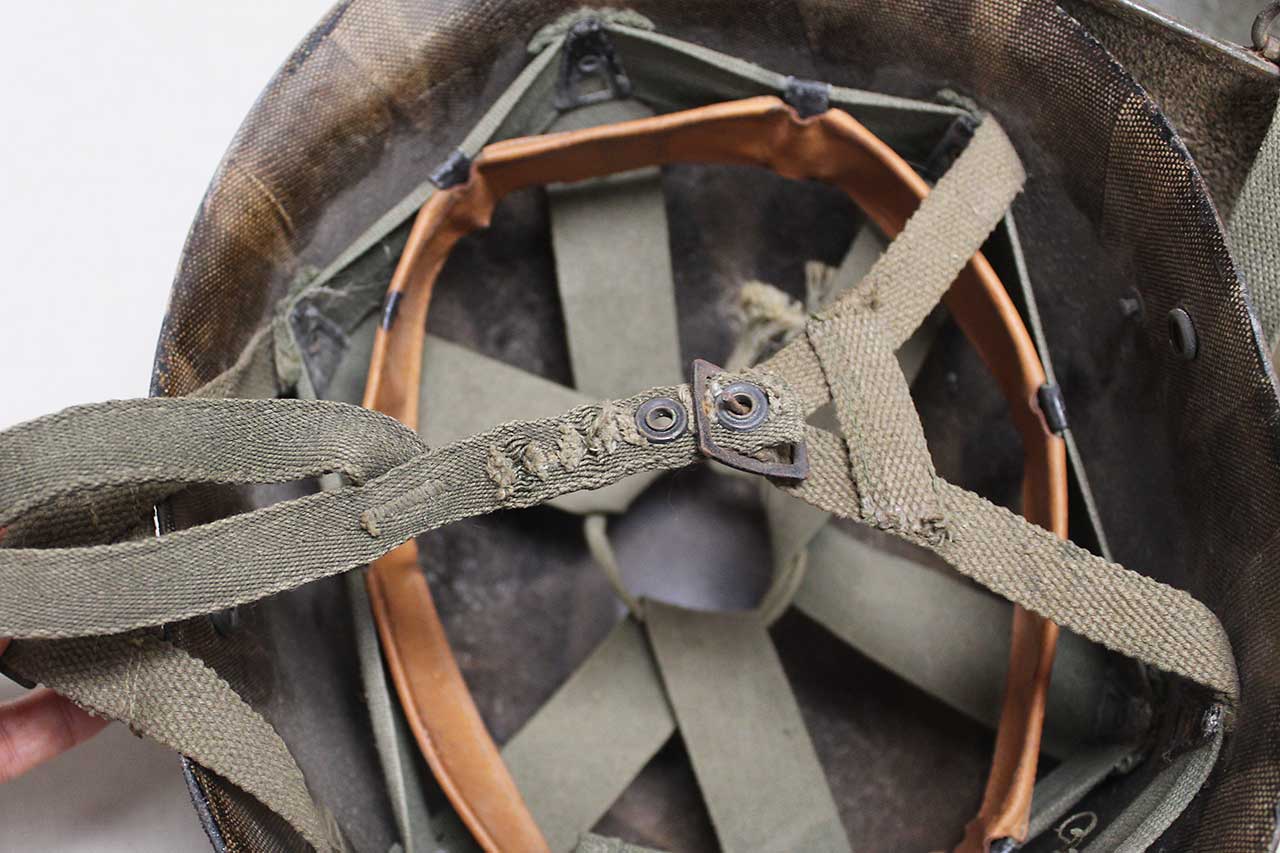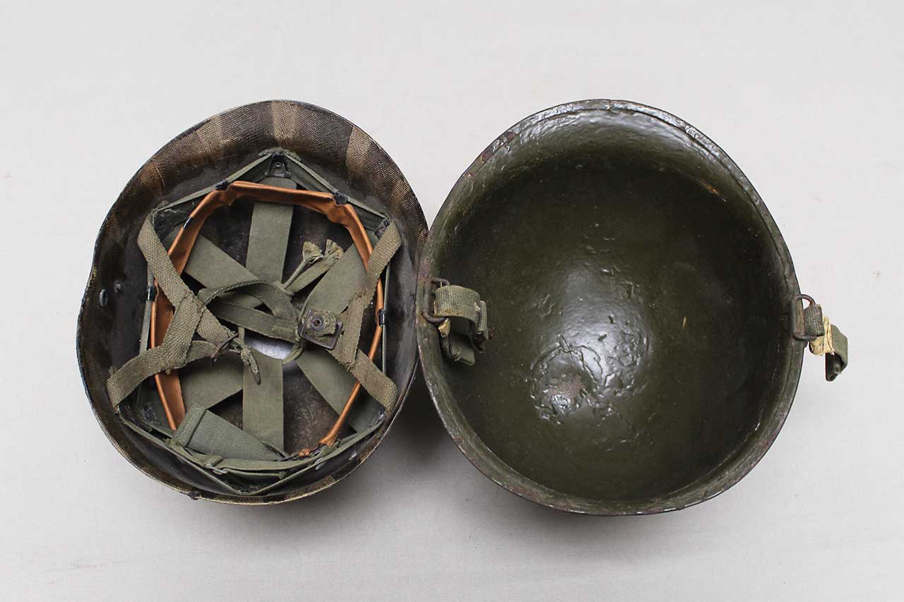 United States Army M1 Combat helmet with Paratrooper Liner and Heavy Textured Camouflage Paint. Very unusual textured camouflage paint scheme, I have not seen one like this before, came out of a pick-up from single soldier that had his 101st patched airborne shirts with jump wings (listed separately) as well as other paratrooper items (early Vietnam era shirts, insignia, etc). The helmet is an earlier Front seam swivel bale helmet with stitched on paratrooper straps. Paint has a wear, corrosion, and large hit on top where the camouflage paint is missing and has unusual tan color below. The inside of the helmet shell has a heavy green repaint interior that covers being able to read any heat stamps. The liner interior is a paratrooper liner that is marked on the interior dome area with what appears to be the Firestone logo with numbers 63 and 103 and is painted black. Overall, a very interesting M1 paratrooper helmet straight out of the woodwork with other items that ties the helmet most likely to 101st Airborne soldier in early Vietnam era.