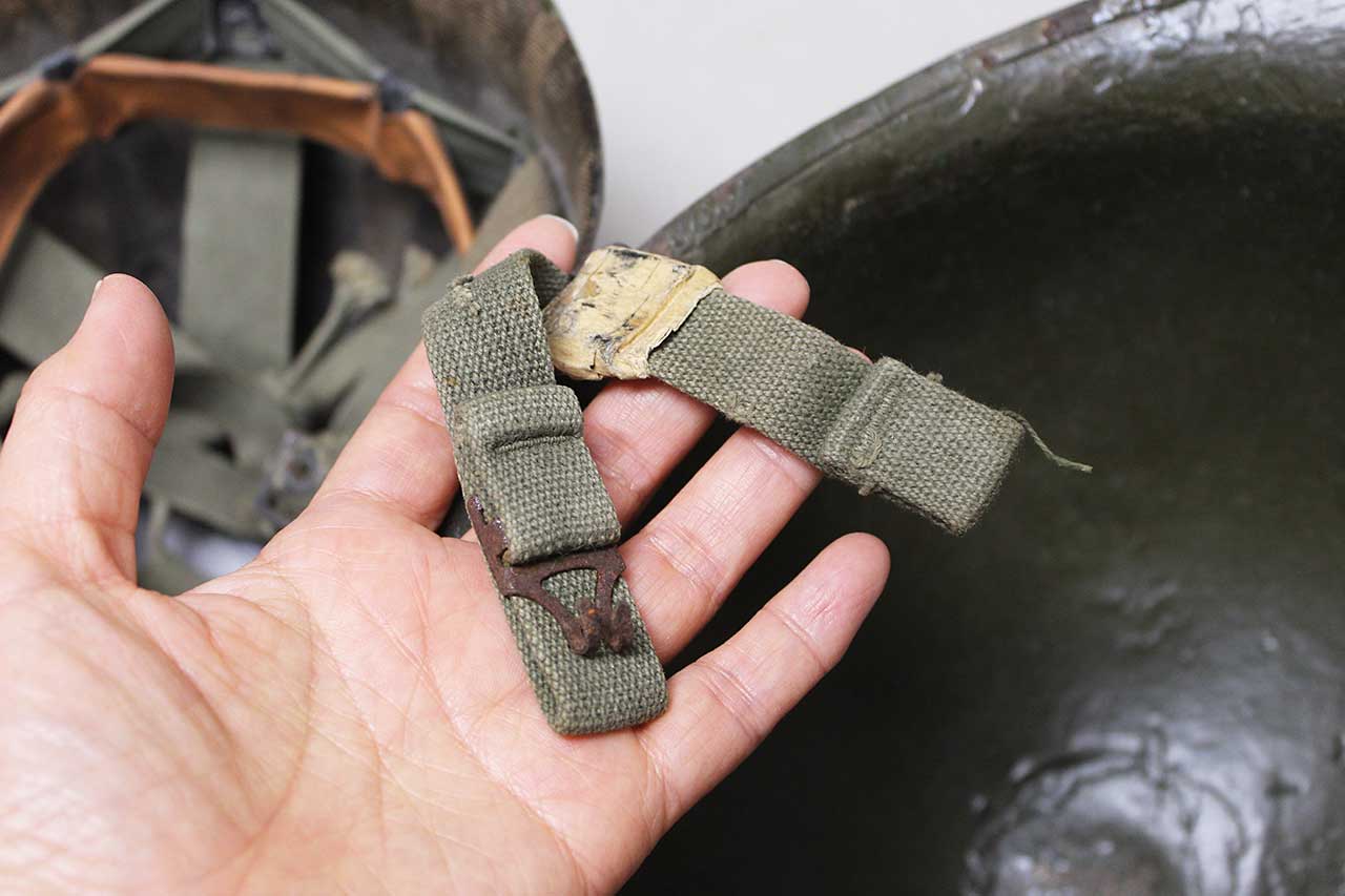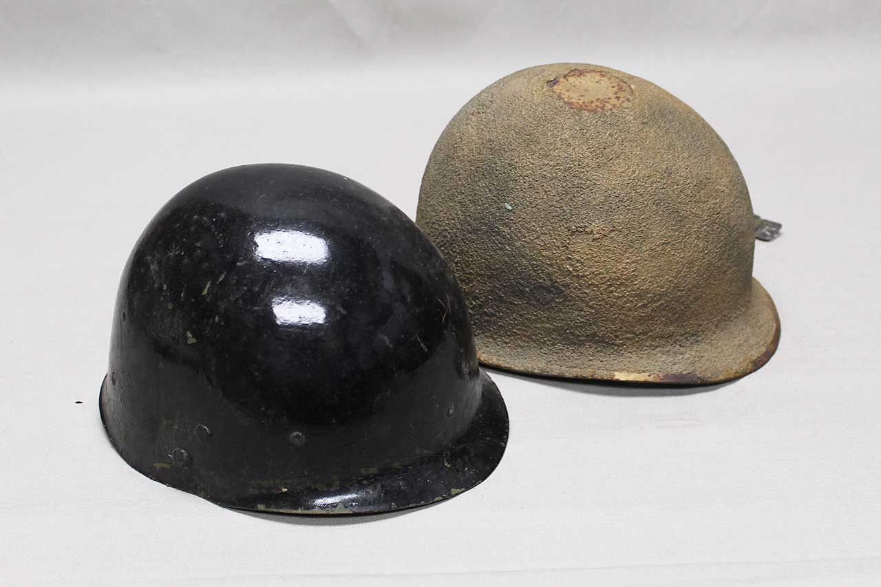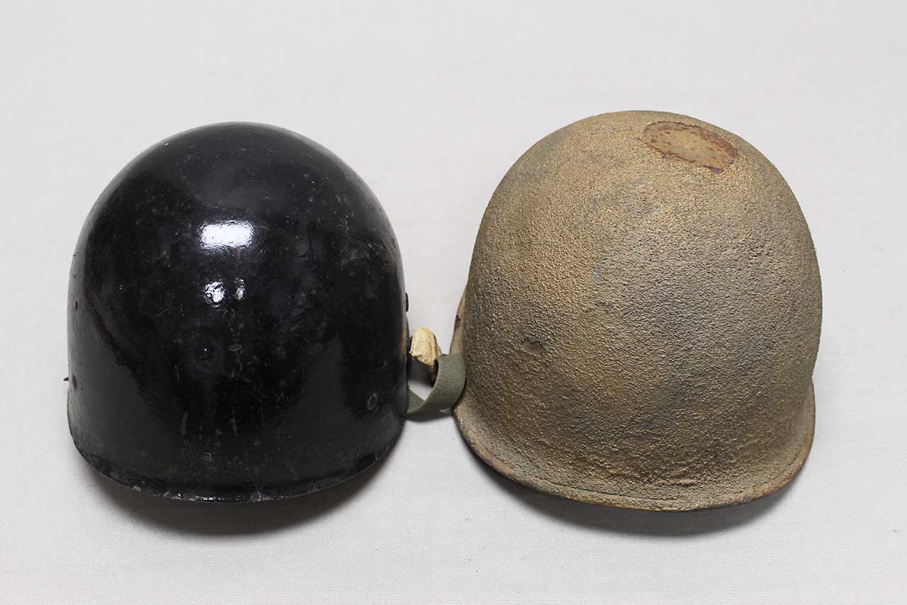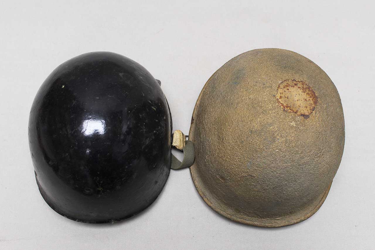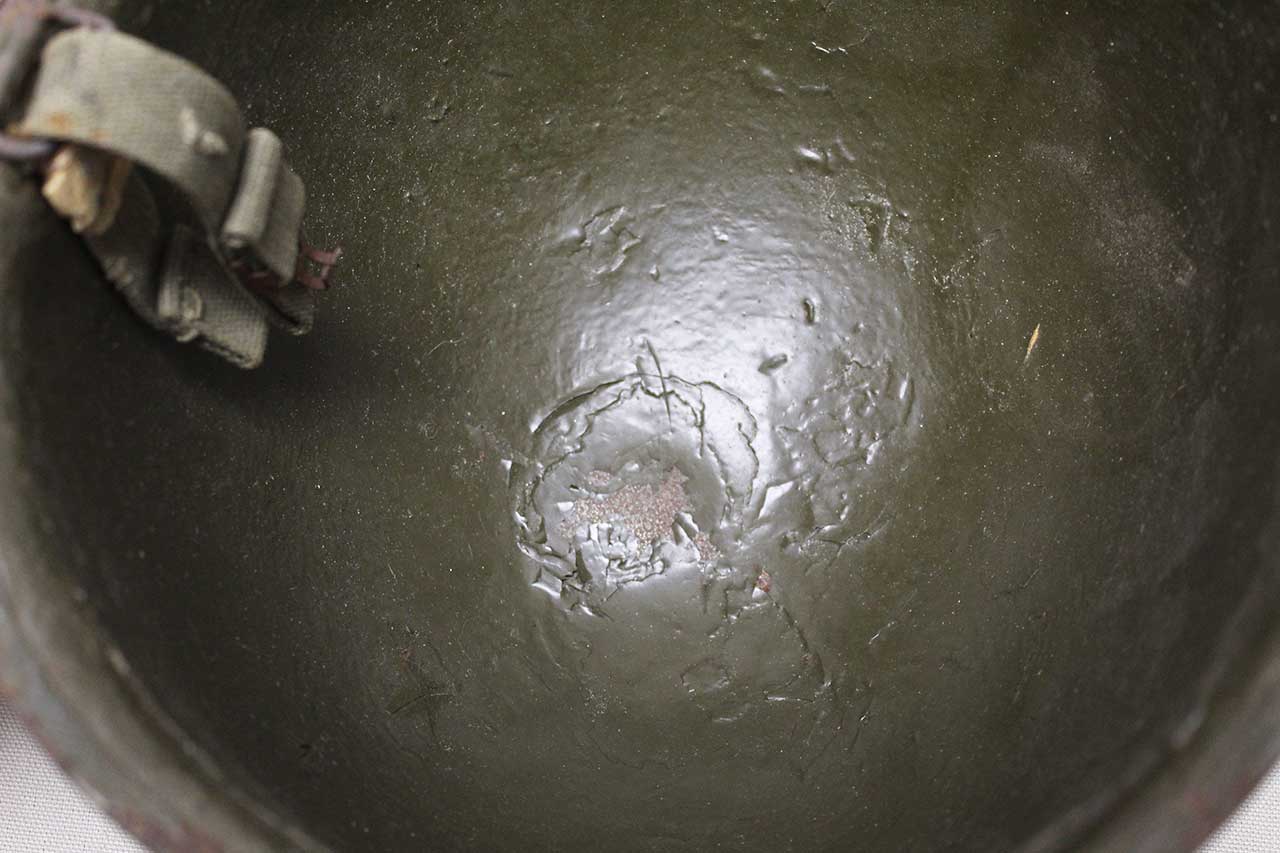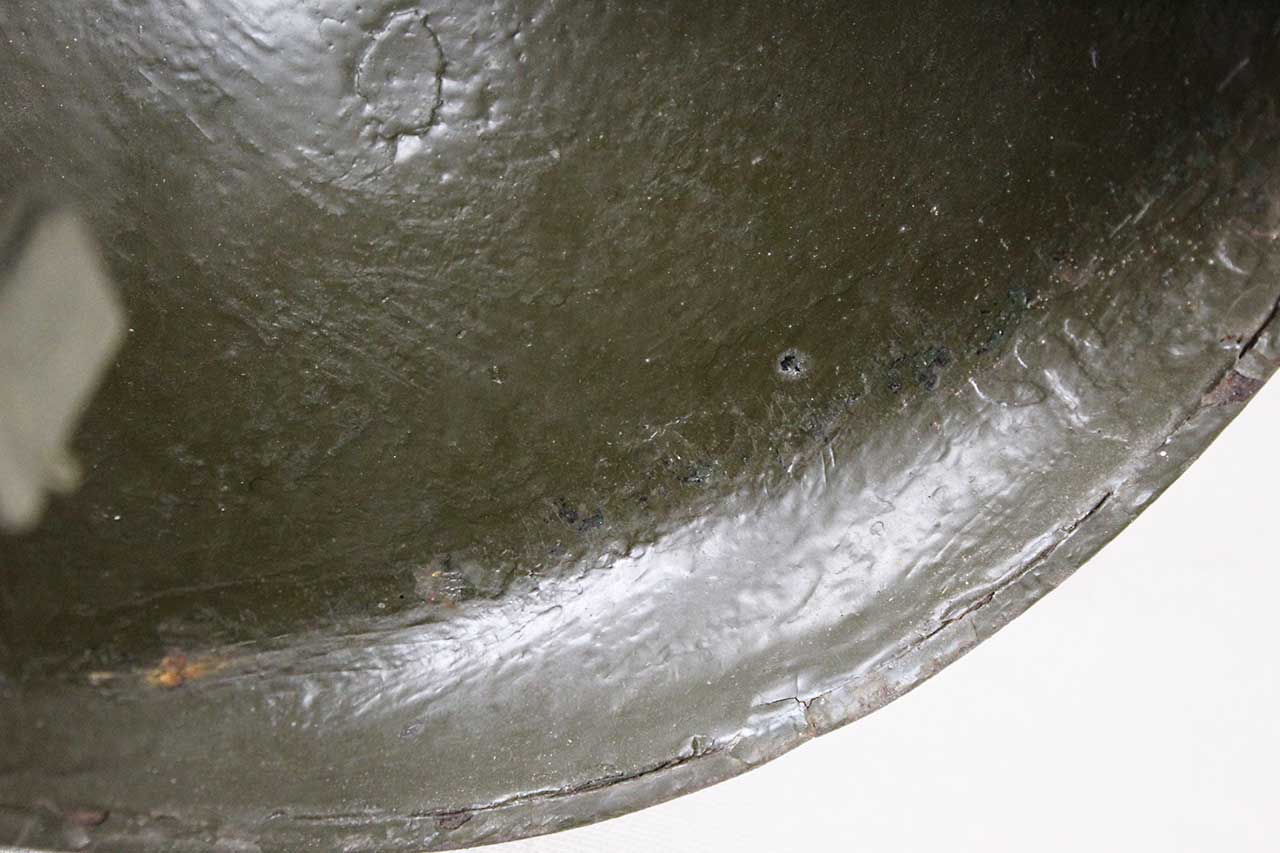 United States Army M1 Combat helmet with Paratrooper Liner and Heavy Textured Camouflage Paint. Very unusual textured camouflage paint scheme, I have not seen one like this before, came out of a pick-up from single soldier that had his 101st patched airborne shirts with jump wings (listed separately) as well as other paratrooper items (early Vietnam era shirts, insignia, etc). The helmet is an earlier Front seam swivel bale helmet with stitched on paratrooper straps. Paint has a wear, corrosion, and large hit on top where the camouflage paint is missing and has unusual tan color below. The inside of the helmet shell has a heavy green repaint interior that covers being able to read any heat stamps. The liner interior is a paratrooper liner that is marked on the interior dome area with what appears to be the Firestone logo with numbers 63 and 103 and is painted black. Overall, a very interesting M1 paratrooper helmet straight out of the woodwork with other items that ties the helmet most likely to 101st Airborne soldier in early Vietnam era.