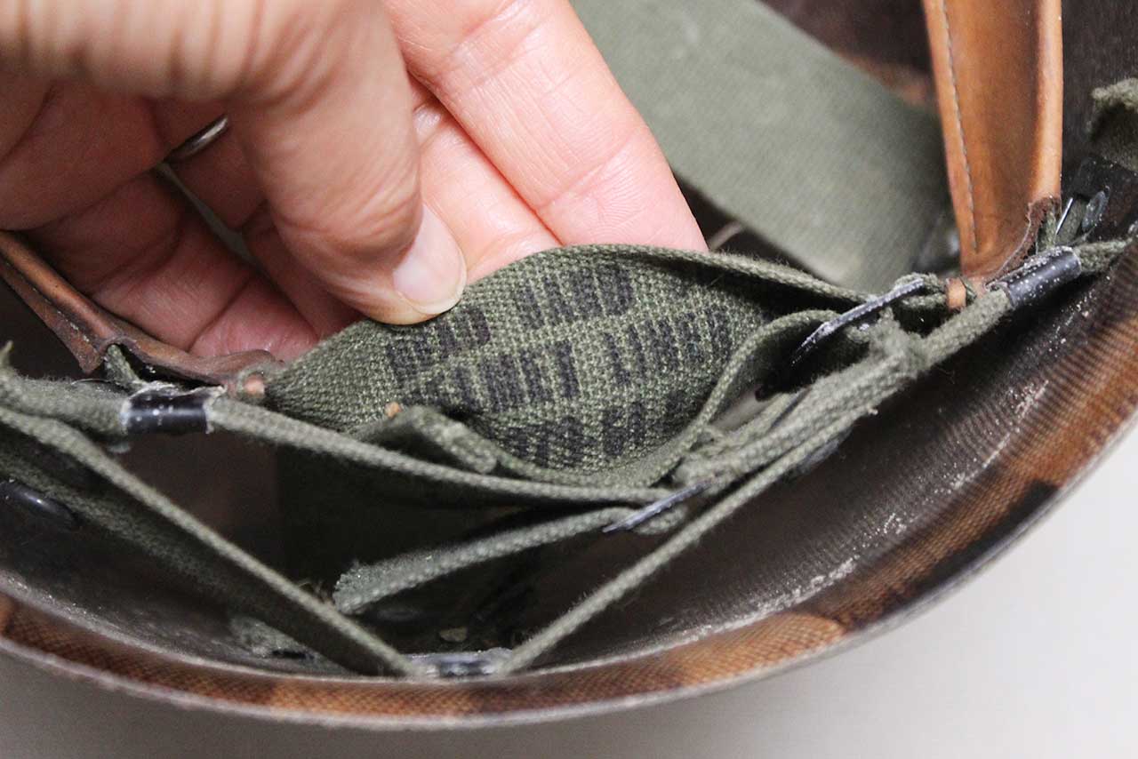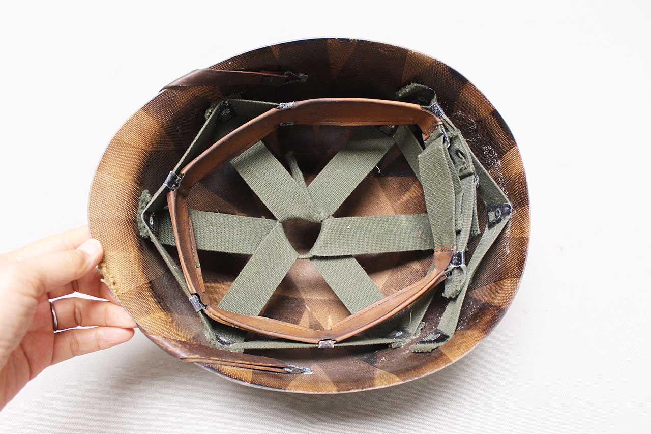 United States Army M1 Combat helmet liner. Decent liner chinstrap and webbing and has sweatband and neck strap as well. Sweatband appears to be ink contract marked 1964. Liner dome marked CAPAC 61/53 7 CMC. There is a little bit of a hit to the front rim are on the front edge of the liner. Worn condition.