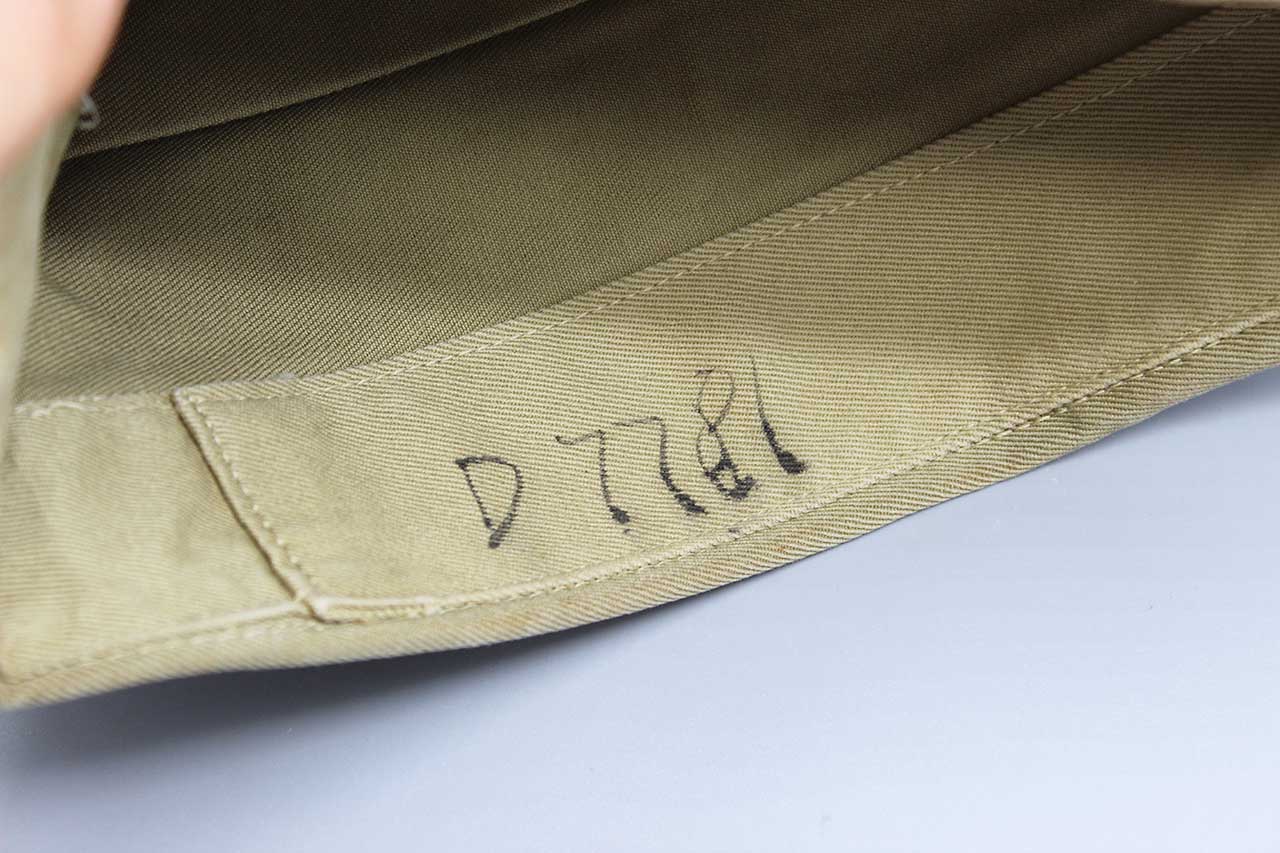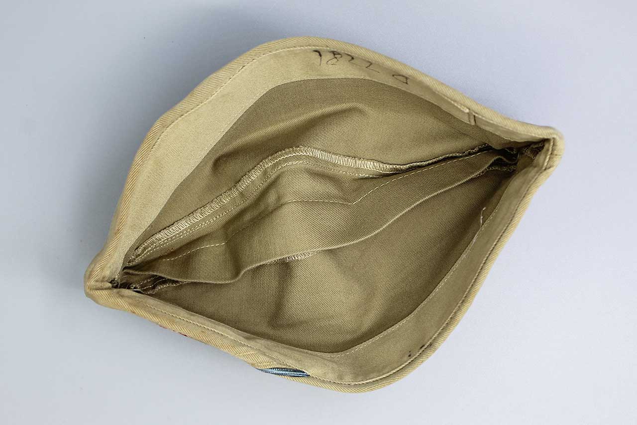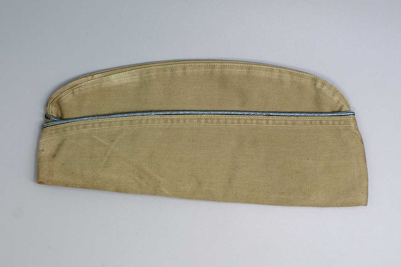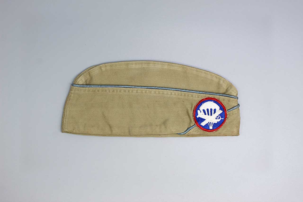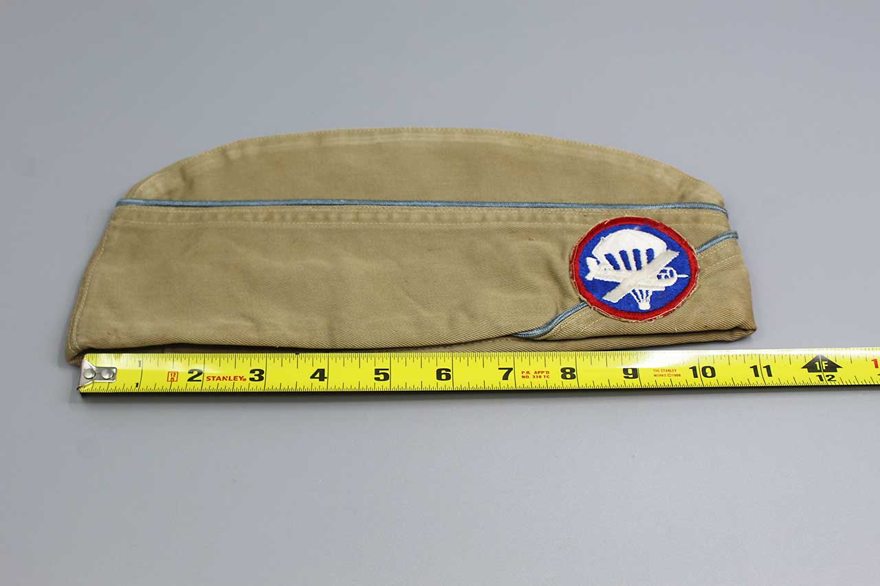 United States Army Officer Airborne Para-Glider Tropical (Khaki) Garrison Cap. 1940s (ww2) era. Blue piping for Infantry. Military laundry number on interior of cap appears to be: D 7781. Military Issue cap. Worn condition.