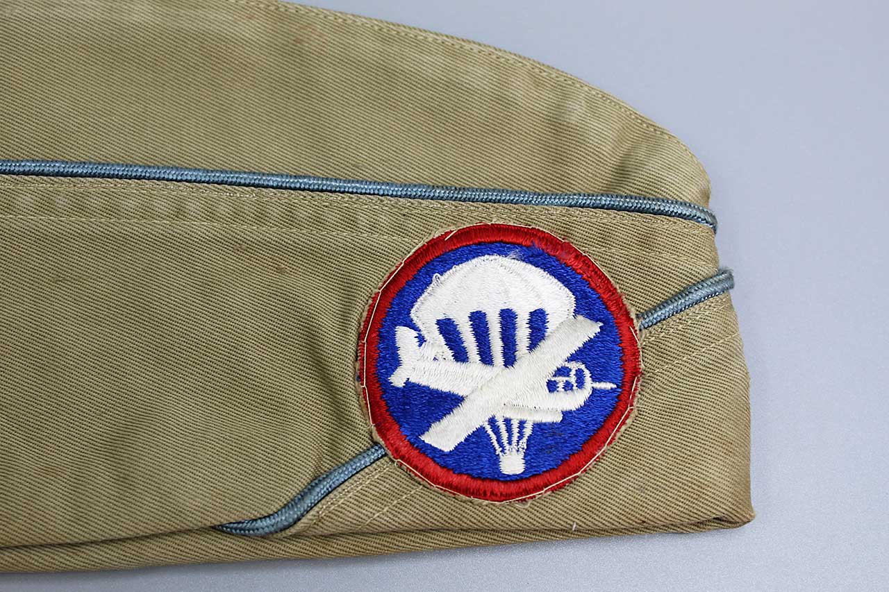 Additional Notes: The WW2 United States Army Airborne Para-Glider Tropical Garrison Cap was a distinctive piece of headgear worn by soldiers in glider and parachute infantry units. You will see the classic overseas-style cap, often adorned with the combined parachute and glider insignia, and sometimes featuring branch-colored piping (like blue for infantry or red for artillery). These caps were typically made from lightweight tropical worsted wool for warm climates and were worn with pride by members of elite airborne divisions such as the 82nd and 101st Airborne. The insignia evolved during the war, eventually merging parachute and glider symbols into a unified Airborne patch.