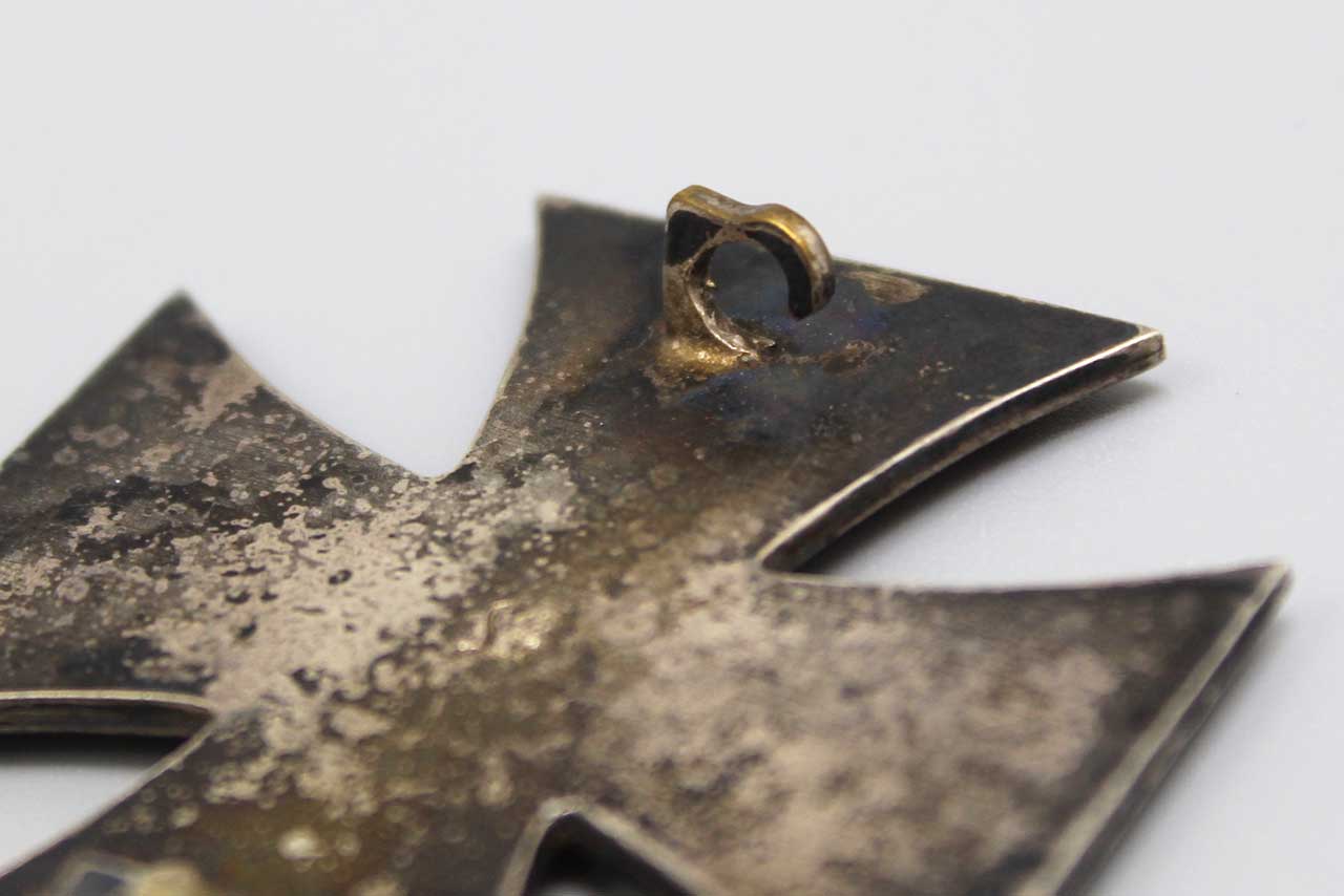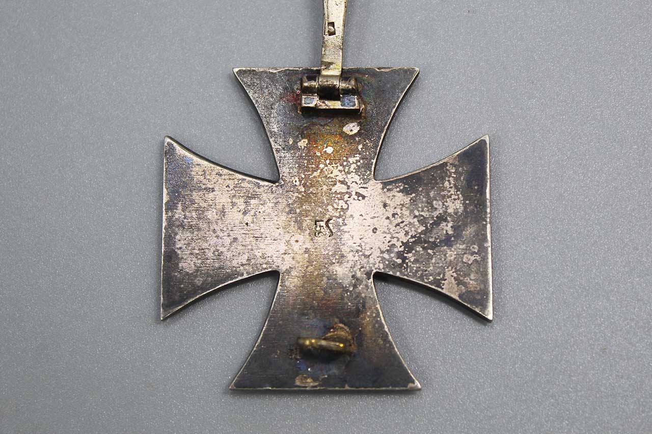 WW2 German Iron Cross 1st class. Marker marked “L59” on the back for the maker of Alois Rettenmaier. Also, has the additional sideways “S” type mark, probably likely some type of inspection mark (you can find several different additional marks, and sometimes multiple marks, on the Rettenmaier marked crosses). Multi-piece construction with iron core (magnet sticks to core). Worn condition.