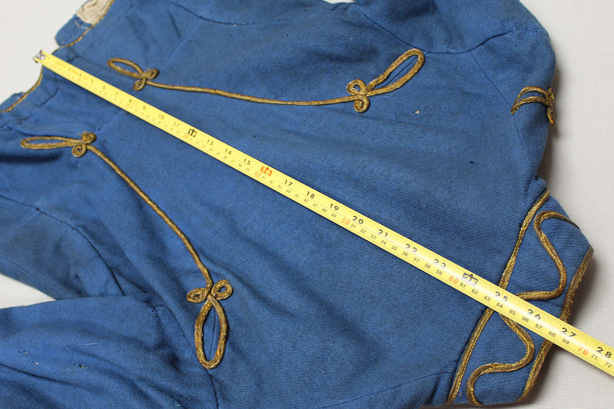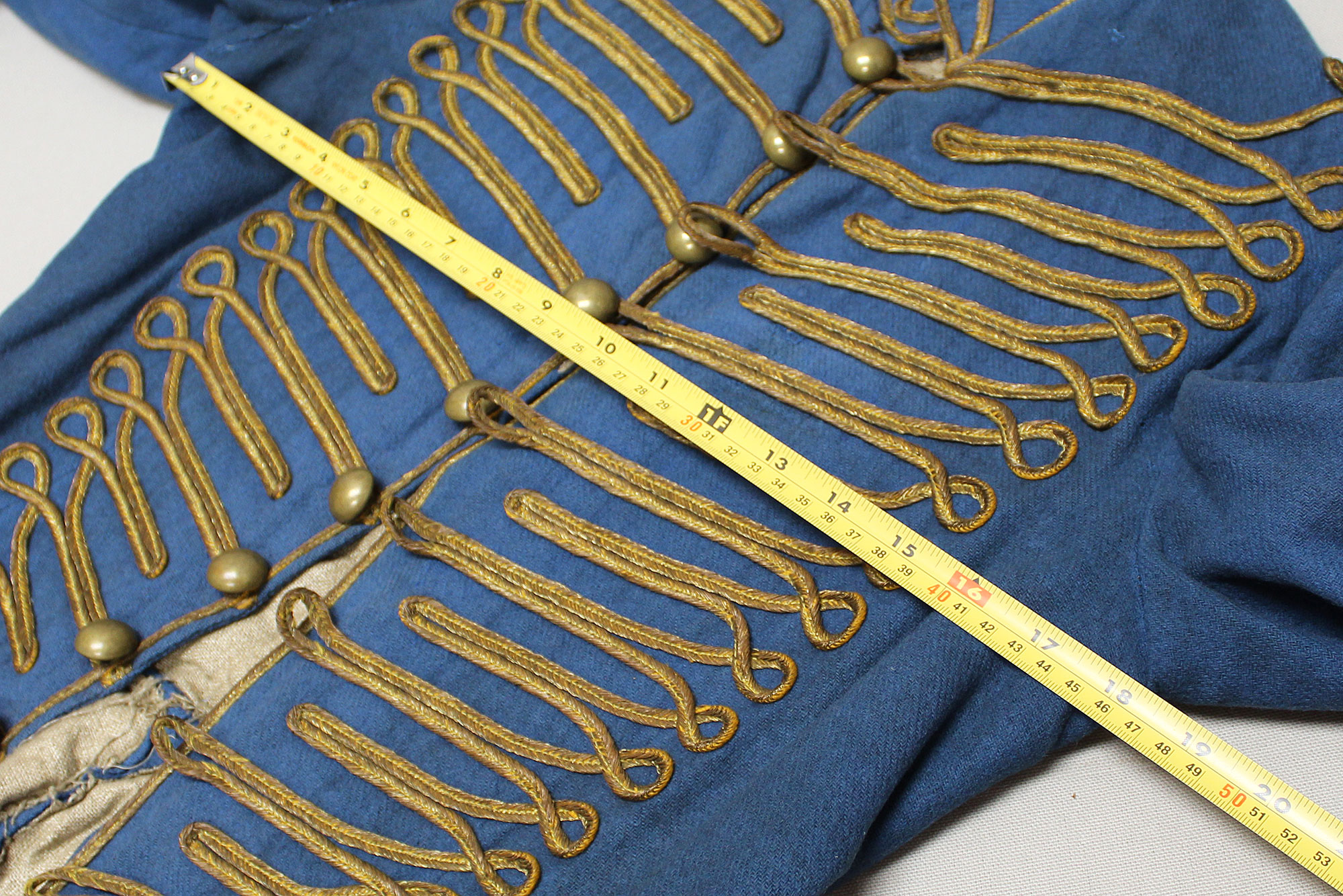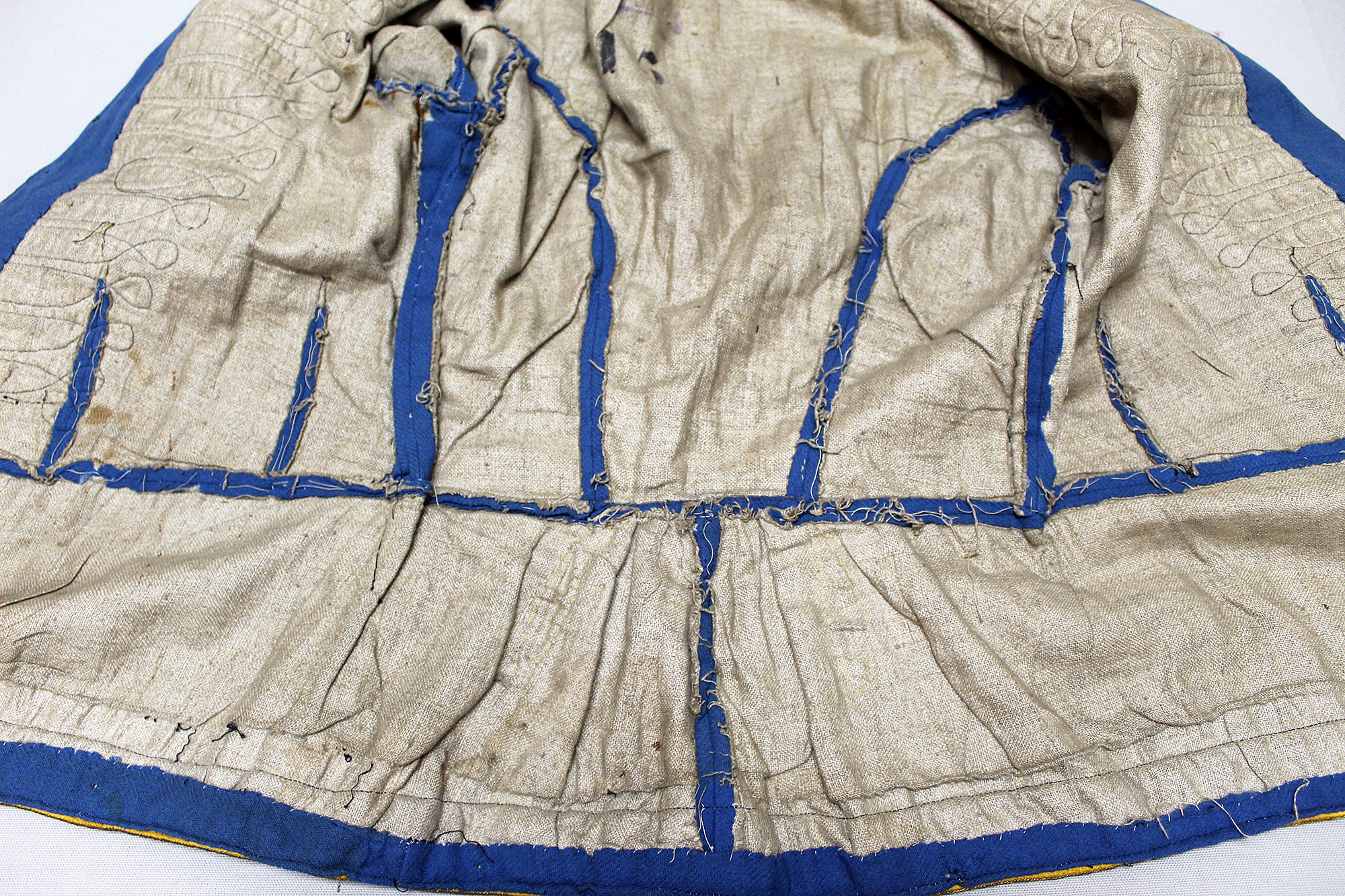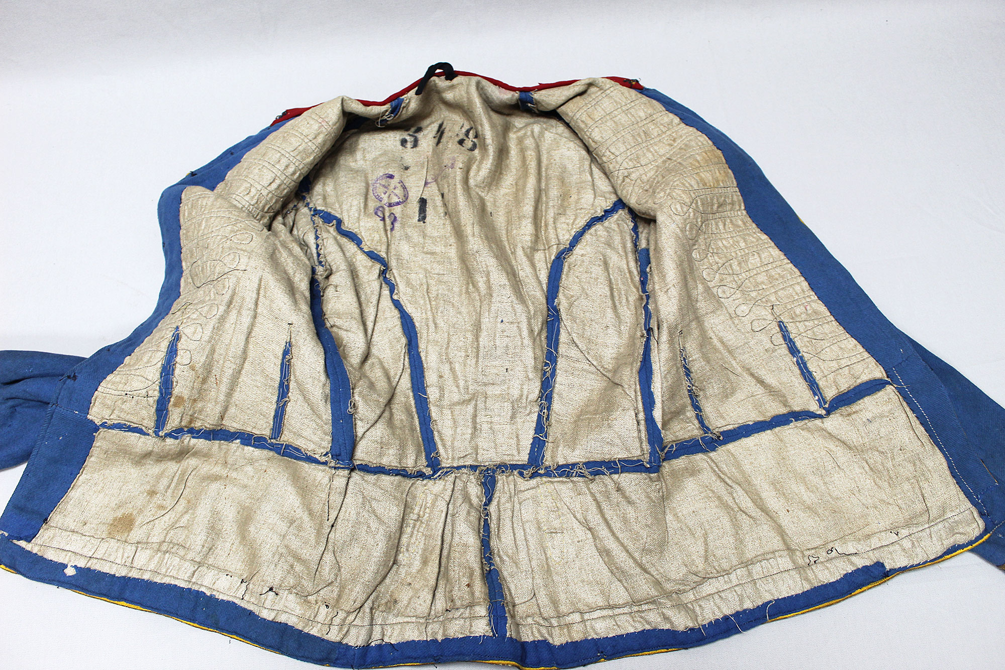 Imperial Austro-Hungarian Attila. I believe this one may be for an Infantry EM (Enlisted man) from information from other collectors more knowledgeable on imperial tunics. Nine button front closure. Stamped and numbered on interior lining. Worn condition with several scattered moth nips, stains, and damage near cuffs. Overall decent displayable condition.
