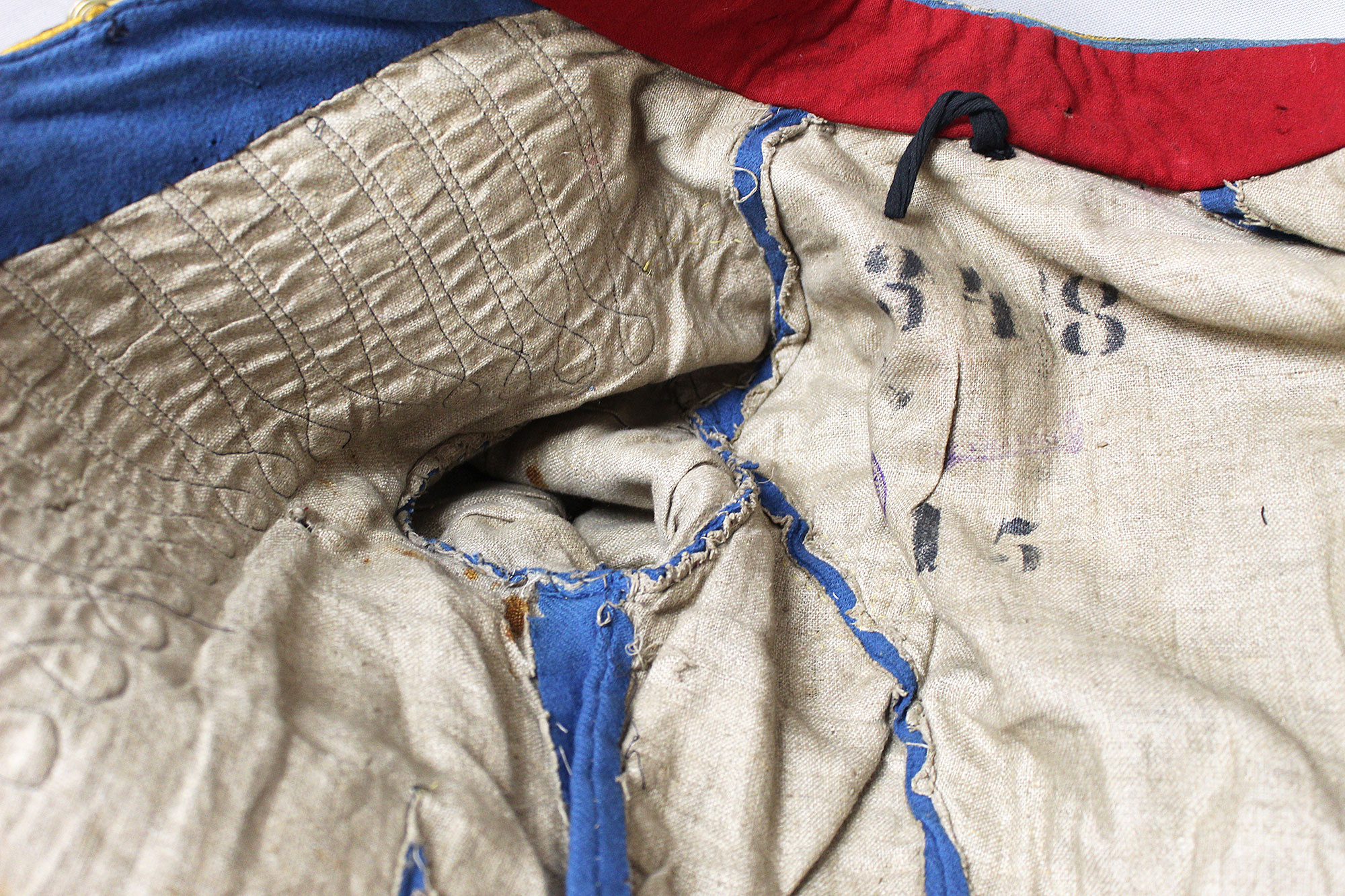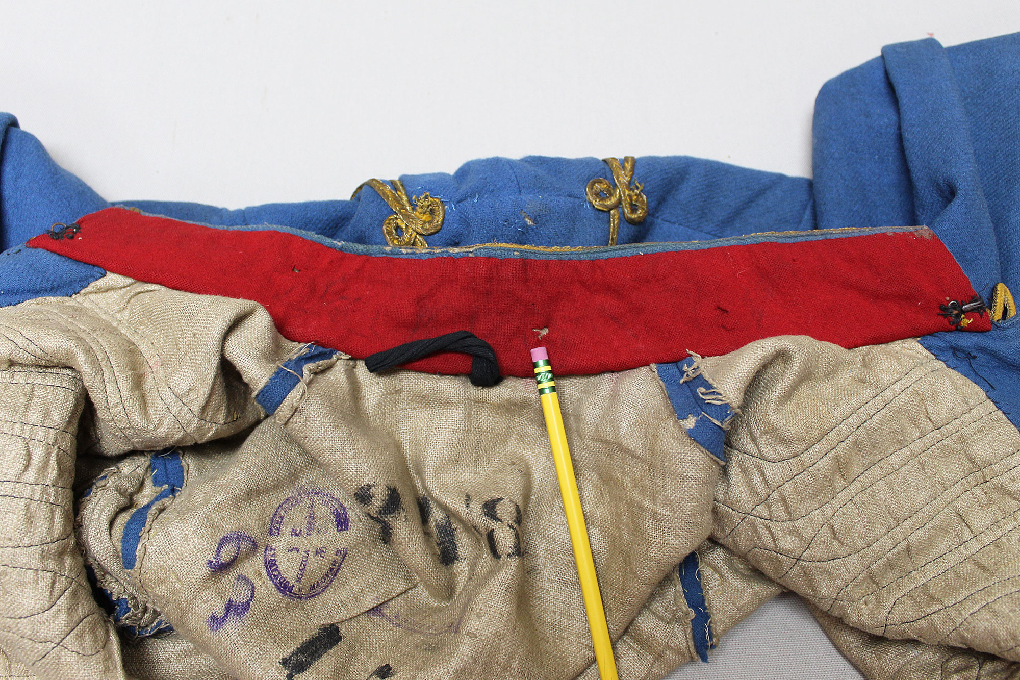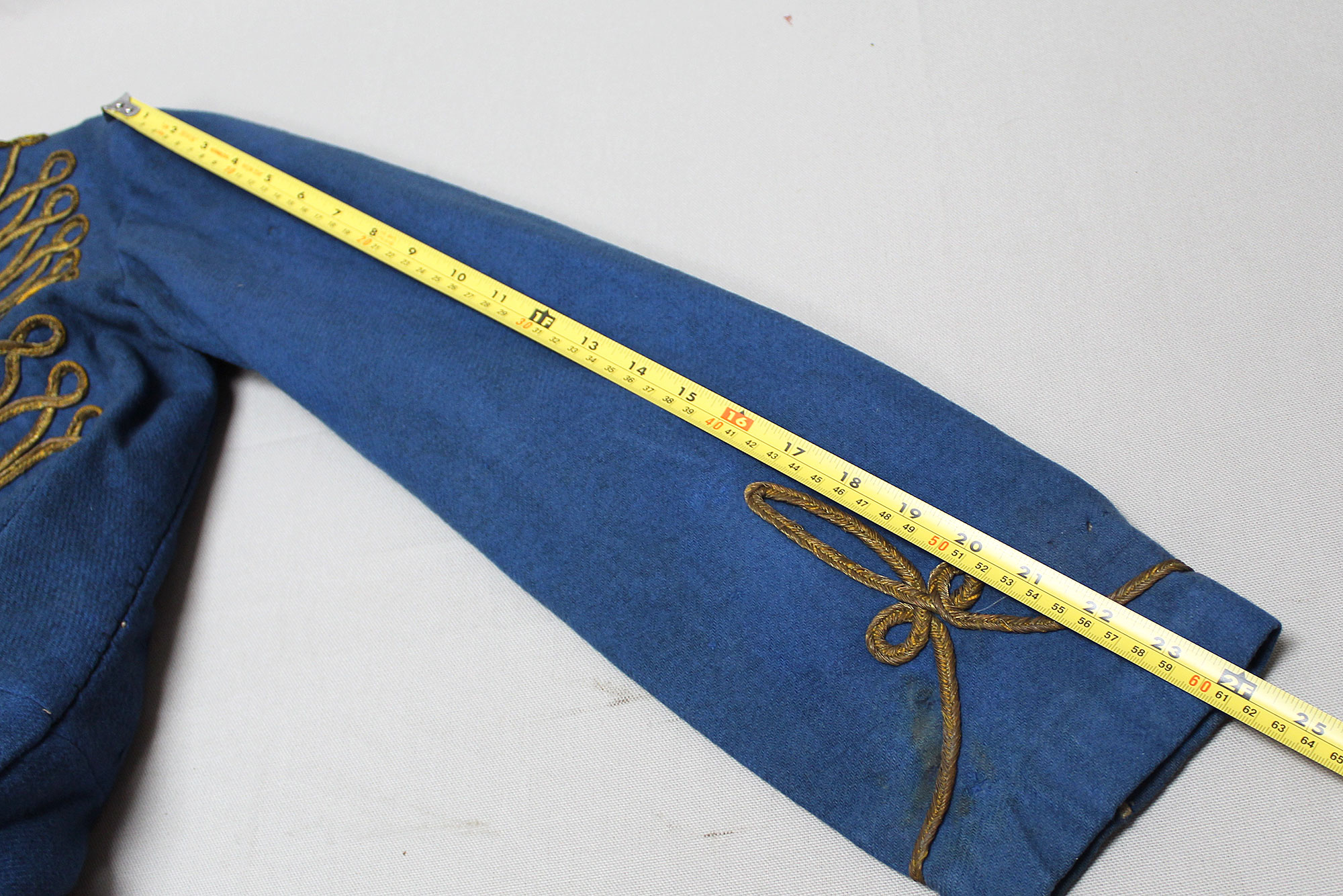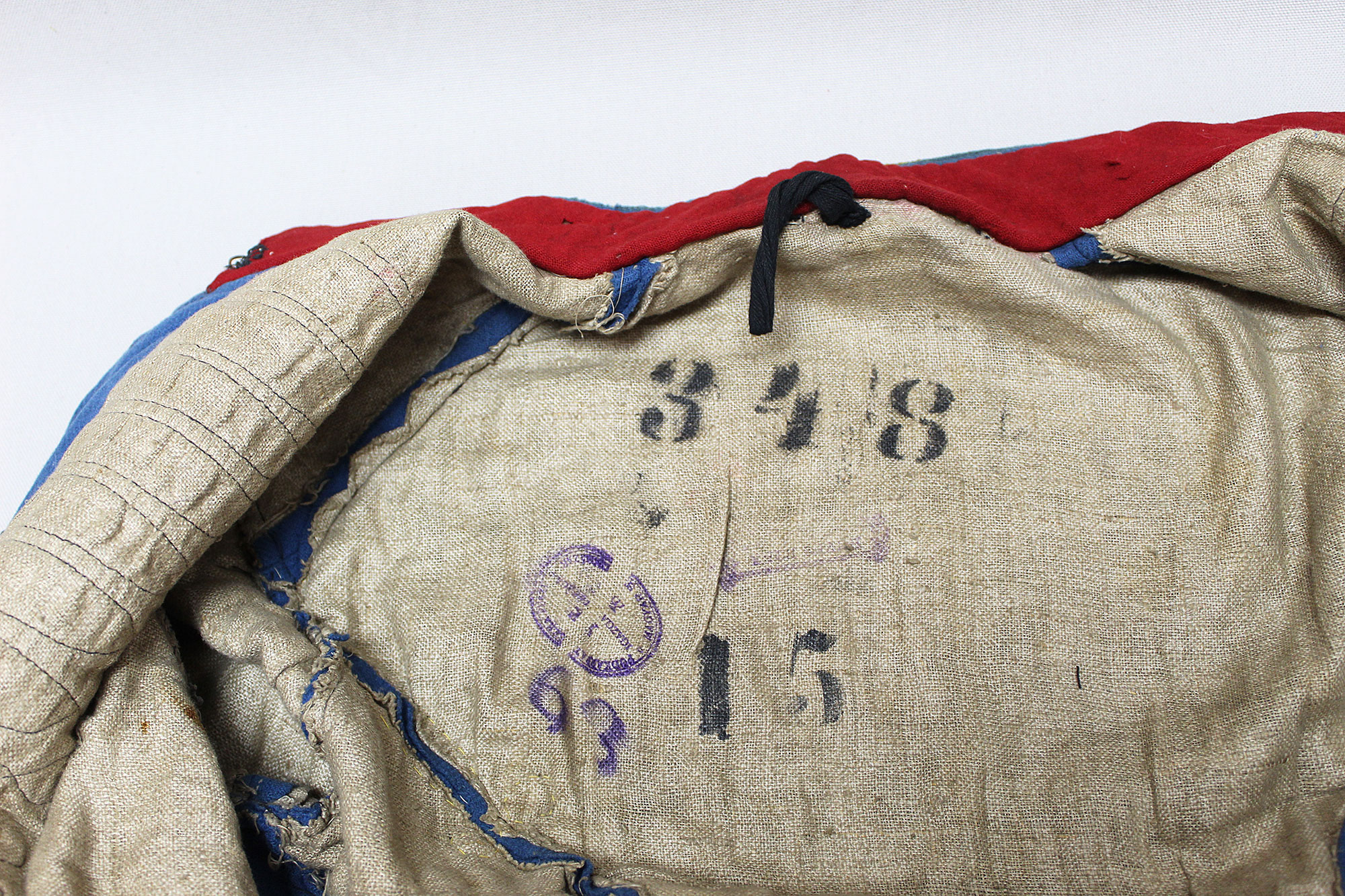 Imperial Austro-Hungarian Attila. I believe this one may be for an Infantry EM (Enlisted man) from information from other collectors more knowledgeable on imperial tunics. Nine button front closure. Stamped and numbered on interior lining. Worn condition with several scattered moth nips, stains, and damage near cuffs. Overall decent displayable condition.