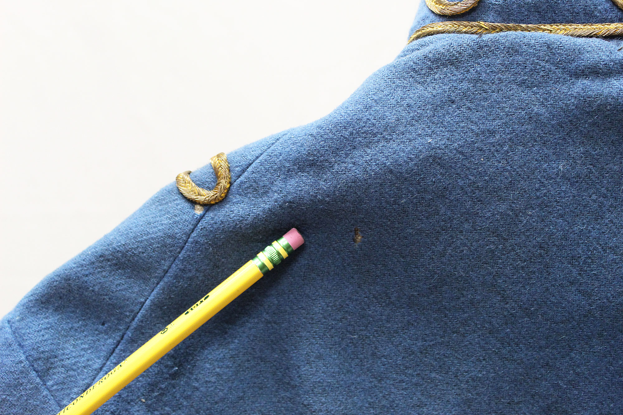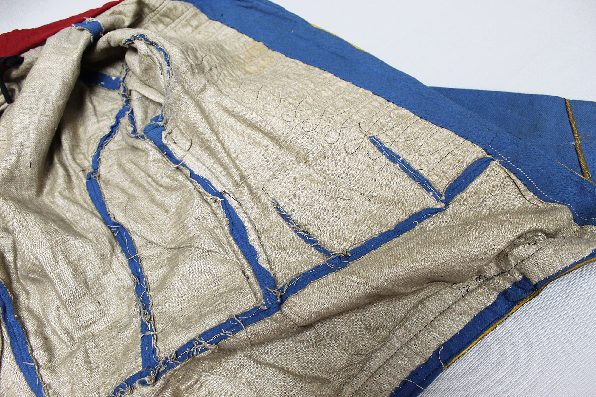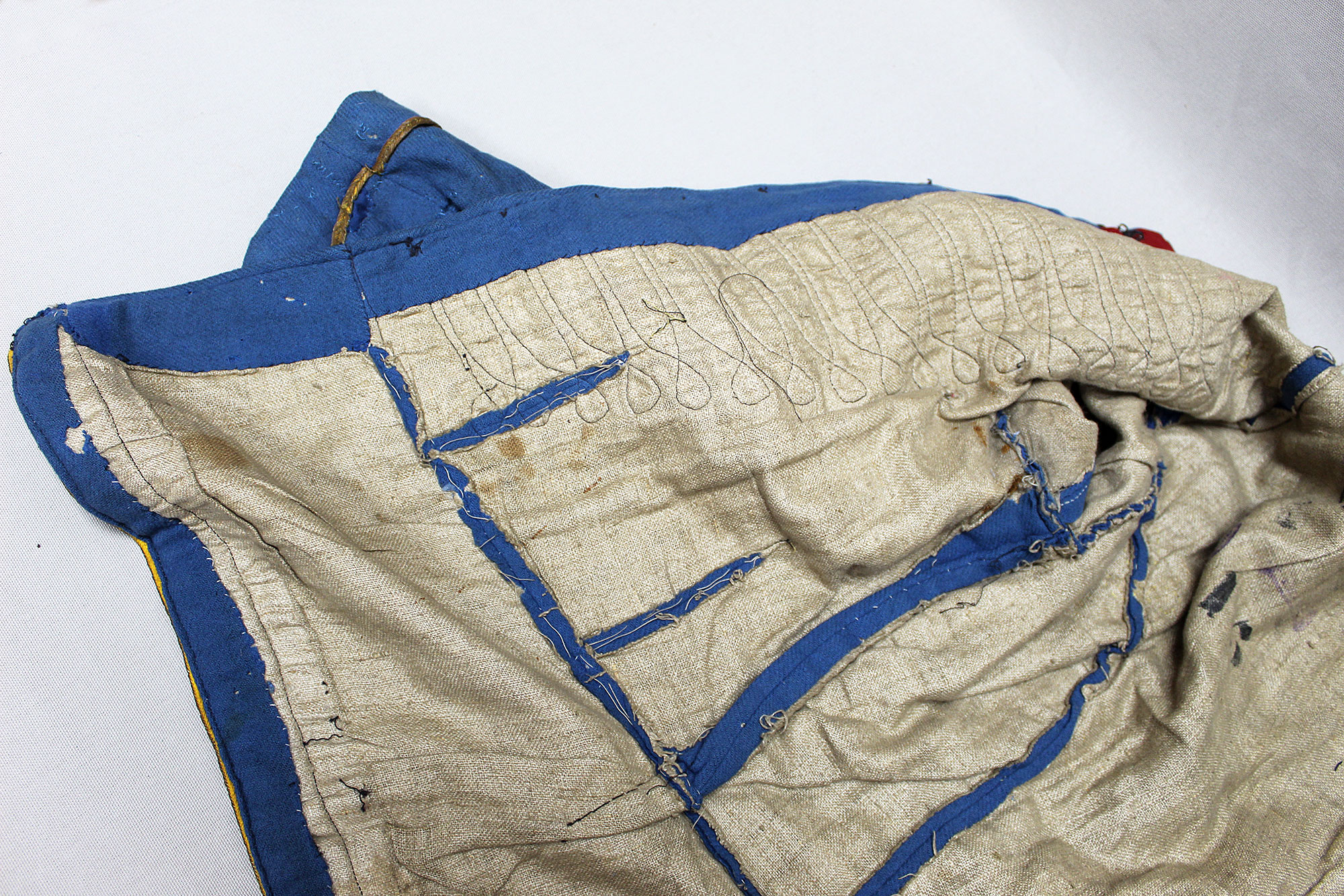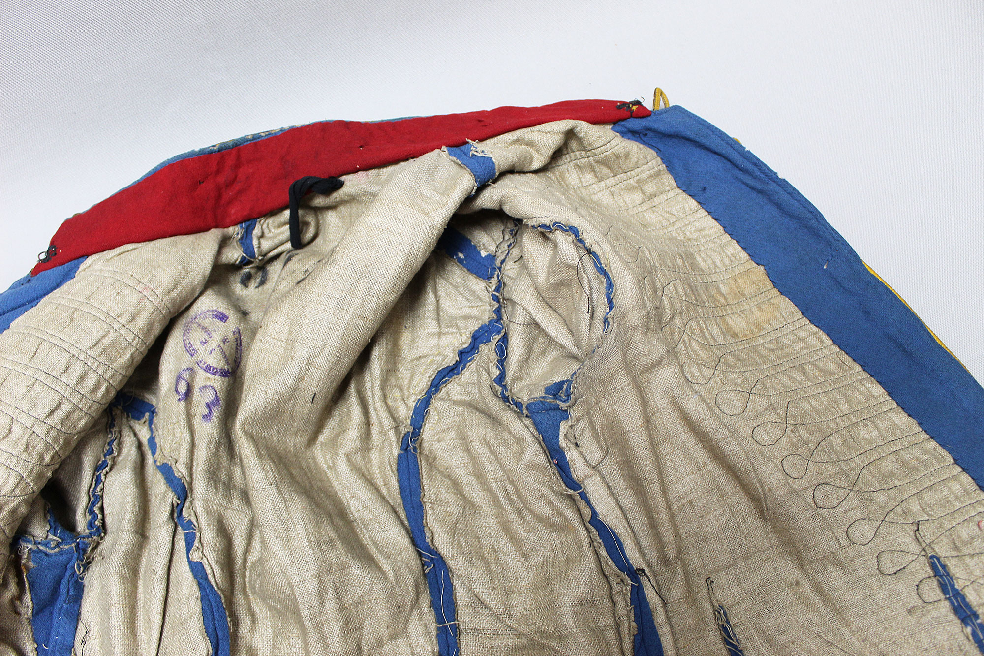 Imperial Austro-Hungarian Attila. I believe this one may be for an Infantry EM (Enlisted man) from information from other collectors more knowledgeable on imperial tunics. Nine button front closure. Stamped and numbered on interior lining. Worn condition with several scattered moth nips, stains, and damage near cuffs. Overall decent displayable condition.