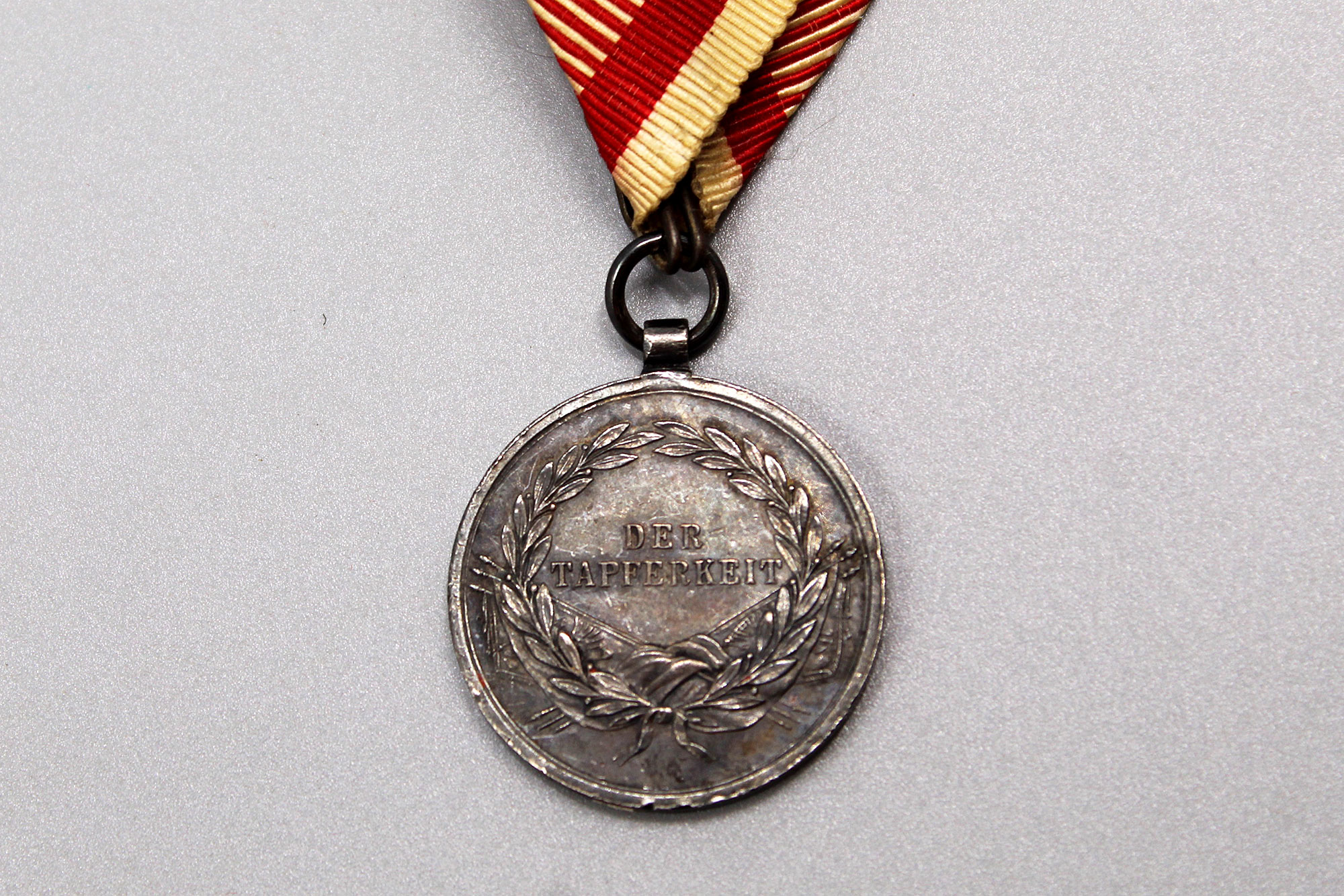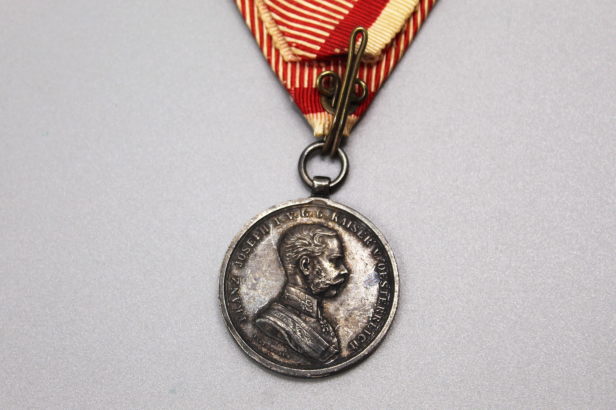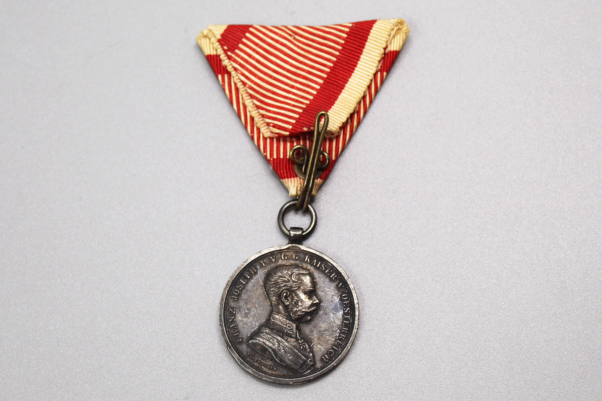 Austria-Hungary Bravery Medal 2nd Class in Silver. Tri-fold ribbon. Portrait of Emperor Franz Joseph I on front. Reverse has wording: Der Tapferkeit (Of Bravery). Worn condition.