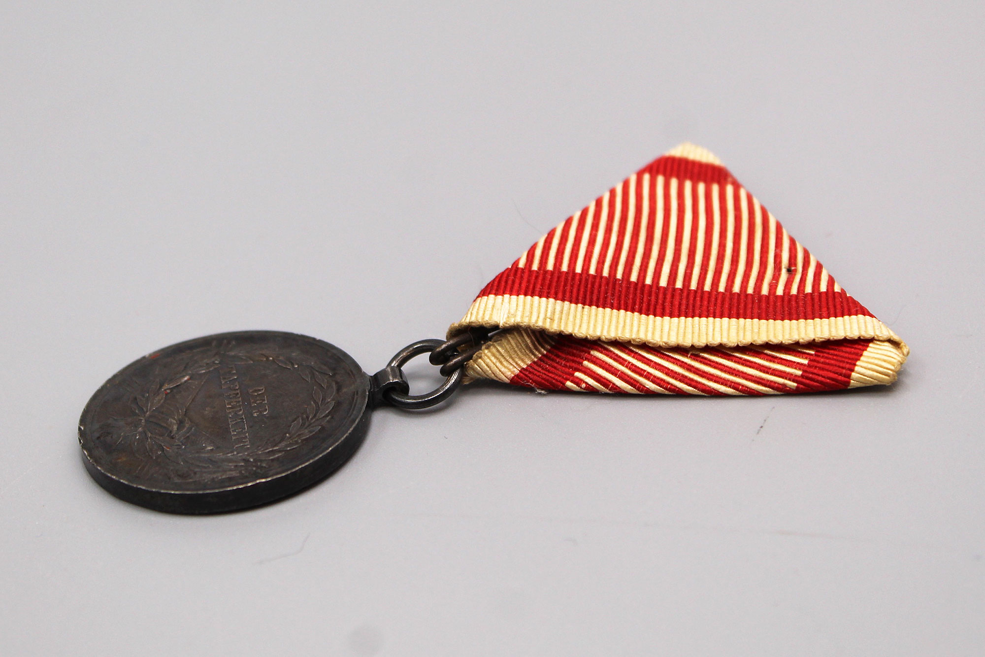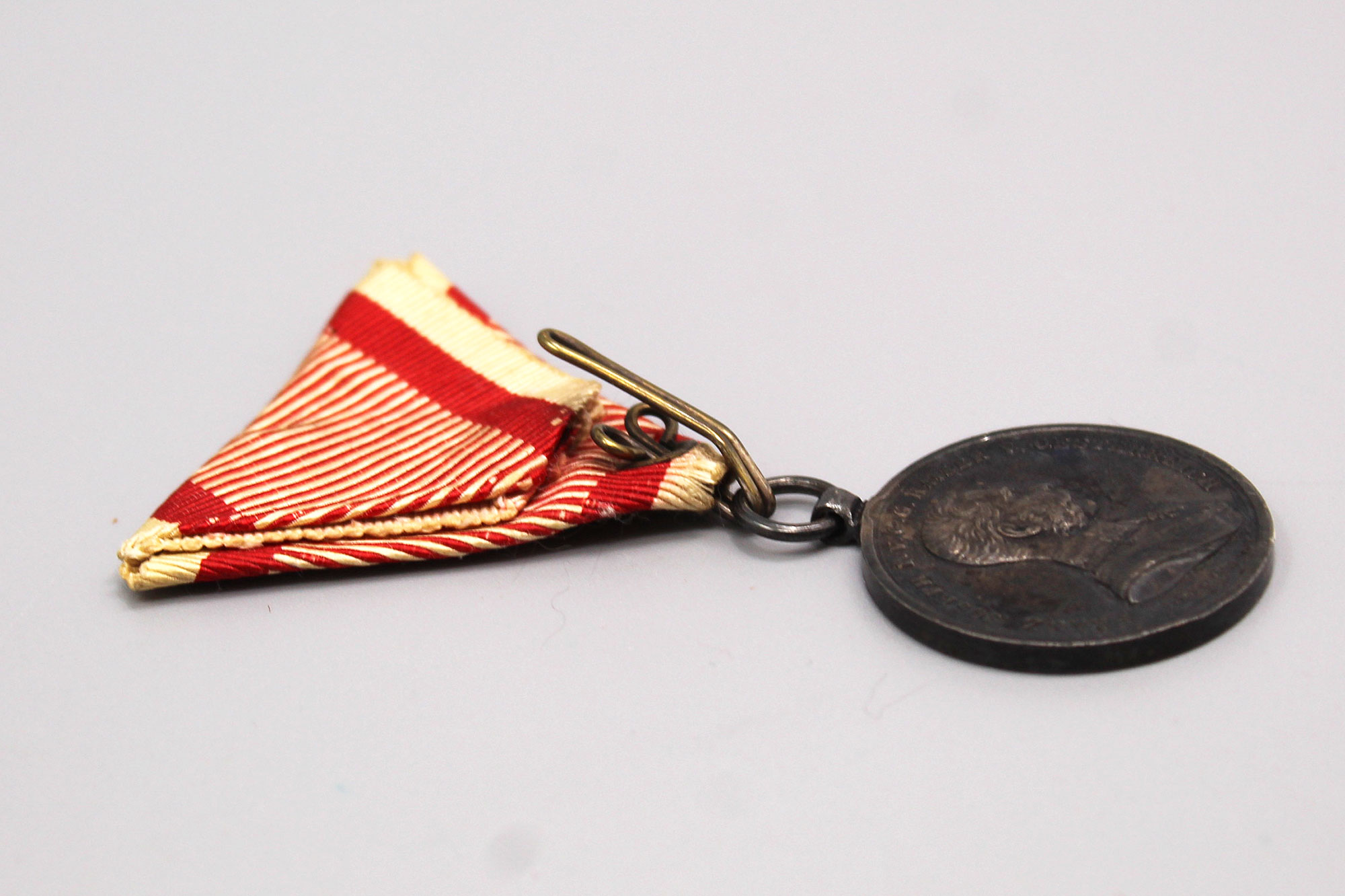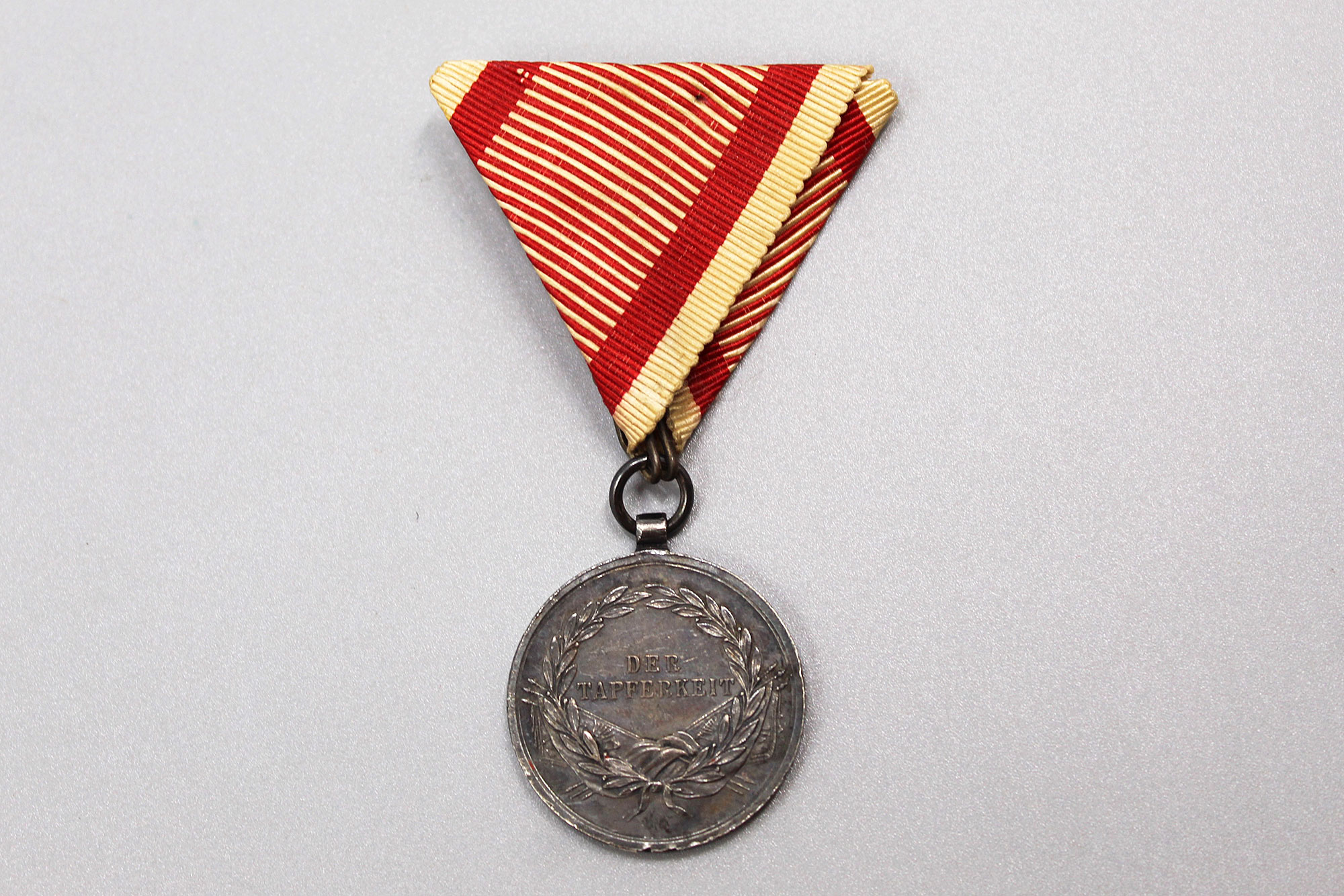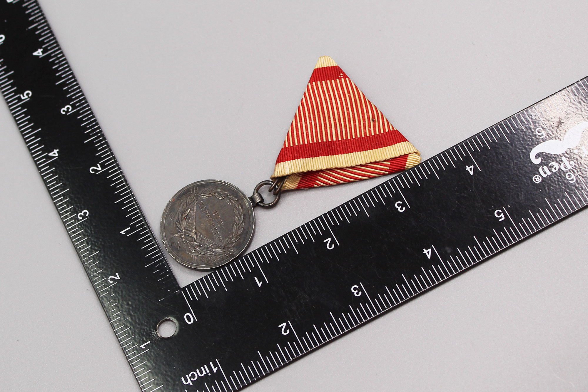 Austria-Hungary Bravery Medal 2nd Class in Silver. Tri-fold ribbon. Portrait of Emperor Franz Joseph I on front. Reverse has wording: Der Tapferkeit (Of Bravery). Worn condition.