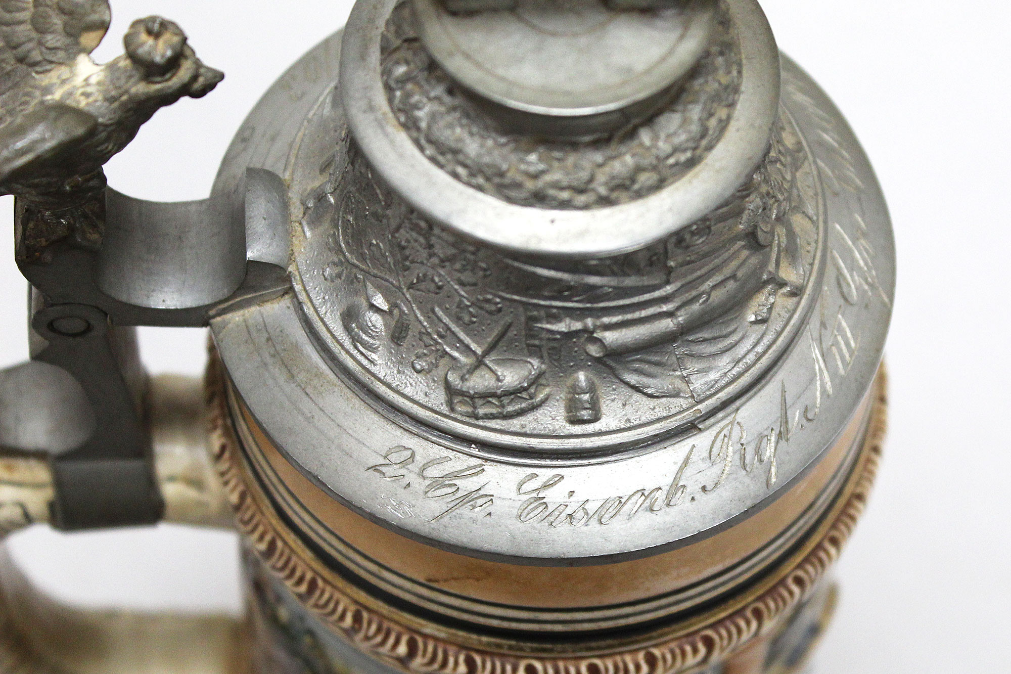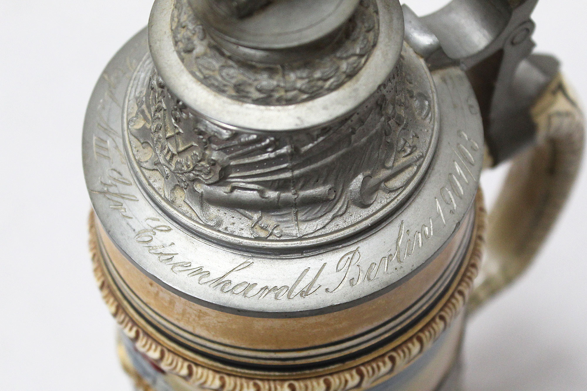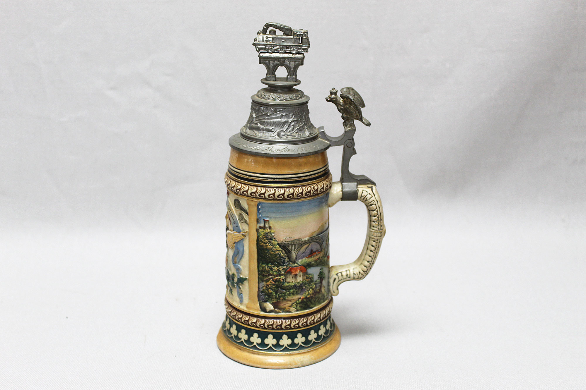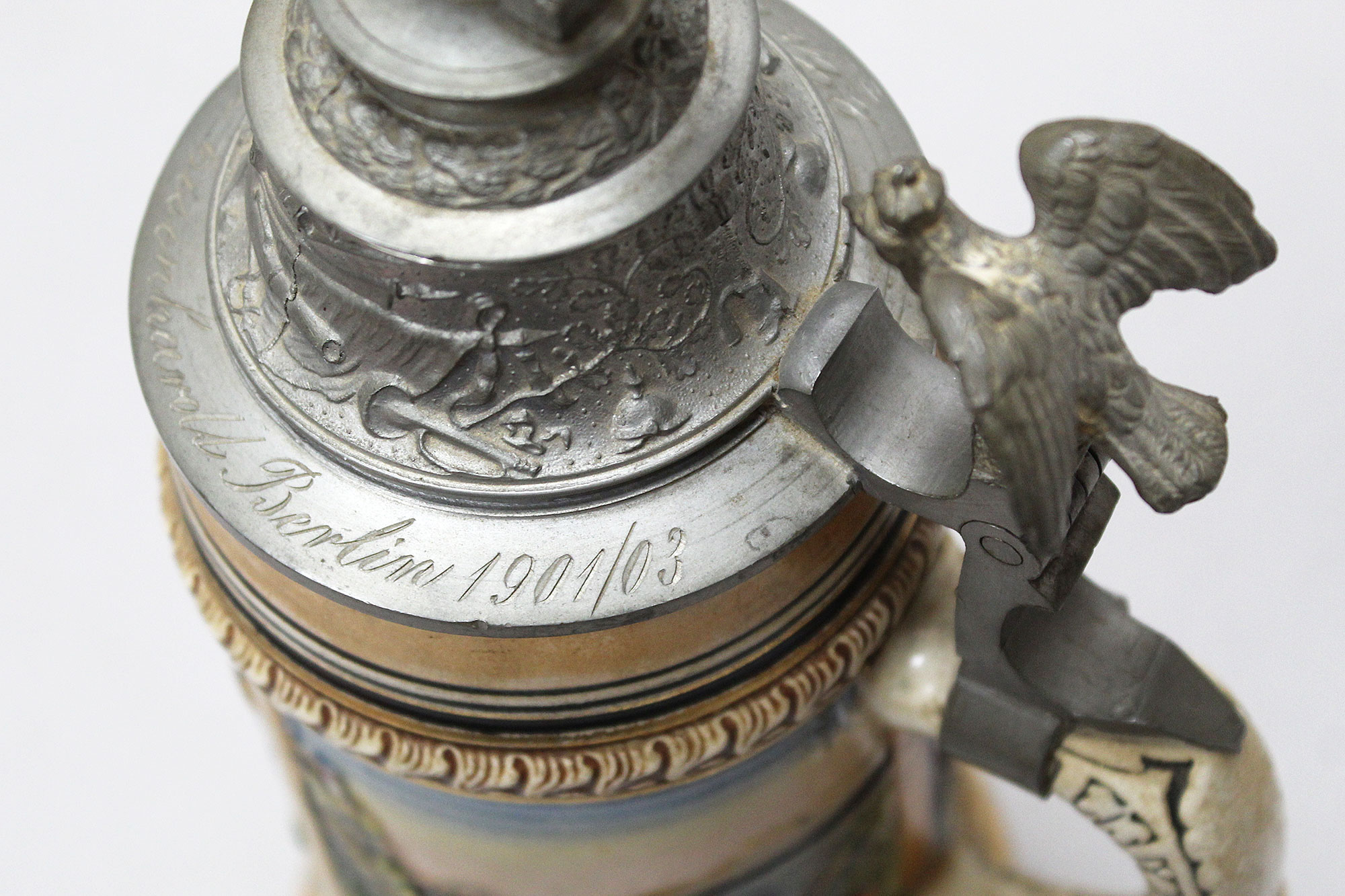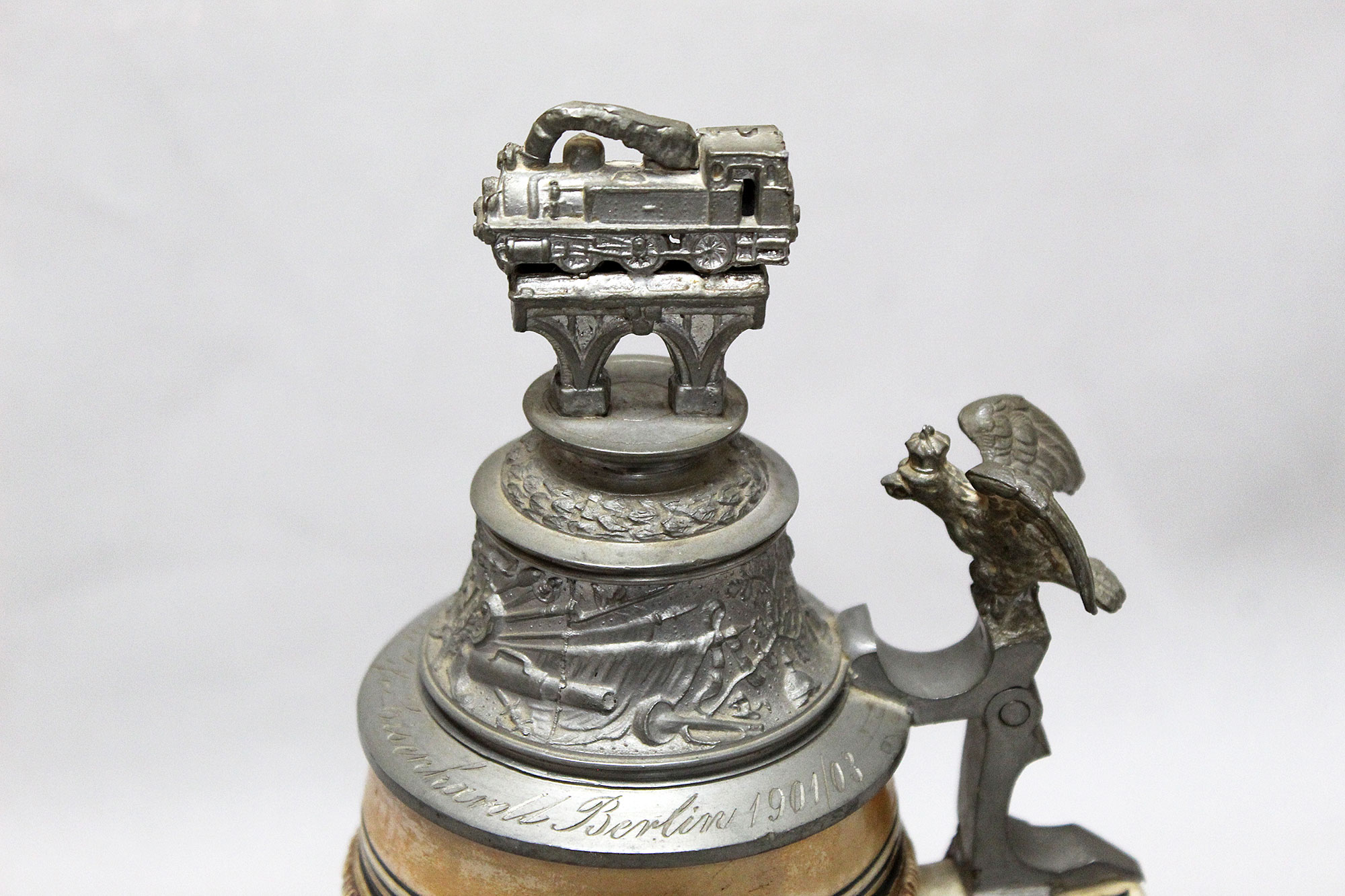 Imperial German Eisenbahn (Railroad) Stein. Damaged stein where the bottom portion broke in several pieces, and someone glued back together, however, not done very well. Named on around edge of top lid, however, hard to make our script. A portion appears to be to 2. Eisenb. Rgt. N III Berlin 1901/03 (pictured). Also, marker marked on bottom of stein. The lid bears a railroad engine and the thumb lift is a Garde unit type eagle, showing the fact that Eisenbahn troops were part of the elite Imperial Guard and charged with the duty of guarding and maintaining the railroad system within Germany. Height approximately 10 1/2 inches and width approximately 4 inches. Damaged condition.