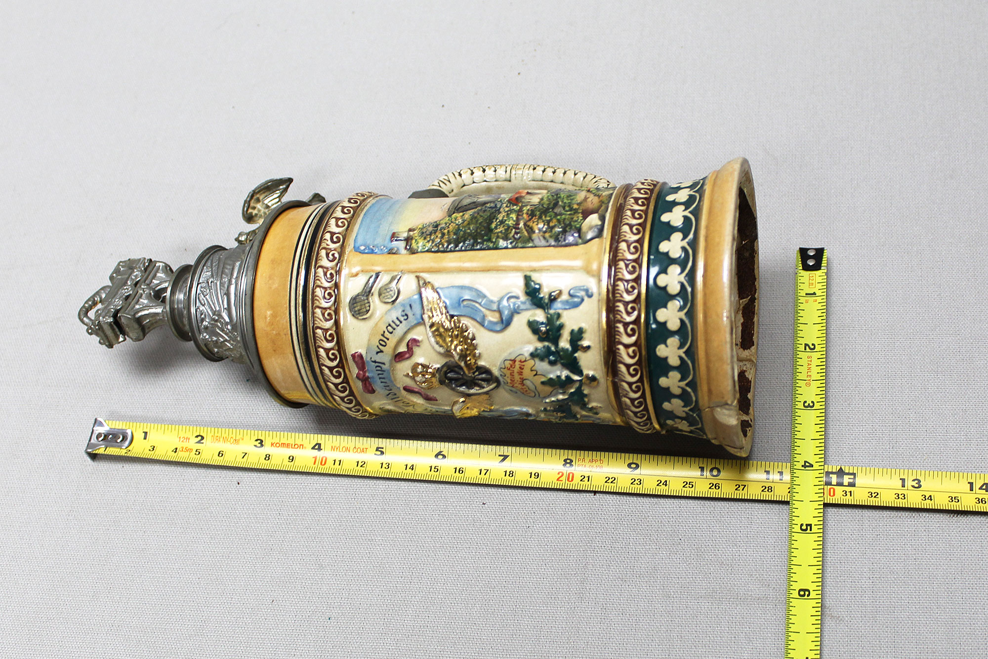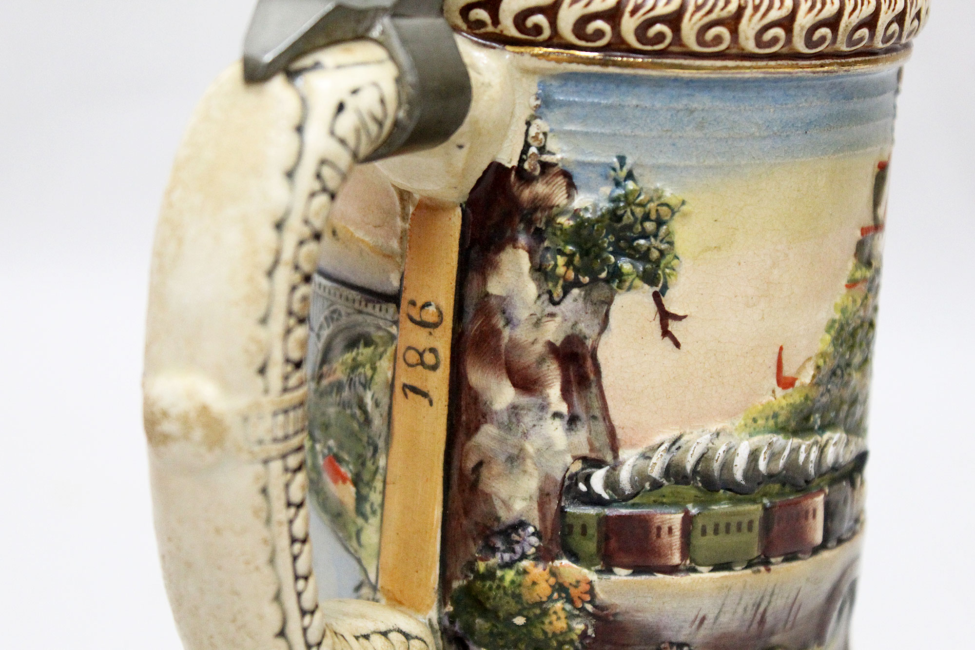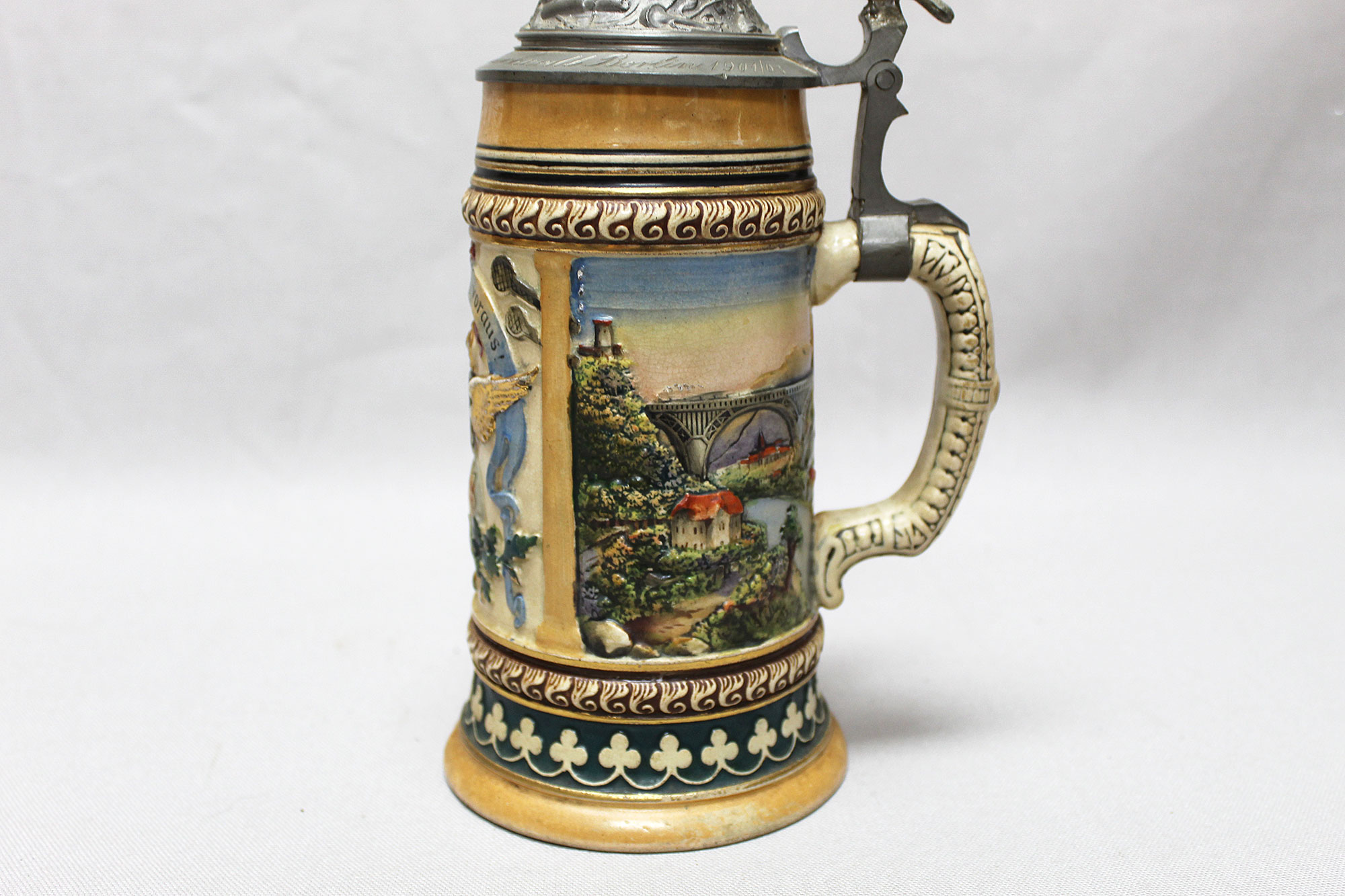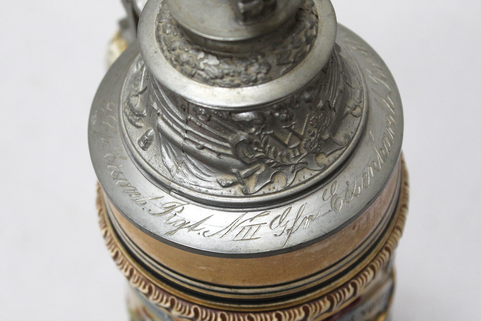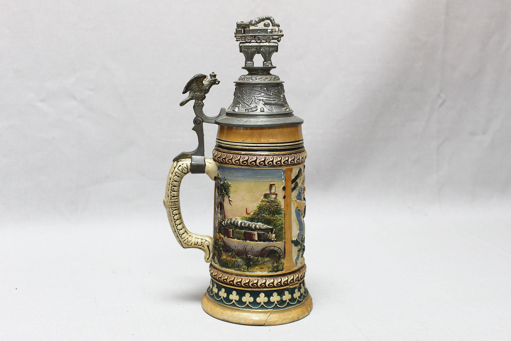 Imperial German Eisenbahn (Railroad) Stein. Damaged stein where the bottom portion broke in several pieces, and someone glued back together, however, not done very well. Named on around edge of top lid, however, hard to make our script. A portion appears to be to 2. Eisenb. Rgt. N III Berlin 1901/03 (pictured). Also, marker marked on bottom of stein. The lid bears a railroad engine and the thumb lift is a Garde unit type eagle, showing the fact that Eisenbahn troops were part of the elite Imperial Guard and charged with the duty of guarding and maintaining the railroad system within Germany. Height approximately 10 1/2 inches and width approximately 4 inches. Damaged condition.