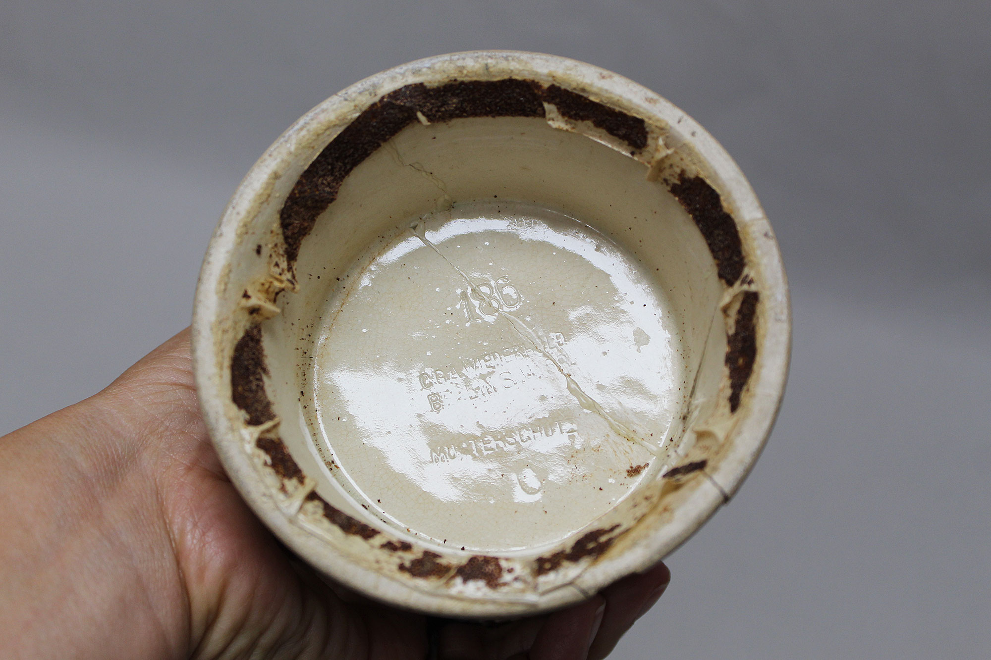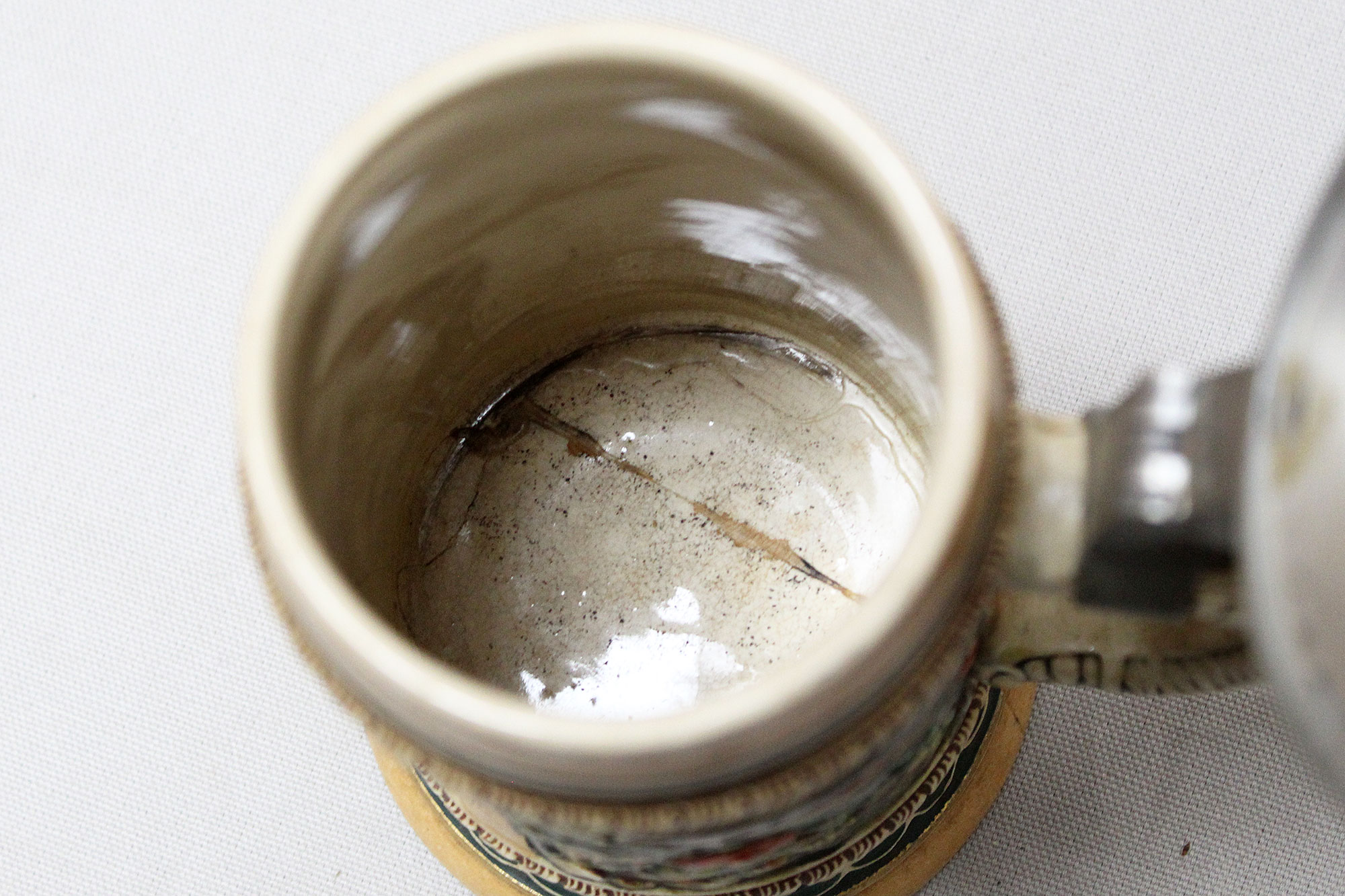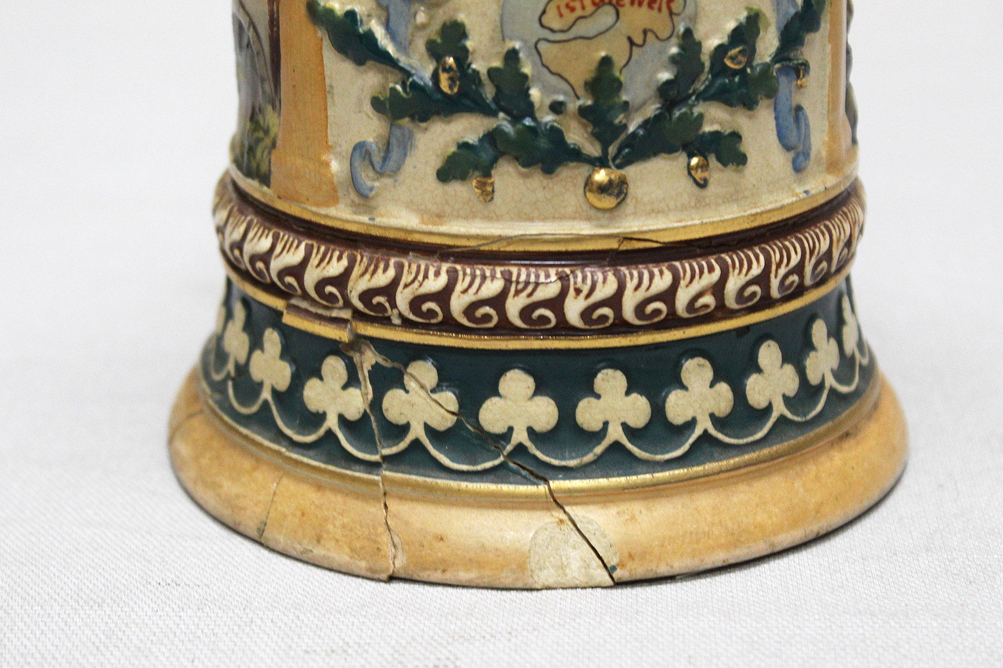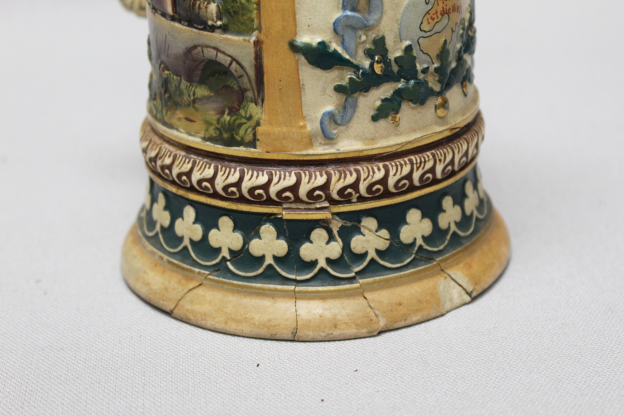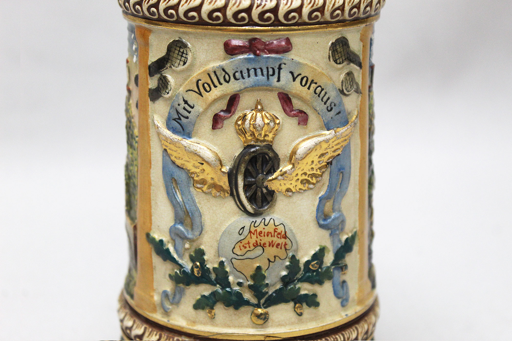 Imperial German Eisenbahn (Railroad) Stein. Damaged stein where the bottom portion broke in several pieces, and someone glued back together, however, not done very well. Named on around edge of top lid, however, hard to make our script. A portion appears to be to 2. Eisenb. Rgt. N III Berlin 1901/03 (pictured). Also, marker marked on bottom of stein. The lid bears a railroad engine and the thumb lift is a Garde unit type eagle, showing the fact that Eisenbahn troops were part of the elite Imperial Guard and charged with the duty of guarding and maintaining the railroad system within Germany. Height approximately 10 1/2 inches and width approximately 4 inches. Damaged condition.